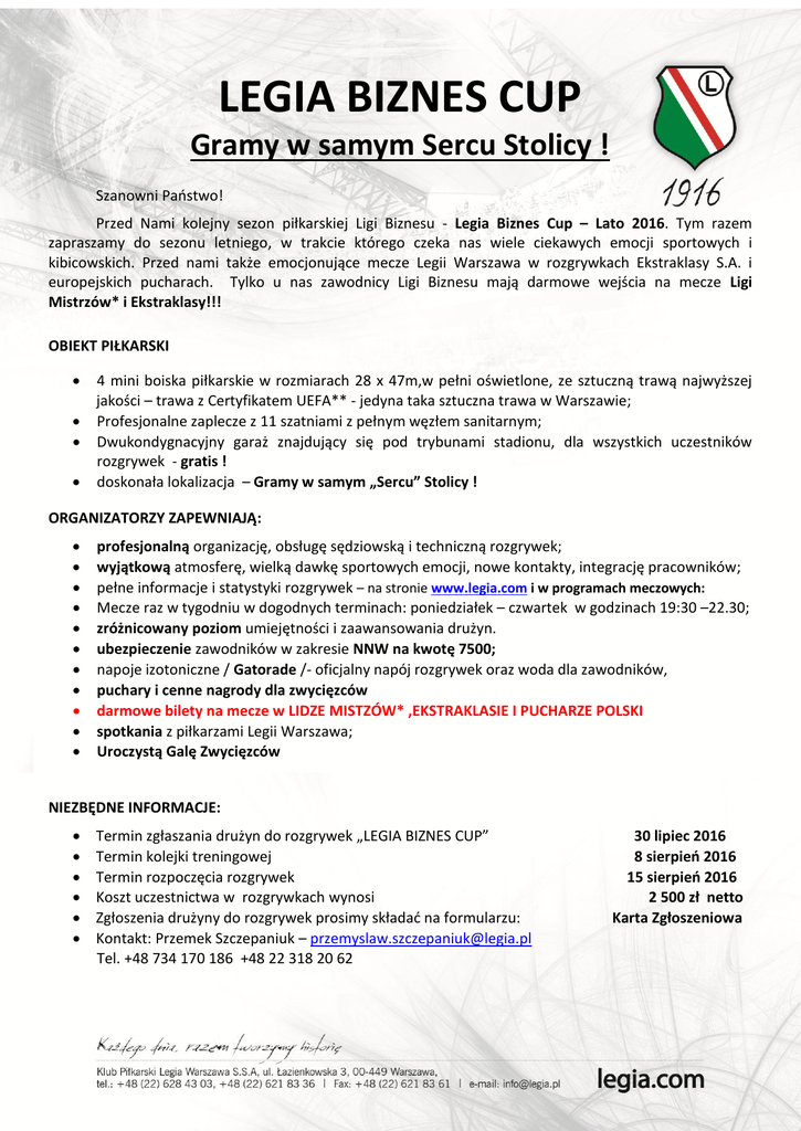 LEGIA BIZNES CUP Gramy w samym Sercu Stolicy ! Szanowni Państwo! Przed Nami kolejny sezon piłkarskiej Ligi Biznesu - Legia Biznes Cup – Lato 2016. Tym razem zapraszamy do sezonu letniego, w trakcie którego czeka nas wiele ciekawych emocji sportowych i kibicowskich. Przed nami także emocjonujące mecze Legii Warszawa w rozgrywkach Ekstraklasy S.A. i europejskich pucharach. Tylko u nas zawodnicy Ligi Biznesu mają darmowe wejścia na mecze Ligi Mistrzów* i Ekstraklasy!!! OBIEKT PIŁKARSKI 4 mini boiska piłkarskie w rozmiarach 28 x 47m,w pełni oświetlone, ze sztuczną trawą najwyższej jakości – trawa z Certyfikatem UEFA** - jedyna taka sztuczna trawa w Warszawie; Profesjonalne zaplecze z 11 szatniami z pełnym węzłem sanitarnym; Dwukondygnacyjny garaż znajdujący się pod trybunami stadionu, dla wszystkich uczestników rozgrywek - gratis ! doskonała lokalizacja – Gramy w samym „Sercu” Stolicy ! ORGANIZATORZY ZAPEWNIAJĄ: profesjonalną organizację, obsługę sędziowską i techniczną rozgrywek; wyjątkową atmosferę, wielką dawkę sportowych emocji, nowe kontakty, integrację pracowników; pełne informacje i statystyki rozgrywek – na stronie www.legia.com i w programach meczowych: Mecze raz w tygodniu w dogodnych terminach: poniedziałek – czwartek w godzinach 19:30 –22.30; zróżnicowany poziom umiejętności i zaawansowania drużyn. ubezpieczenie zawodników w zakresie NNW na kwotę 7500; napoje izotoniczne / Gatorade /- oficjalny napój rozgrywek oraz woda dla zawodników, puchary i cenne nagrody dla zwycięzców darmowe bilety na mecze w LIDZE MISTZÓW* ,EKSTRAKLASIE I PUCHARZE POLSKI spotkania z piłkarzami Legii Warszawa; Uroczystą Galę Zwycięzców NIEZBĘDNE INFORMACJE: Termin zgłaszania drużyn do rozgrywek „LEGIA BIZNES CUP” Termin kolejki treningowej Termin rozpoczęcia rozgrywek Koszt uczestnictwa w rozgrywkach wynosi Zgłoszenia drużyny do rozgrywek prosimy składać na formularzu: Kontakt: Przemek Szczepaniuk – [email protected] Tel. +48 734 170 186 +48 22 318 20 62 30 lipiec 2016 8 sierpień 2016 15 sierpień 2016 2 500 zł netto Karta Zgłoszeniowa
