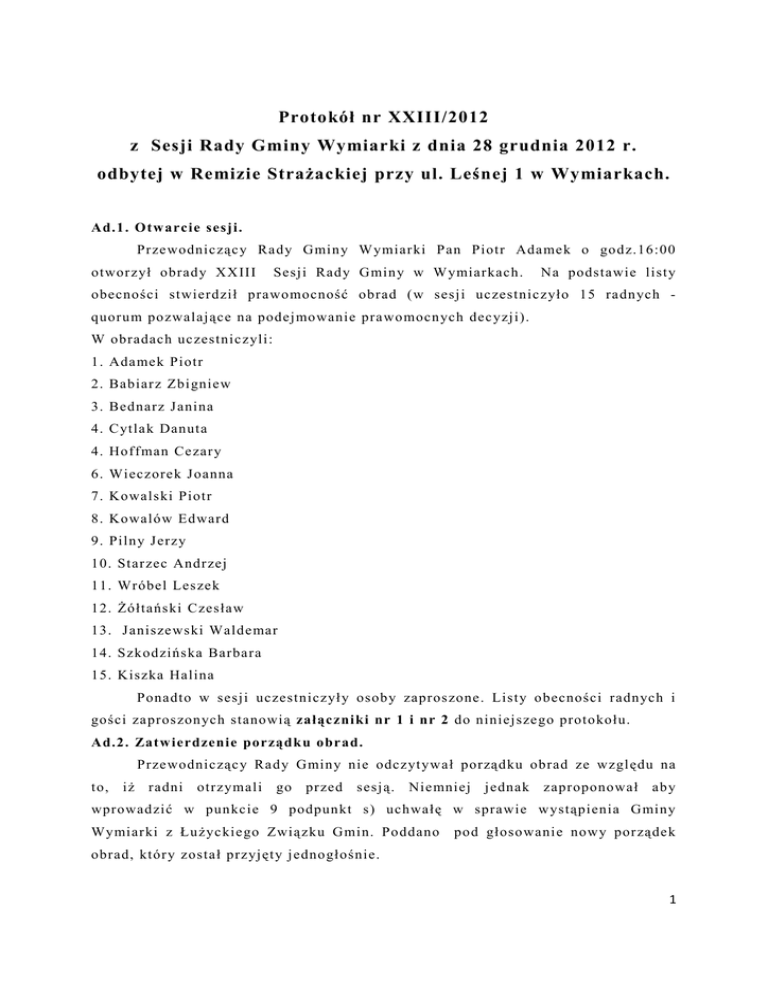 Protokół nr XXIII/2012 z Sesji Rady Gminy Wymiarki z dnia 28 grudnia 2012 r. odbytej w Remizie Strażackiej przy ul. Leśnej 1 w Wymiarkach. Ad.1. Otw arcie sesji. Przewodniczący Rady Gmi ny W ymiar ki Pan Piotr Adamek o godz.16:00 otwor zył obrady XX III Sesj i Rady Gminy w W ymiar kach. Na podstawie listy obecności stwierdził prawomocność obrad (w sesj i uczestniczyło 15 radnych quorum pozwalaj ące na podej mowanie prawomocnych decyzj i). W obradach uczestniczyli: 1. Adamek Piotr 2. Babiar z Zbi gniew 3. Bednarz J anina 4. Cytlak Danuta 4. Hoff man Cezar y 6. Wieczorek J oanna 7. Kowals ki Piotr 8. Kowalów Edward 9. Pilny J erzy 10. Star zec Andr zej 11. Wróbel Les zek 12. Żółtańs ki Czesław 13. J aniszews ki Waldemar 14. Szkodzińs ka Barbara 15. Kiszka Halina Ponadto w sesj i uczestniczył y osoby zapros zone. Listy obecności radnych i gości zapros zonych stanowią załączniki nr 1 i nr 2 do niniej szego protokołu. Ad.2. Zatw ierdzenie porządku obrad. Przewodniczący Rady Gminy nie odczyt ywał porządku obrad ze względu na to, iż radni otrzymali go pr zed sesj ą. Niemniej j ednak zaproponował aby wprowadzić w punkcie 9 podpunkt s) uchwałę w sprawie wystąpienia Gminy Wymiar ki z Łużyckiego Związku Gmin. Poddano pod głosowani e nowy por ządek obrad, któr y został przyj ęty j ednogłośnie. 1 Porządek obrad: 1. Otwarcie sesj i. 2. Zat wierdzenie por ządku obrad. 3. Zat wierdzenie protokołu z XXII sesj i. 4. Wnioski z posiedzeń komisj i stałych Rady Gmi ny W ymiar ki. 5. Interpelacj e i zapytani a radnych. 6. Odpowiedzi na interpelacj e i zapytania. 7. Infor macj e Przewodni czącego Rady o działaniach podej mowanych w okresie między sesj ami. 8. Sprawozdanie Wój ta Gmi ny W ymiar ki z dział ań podej mowanych w okresie pomiędzy sesj ami. 9. Podj ęcie uchwał w s prawie: a) regulami nu utr zymani a czystości i por ządku na terenie Gminy W ymiar ki b) wyboru metody ustalenia opłaty za gos podarowanie odpadami komunalnymi oraz ustalenia wysokości stawki tej opłaty c) terminu, częstotliwoś ci i trybu uiszczania opłaty za gospodarowanie odpadami komunalnymi d) szczegółowego spos obu i zakresu świadczenia usług w zakresie odbierania odpadów komunalnych od właścicieli nieruchomości i zagospodarowania tych odpadów e) wzoru deklaracj i o wys okości opłat y za gospodarowanie odpadami komunalnymi s kładanej przez właściciela nieruchomości f) ustanowienia pomni ka przyr ody – „J ednoręki” g) ustanowienia pomni ka przyr ody – „Bandyta” h) ustanowienia pomni ka przyr ody – „Pr zydrożny” i) ustanowienia pomni ka przyr ody – „Samotni k” j ) ustanowienia pomni ka przyr ody – „Dąb w uprawie” k) ustanowienia pomni ka przyr ody – „Pr zy ambonie” l) ustanowienia pomni ka przyr ody – „Pr zy siedzibie” m) ustanowienia pomni ka przyr ody – „Dąb narożny” n) ustalenia stawek podat ku od nieruchomości w Gminie W ymi ar ki o) zmiany uchwał y budżetowej na 2012 r. p) wydat ków zamies zczonych w budżecie Gminy W ymiar ki, któr ych niezreali zowane kwot y nie wygasaj ą z upł ywem roku budżetowego 2012 q) uchwalenia Wieloletniej Prognozy Finans owej Gminy W ymiar ki na lata 2013-2025 2 r) uchwał y budżetowej na 2013 r. s) wystąpienia Gminy W ymiar ki z Łużyckiego Związku Gmin w Żarach. 10.Wolne wnios ki i zapytania. 11.Zamknięcie obrad XXIII sesj i. Ad.3. Zatw ierdzenie protokołu z XXII sesj i. Przewodniczący Rady Gminy zapytał czy ktoś z Radnych wyznaczonych do zapoznania się z protokołem z popr zedniej sesj i chciałby wnieść do niego poprawki. Radny Les zek Wróbel i radna J oanna Wieczorek oznaj mili, i ż zapoznali się z protokołem i nie wnoszą uwag. Protokół uznano za pr zyj ęty . Do zapoznania się z protokołem z XX III s esj i wyznaczono radnego Czesława Żółtańskiego i radnego Zbigniewa Babiar za. Ad.4. Wnioski z posiedzeń komisji stałych Rady Gminy Wymiarki. Przewodniczący Rady Gminy poinfor mował zebranych, że dzień wcześniej , tj . 27 grudnia 2012 r. na Remi zie Strażacki ej w Wymiar kach o godz. 16:00 odbyło się wspólne posiedzenie komisj i stałych Rady W ymiar ki. Podczas zebrania wnios kowano o obni żenie opłaty za gospodarowanie odpadami komunalnymi oraz o wystąpienie z Łużyckiego Związku Gmi n. Skut kiem w/w wnios ków j est modyfi kacj a uchwały dotyczącej opłaty za gospodarowanie odpadami komunalnymi oraz wprowadzenie do porządku obrad nowej uchwały dot yczącej wystąpienia z Łużyckiego Związku Gmin. Ad.5. Interpelacje i zapytania radnych. Nie zgłos zono żadnej interpelacj i. Ad.6. Odpow iedzi na zapytania i interpelacje. W związku z t ym, że nie zgł os zono interpelacj i Przewodniczący Rady Gminy przes zedł do kolej nego punktu obrad. Ad.7. Inf ormacje Przew odniczącego Rady o działaniach podejm ow anych w okresie między sesjami. • 12 grudnia 2012 r. w Dzienni ku Ur zędowym Woj ewództwa Lubus kiego został y opubli kowane uchwał y dot yczące podatków, opłat y tar gowej oraz statutu Gminnego Ośrodka Kultury i Bibliot eki podj ęte na XXII sesj i; • 12 grudnia 2012 r. do Urzędu Gminy wpł ynęło zawiadomienie z Regionalnej Izby Obrachunkowej w Zielonej Gór ze o posiedzeniu kolegium w sprawie postępowania nadzorczego wobec uchwał y Nr XX II/120/2012 Rady Gmi ny Wymiar ki z dnia 30 listopada 2012 r. w sprawie ustalenia stawek podatku od nieruchomości w Gmi nie Wymiar ki. W g wst ępnej analizy uchwała naruszała prawo. 3 • 18 grudnia 2012 r. do Urzędu Gminy wpł ynęło wystąpienie pokont rolne Regionalnej Izby Obrachunkowej w Zielonej Gór ze. Dot yczyło one kompleksowej kontroli gospodar ki finansowej i zamówień publicznych w Gminie W ymiar ki za r ok 2011 i 2012. • 21 grudnia 2012 r. do Urzędu Gminy wpł ynęła Uchwała Nr 541/2012 Kolegium Regionalnej Izby Obrachunkowej w Zielonej Gór ze dot ycząca Uchwał y Nr XX II/120/ 2012 Rady Gminy W ymiar ki z dnia 30 listopada 2012
