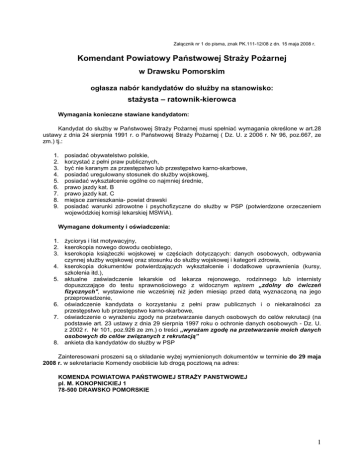 Załącznik nr 1 do pisma, znak PK.111-12/08 z dn. 15 maja 2008 r. Komendant Powiatowy Państwowej StraŜy PoŜarnej w Drawsku Pomorskim ogłasza nabór kandydatów do słuŜby na stanowisko: staŜysta – ratownik-kierowca Wymagania konieczne stawiane kandydatom: Kandydat do słuŜby w Państwowej StraŜy PoŜarnej musi spełniać wymagania określone w art.28 ustawy z dnia 24 sierpnia 1991 r. o Państwowej StraŜy PoŜarnej ( Dz. U. z 2006 r. Nr 96, poz.667, ze zm.) tj.: 1. 2. 3. 4. 5. 6. 7. 8. 9. posiadać obywatelstwo polskie, korzystać z pełni praw publicznych, być nie karanym za przestępstwo lub przestępstwo karno-skarbowe, posiadać uregulowany stosunek do słuŜby wojskowej, posiadać wykształcenie ogólne co najmniej średnie, prawo jazdy kat. B prawo jazdy kat. C miejsce zamieszkania- powiat drawski posiadać warunki zdrowotne i psychofizyczne do słuŜby w PSP (potwierdzone orzeczeniem wojewódzkiej komisji lekarskiej MSWiA). Wymagane dokumenty i oświadczenia: 1. Ŝyciorys i list motywacyjny, 2. kserokopia nowego dowodu osobistego, 3. kserokopia ksiąŜeczki wojskowej w częściach dotyczących: danych osobowych, odbywania czynnej słuŜby wojskowej oraz stosunku do słuŜby wojskowej i kategorii zdrowia, 4. kserokopia dokumentów potwierdzających wykształcenie i dodatkowe uprawnienia (kursy, szkolenia itd.), 5. aktualne zaświadczenie lekarskie od lekarza rejonowego, rodzinnego lub internisty dopuszczające do testu sprawnościowego z widocznym wpisem „zdolny do ćwiczeń fizycznych", wystawione nie wcześniej niŜ jeden miesiąc przed datą wyznaczoną na jego przeprowadzenie, 6. oświadczenie kandydata o korzystaniu z pełni praw publicznych i o niekaralności za przestępstwo lub przestępstwo karno-skarbowe, 7. oświadczenie o wyraŜeniu zgody na przetwarzanie danych osobowych do celów rekrutacji (na podstawie art. 23 ustawy z dnia 29 sierpnia 1997 roku o ochronie danych osobowych - Dz. U. z 2002 r. Nr 101, poz.926 ze zm.) o treści „wyraŜam zgodę na przetwarzanie moich danych osobowych do celów związanych z rekrutacją” 8. ankieta dla kandydatów do słuŜby w PSP Zainteresowani proszeni są o składanie wyŜej wymienionych dokumentów w terminie do 29 maja 2008 r. w sekretariacie Komendy osobiście lub drogą pocztową na adres: KOMENDA POWIATOWA PAŃSTWOWEJ STRAśY PANSTWOWEJ pl. M. KONOPNICKIEJ 1 78-500 DRAWSKO POMORSKIE 1 REKRUTACJA I POSTĘPOWANIE Rekrutację prowadzić będzie Komisja Kwalifikacyjna, powołana przez Komendanta Powiatowego PSP w Drawsku Pomorskim, która zweryfikuje zgodność złoŜonych ofert ze stawianymi wymaganiami, dokona oceny złoŜonych dokumentów za pomocą punktów gratyfikacyjnych, podda kandydatów ocenie sprawności fizycznej oraz przeprowadzi rozmowę kwalifikacyjną z kandydatami. Rekrutacja ma charakter 5 etapowy: I etap postępowania kwalifikacyjnego: weryfikacja złoŜonych ofert pod kątem stawianych wymagań oraz dokonanie oceny złoŜonych dokumentów za pomocą punktów gratyfikacyjnych. Z dalszego postępowania zostaną wyłączeni kandydaci, których oferty nie będą spełniały stawianych wymagań formalnych lub będą niekompletne. Wyniki kwalifikacji wstępnej zostaną opublikowane na stronie internetowej oraz tablicy ogłoszeń w siedzibie Komendy Powiatowej w terminie do 30 maja 2008 r. Oferty rozstrzygnięte negatywnie zostaną przekazane do archiwum tutejszej Komendy. Punktacja gratyfikująca posiadane uprawnienia i umiejętności jest następująca: Preferowane wymagania Liczba punktów Uprawnienia w zakresie prowadzenia pojazdów mechanicznych: - prawo jazdy kat. B 2 - prawo jazdy kat. C 4 - 2 prawo jazdy kat. E Uprawnienia do obsługi sprzętu silnikowego i poddozorowego stosowanego w PSP: - uprawnienia do obsługi agregatów prądotwórczych, podestów ruchomych 4 - 5 inne uprawnienia przydatne w PSP np. obsługa cięŜkiego sprzętu Kwalifikacje w zawodzie ratownik medyczny 5 Kwalifikacje i uprawnienia w zakresie ratownictwa wodnego, nurkowania i obsługi sprzętu pływającego: - ratownik WOPR 4 - sternik motorowodny, stermotorzysta 4 Wyszkolenie poŜarnicze oraz staŜ w jednostkach ochrony przeciwpoŜarowej: - udokumentowane członkostwo w OSP członka czynnego powyŜej 3 lat 3 - udokumentowane szkolenia wg wymagań dla czynnych członków OSP 3 - udokumentowany udział w zawodach poŜarniczych OSP 3 - odbycie zastępczej słuŜby wojskowej w jednostkach PSP 0-10 Poziom i profil wykształcenia - wykształcenie średnie techniczne: - zdany egzamin maturalny 3 4 2 - wykształcenie wyŜsze o kierunku przydatnym w PSP: 0-5 - udokumentowana znajomość języka obcego 0-5 - miejsce zamieszkania- powiat drawski 0-3 II etap postępowania kwalifikacyjnego: poddanie kandydatów ocenie sprawności fizycznej obejmującej: 1. próbę wydolnościową, 2. test sprawności fizycznej bieg na 1000 m, bieg na 50 m, podciąganie się na drąŜku Do oceny sprawności fizycznej przystąpią kandydaci zakwalifikowani w I etapie. Kandydat przystępujący do oceny sprawności fizycznej powinien posiadać dowód osobisty, strój i obuwie sportowe. Ocena sprawności fizycznej przeprowadzona zostanie zgodnie z Rozporządzeniem Ministra Spraw Wewnętrznych i Administracji z dnia 27 października 2005 r. w sprawie zakresu, trybu i częstotliwości przeprowadzania okresowych profilaktycznych badań lekarskich oraz okresowej oceny sprawności fizycznej straŜaka Państwowej StraŜy PoŜarnej (Dz. U. Nr 261 poz. 2191). Do punktacji nie uwzględnia się punktów preferencyjnych z tytułu wieku. Ocena sprawności fizycznej: 1. Próba wydolnościowa – metoda harwardzka Kandydaci przystępujący do próby wydolnościowej metodą harwardzką winni stawić się w siedzibie Komendy Powiatowej PSP w Drawsku Pom. w dniu 2 czerwca 2008 r. o godzinie 9.00. Próba wydolnościowa, jest to zmodyfikowana metoda harwardzka polegająca na wejściu na stopień o wysokości 40 cm dla męŜczyzn, w tempie 30 razy w ciągu 1 minuty. Czas tr