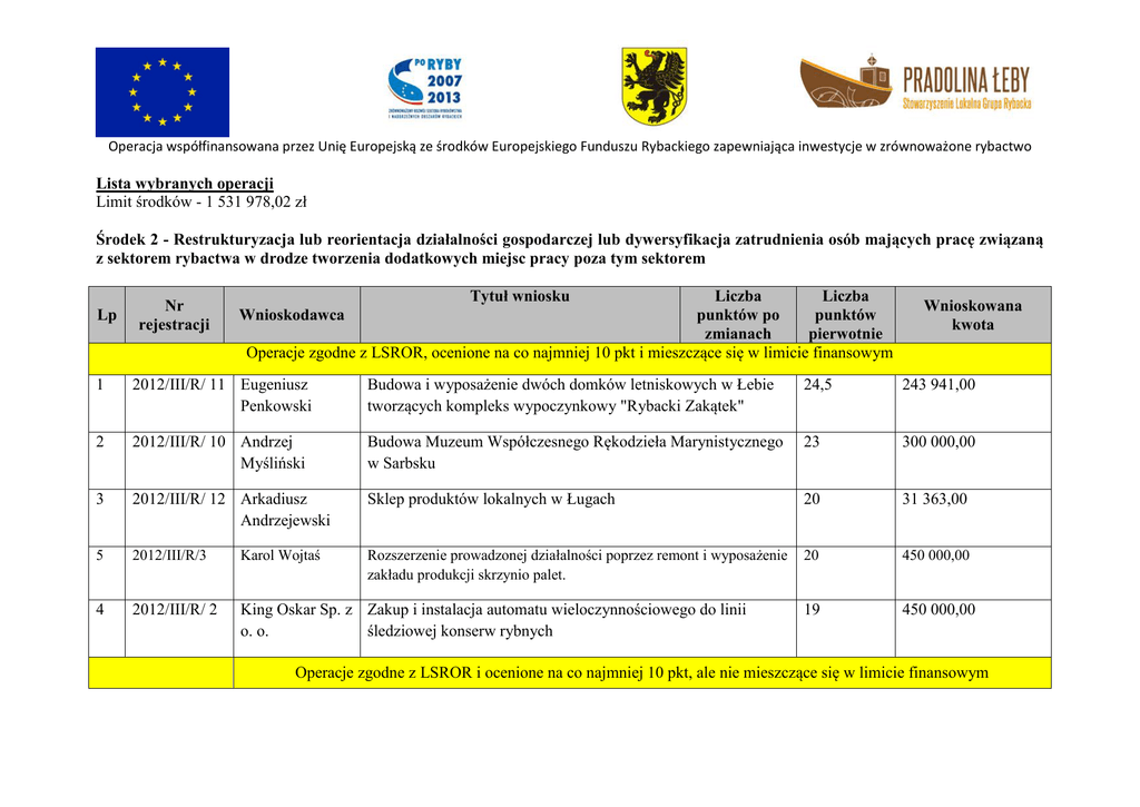 Operacja współfinansowana przez Unię Europejską ze środków Europejskiego Funduszu Rybackiego zapewniająca inwestycje w zrównoważone rybactwo Lista wybranych operacji Limit środków - 1 531 978,02 zł Środek 2 - Restrukturyzacja lub reorientacja działalności gospodarczej lub dywersyfikacja zatrudnienia osób mających pracę związaną z sektorem rybactwa w drodze tworzenia dodatkowych miejsc pracy poza tym sektorem Lp Nr rejestracji Tytuł wniosku Liczba Liczba Wnioskodawca punktów po punktów zmianach pierwotnie Operacje zgodne z LSROR, ocenione na co najmniej 10 pkt i mieszczące się w limicie finansowym Wnioskowana kwota 1 2012/III/R/ 11 Eugeniusz Penkowski Budowa i wyposażenie dwóch domków letniskowych w Łebie tworzących kompleks wypoczynkowy "Rybacki Zakątek" 24,5 243 941,00 2 2012/III/R/ 10 Andrzej Myśliński Budowa Muzeum Współczesnego Rękodzieła Marynistycznego w Sarbsku 23 300 000,00 3 2012/III/R/ 12 Arkadiusz Andrzejewski Sklep produktów lokalnych w Ługach 20 31 363,00 5 2012/III/R/3 Karol Wojtaś Rozszerzenie prowadzonej działalności poprzez remont i wyposażenie zakładu produkcji skrzynio palet. 20 450 000,00 4 2012/III/R/ 2 King Oskar Sp. z Zakup i instalacja automatu wieloczynnościowego do linii o. o. śledziowej konserw rybnych 19 450 000,00 Operacje zgodne z LSROR i ocenione na co najmniej 10 pkt, ale nie mieszczące się w limicie finansowym Operacja współfinansowana przez Unię Europejską ze środków Europejskiego Funduszu Rybackiego zapewniająca inwestycje w zrównoważone rybactwo 5 2012/III/R/ 8 Cygnus Sp. Z o.o. Rejsy turystyczno wędkarskie po Bałtyku z przygotowaniem potraw rybnych na pełnym morzu 19 450 000,00 6 2012/III/R/ 4 Karol Drzazgowski Rozbudowa infrastruktury hodowlano-przetwórczej produkcji ryb słodkowodnych z wykorzystaniem istniejącego stawu w Charbrowie 18 355 000,00 7 2012/III/R/ 9 GOTIS Gniewino Przebudowa i remont obiektów, na których jest prowadzona działalność gospodarcza wraz z zakupem wyposażenia 17 450 000,00 8 2012/III/R/ 13 Arkadiusz Andrzejewski Budowa infrastruktury związanej z hodowlą szkoleniem koni oraz rozwojem jeździectwa i turystyki konnej w Gniewinie 16 450 000,00