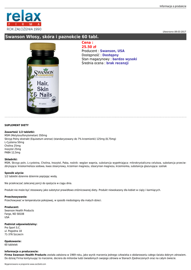 Informacje o produkcie Utworzono 08-03-2017 Swanson Włosy, skóra i paznokcie 60 tabl. Cena : 25.50 zł Producent : Swanson, USA Dostępność : Dostępny Stan magazynowy : bardzo wysoki Średnia ocena : brak recenzji SUPLEMENT DIETY Zawartość 1/2 tabletki: MSM (Metylosulfonylometan) 350mg Skrzyp Polny ekstrakt (Equisetum arense) (standaryzowany do 7% krzemionki) 125mg (8,75mg) L-Cysteina 50mg Cholina 25mg Inozytol 25mg PABA 12,5mg Składniki: MSM, Skrzyp poln, L-cysteina, Cholina, Inozytol, Paba, nośnik: węglan wapnia, substancja wypełniająca: mikrokrystaliczna celuloza, substancja przeciwzbrylująca: kroskarmeloza sodowa, kwas stearynowy, krzemian magnezu, stearynian magnezu, krzemionka, substancja glazurująca: szeliak Sposób użycia: 1/2 tabletki dziennie dziennie popijając wodą. Nie przekraczać zalecanej porcji do spożycia w ciągu dnia. Produkt nie może być stosowany jako substytut prawidłowo zróżnicowanej diety. Produkt niewskazany dla kobiet w ciąży i karmiących. Przechowywanie: Przechowywać w temperaturze pokojowej, w sposób niedostępny dla małych dzieci. Producent: Swanson Health Products Fargo, ND 58108 USA Podmiot odpowiedzialny: Pro Sport S.C. ul. Pogodna 18 71-376 Szczecin Opakowanie: 60 tabletek Informacje o producencie: Firma Swanson Health Products została założona w 1969 roku, jako wynik marzenia jednego człowieka o obdarowaniu całego świata dobrym zdrowiem. Do dzisiaj Firma kontynuując to marzenie, dociera do milionów ludzi świadomych swojego zdrowia w Stanach Zjednoczonych oraz na całym świecie. Wygenerowano w programie www.oscGold.com Swanson Health Products jest dumne ze swoich produktów i robi wszystko aby klienci byli w pełni zadowoleni. Te działania są czynione od początku istnienia firmy i przyniosły jej wiele splendoru oraz rzesze stałych, powracających klientów. Firma Swanson Health Products stara się aby: Cena produktu była możliwie najniższa. Czystość i Skuteczność była na jak najwyższym poziomie. Od kiedy firma szczyci się certyfikatem Dobrej Praktyki Wytwarzania (GMP) składniki są testowane na różnych etapach całego procesu produkcji w celu sprawdzenia czystości i mocy a gotowe produkty są badane przez niezależne laboratoria w celu potwierdzenia że, to co na etykiecie to jest w produkcie.