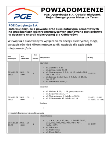 POWIADOMIENIE PGE Dystrybucja S.A. Oddział Białystok Rejon Energetyczny Białystok Teren Informujemy, że z powodu prac eksploatacyjno-remontowych na urządzeniach elektroenergetycznych planowana jest przerwa w dostawie energii elektrycznej dla Odbiorców: W związku z planowanymi wyłączeniami energii elektrycznej mogą wystąpić również kilkuminutowe zaniki napięcia dla sąsiednich miejscowości/ulic. Czas Data rozpoczęcia Data zakończenia przerwy Miejscowości Nr stacji Białystok 2016.11.28 2016.11.28 08:00 14:00 6 • • • • • ul. Zielona 4, 6, 6a ul. Zabłudowska 86, 88 ul. Matematyczna 5, 7, 8, 10, 12, działka 28/8 11-1158 zas. z ZK-7419 ul. Kolonia Dojlidy 1, 3, 4, 5, 6, 8, 12, 14, 15, 20, 22, 33 ul. Michałowe Pole 4, 8 Białystok 2016.11.28 2016.11.28 08:00 10:00 2 • • • • ul. Gminna 4, 10, 11, 14, przepompownia ul. Logarytmiczna 7, 17 ul. Matematyczna 1, działka nr 28/16 ul. Zabłudowska 95, działka nr 116 11-482, 11-561, 11-1595, 11-1630 Kuriany • wystąpią kilkuminutowe zaniki napięcia Międzyrzecze • 2016.11.28 2016.11.28 08:00 10:00 2 • • • 1, 2, 3, 4, 5, 6 ,8, 10, 10a, 12, działki: 70/15, 25/2, 80/2, 80/6, 90/2, 90/6, 90/7, 90/11, 90/26, 557/3 ul. Młynowa ul. Nadrzeczna ul. Kozia Górka 11-1100 • • • ul. Modrzewiowa ul. Świerkowa ul. Brzozowa Woronicze • 1, 2, 3, 4, działki: 94/1, 245 Ruda 2016.11.28 2016.11.28 08:00 10:00 2 • od 1 do 59, 77, 90a, 113b, 118a, 174, 174a, działki nr: 226, 365/5, 378, 628 11-816 Krynki 2016.11.28 2016.11.28 08:00 18:00 10 • Oczyszczalnia ścieków 07-133 Białystok • 2016.11.28 2016.11.28 08:00 11:00 3 ul. Halicka 56, dziiałki nr: 85/34, 85/38 Halickie • 11-1448 66G Zabiele 2016.11.28 2016.11.28 08:00 10:00 2 • od 29 do 111, zlewnia mleka, BIOM, sklep spożywczy 11-143 Dryga-Kolonia • 2016.11.28 2016.11.28 08:00 17:00 9 3, 4, 5, 6, 7, 8, 9, 10, 11, 12 Nowe Stojło • 07-635 13, 15, 16 Studzianki • • 2016.11.28 2016.11.28 11:00 13:00 2 • • • • • • ul. Malinowa 2, 4, 5, 6, 7, 9, 10, 11, 13, 14, 18, 19, 20, 21, 22, 25, 26, 27, 28, 29, 30, 31, 33, 34 ul. Podgórna 1, 2, 4, 5, 6, 7, 8, 9, 11, 12, 14, 16, 18, 19, 20, 21, 22, 23, 24, 26, 28, 32 działki: 2193, 2132, 2127/2, 2213, 2145, 11-510 2212, 2231, 2133, 609/34, 2176 ul. Podleśna 2, 3, 5, 7, 11 ,12, 13, 14, 18, 20, 22, 26, 28, działka 2259 ul. Supraślska 22 ul. Sosnowa 1, 4, 7 ul. Wrzosowa 1, 40, działka 2253 ul. Brzozowa 1, 2, 3, 6, 7, 8, 9, 10, 11, 15, 16 • • ul. Modrzewiowa 1, 3, 26, działka 2135 ul. Konwaliowa 2, działka 2185 Zapieczki • 6 Krypno Wielkie • 2016.11.28 2016.11.28 11:00 13:00 2 od 1 do 22, 140, 141 Krypno Kościelne • 11-334 od 1 do 29 Karpowicze 2016.11.28 2016.11.28 11:00 13:00 2 • od 1 do 51 07-993 Studzianki • 2016.11.28 2016.11.28 13:30 15:30 2 • • • • • • ul. Supraślska 2, 5, 6, 8, 8/2, 9, 11, 12, 12a, 14, 15, 16, 17, 19, 19a, 20, 23, 24, 26, 26/1, 27, 28, 29, 30, 32, 34, 35, 36, 37, 38, 39, 40, 41, 44, 46, 48, 50, 51, 53 ul. Zaciszna 1, 6 ul. Krzywa 2, 4, 13 ul. Warszawska 1, 3 ul. Polonijna 5, 6, 8, 9, 10, 11, 12, 16, 19, 21 ul. Łącznikowa 2, 3, 5, 6, 7, 9, 13, 14 działka 717 przepompownia ścieków 11-892 Jatwieź Duża 2016.11.28 2016.11.28 13:30 15:30 2 • od 1 do 51, Mlekpol Grajewo 07-138 Krypno Kościelne 2016.11.28 2016.11.28 14:00 16:00 2 • od 30 do 68 11-147 Zawady • 2016.11.29 2016.11.29 08:00 11:00 3 kolonie od nr 28 do 43 Zaczerlany • 06-106, 06-539 kolonie od nr 26 do 29 Gajowniki 2016.11.29 2016.11.29 08:00 15:00 7 • Zaczerlany 06-105, 06-107, 06-108, 06-858 • od 9 do 25 i od 32 do 40 Zagruszany 2016.11.29 2016.11.29 08:00 10:00 2 • cała miejscowośc oprócz numeru 48 i działki 11-14 nr 229/1 Knyszyn 2016.11.29 2016.11.29 08:00 10:00 2 • • ul. Rynek od 1 do 7 ul. Szkolna od 1 do 31, Biedronka 11-1035 Suchowola 2016.11.29 2016.11.29 08:00 10:00 2 • • • • ul. Goniądzka od 1 do 35 ul. Białostocka 2, 10b, 26 ul. Nowozielona od 1 do 4, 7 Zakład Masarniczy Cymes, ZOZ, hydrofornia, Muzułmańska Gmina Wyznaniowa 07-462 Krynki 2016.11.29 2016.11.29 08:00 18:00 10 • ul. Graniczna od 25 do 59 i od 22 do 42, przepompownia ścieków 07-1108, 07-1177 Zabłudów 2016.11.29 2016.11.29 11:00 13:00 • • • 2 • • • ul. Ostaszewskiego Kazimierza ul. Radziwiłłowska ul. Chodkiewicza Grzegorza 31, 33, 34, 35, 36, 37, 38, 39, 40, 41, 44, 46, 48, 50, 52, 54 11-864 ul. Sapiehów ul. Drukarzy Zabłudowskich ul. Karpińskiego Franciszka cała ulica oprócz numeru 7 i działki 1627/7 Jaświły 2016.11.29 2016.11.29 11:00 13:00 2 • od 1 do 67, Przychodnia Lekarska, Gminny Ośrodek Kultury 11-183 Suchowola 2016.11.29 2016.11.29 11:00 13:00 2 • • • • • ul. Kupiecka od 1 do 42 pl. Plac Kościuszki 23, 24 ul. Staszica Stanisława 2, 4, 6, 8, 10, 12, 14 ul. Szkolna od 1 do 4, 11, 13, 15, 17 Szkoła Podstawowa, Przedsiębiorstwo Usługowo-Handlowe, Wirkowski-AUTO, Hurtownia PLAMS, Spółdzielnia 07-977 Samopomoc Chłopska, ZUH Mechanik Zwierki • 2016.11.29 2016.11.29 13:30 15:30 2 1/3, 1/4a, 3/2, 10, 11, 11a, 12, 13, 14, 15, 17, 18, 18a, 19, 20, 22, 23, 24, 24a, 25, 25a, 27, 11-806 28, 28a, 29, 30, 31, 32, 34, 36, 37, 38, 38a, 39, 40, 40a, 41a, 42, 43, 45, 45a, 47a, działki nr: 225/1, 225/2 Suchowola 2016.11.29 2016.11.29 13:30 15:30 2 • • • • • ul. Maja 3 3, 5, 7, 9, 31, 33 ul. Augustowska 1, 2 ul. Kupiecka 3 pl. Plac Kościuszki od 1 do 5, 12, od 15 do 31, działka 529/6 Zespół Szkół, Poczta, Kościół, Orange, Biebrzańska Fundacja, Suchowola Baza GS 07-306 Knyszyn 2016.11.29 2016.11.29 14:00 16:00 2 • ul. Białostocka od 1 do 63, zespół szkół, przedszkole 11-714 Łozowo 2016.11.30 2016.11.30 08:00 14:30 6 • od 54 do 61 07-538 Wroczyńszczyzna 2016.11.30 2016.11.30 08:00 14:30 6 • 10, 49, 50 07-593 Grzebienie 2016.11.30 2016.11.30 08:00 14:30 6 • 85, 88, 89, 90 07-389 Kamienna Nowa 2016.11.30 2016.11.30 08:00 14:30 6 • 18 07-1137 Nowa Wieś 2016.11.30 2016.11.30 08:00 10:00 2 • od