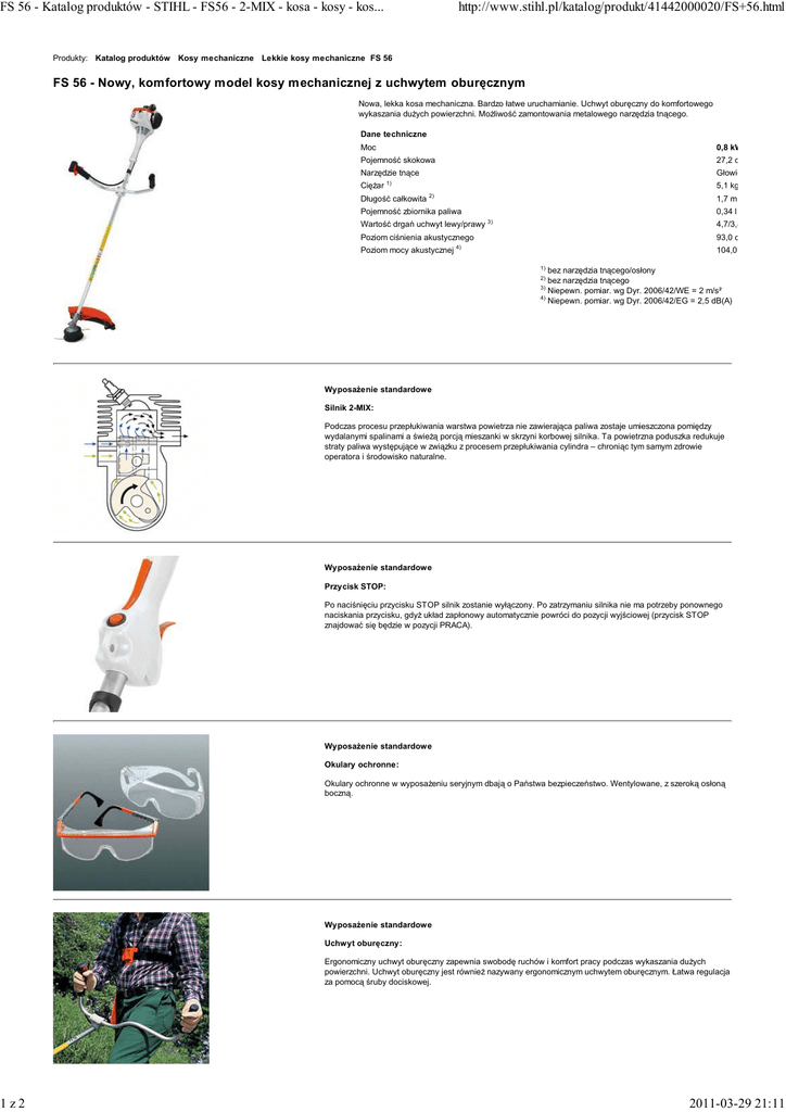 FS 56 - Katalog produktów - STIHL - FS56 - 2-MIX - kosa - kosy - kos... 1z2 http://www.stihl.pl/katalog/produkt/41442000020/FS+56.html Produkty: Katalog produktów Kosy mechaniczne Lekkie kosy mechaniczne FS 56 FS 56 - Nowy, komfortowy model kosy mechanicznej z uchwytem oburęcznym Nowa, lekka kosa mechaniczna. Bardzo łatwe uruchamianie. Uchwyt oburęczny do komfortowego wykaszania dużych powierzchni. Możliwość zamontowania metalowego narzędzia tnącego. Dane techniczne Moc 0,8 kW Pojemność skokowa 27,2 c Narzędzie tnące Głowic Ciężar 1) 5,1 kg Długość całkowita 2) 1,7 m Pojemność zbiornika paliwa 0,34 l Wartość drgań uchwyt lewy/prawy 3) 4,7/3,8 Poziom ciśnienia akustycznego 93,0 d Poziom mocy akustycznej 4) 104,0 1) bez narzędzia tnącego/osłony bez narzędzia tnącego Niepewn. pomiar. wg Dyr. 2006/42/WE = 2 m/s² 4) Niepewn. pomiar. wg Dyr. 2006/42/EG = 2,5 dB(A) 2) 3) Wyposażenie standardowe Silnik 2-MIX: Podczas procesu przepłukiwania warstwa powietrza nie zawierająca paliwa zostaje umieszczona pomiędzy wydalanymi spalinami a świeżą porcją mieszanki w skrzyni korbowej silnika. Ta powietrzna poduszka redukuje straty paliwa występujące w związku z procesem przepłukiwania cylindra – chroniąc tym samym zdrowie operatora i środowisko naturalne. Wyposażenie standardowe Przycisk STOP: Po naciśnięciu przycisku STOP silnik zostanie wyłączony. Po zatrzymaniu silnika nie ma potrzeby ponownego naciskania przycisku, gdyż układ zapłonowy automatycznie powróci do pozycji wyjściowej (przycisk STOP znajdować się będzie w pozycji PRACA). Wyposażenie standardowe Okulary ochronne: Okulary ochronne w wyposażeniu seryjnym dbają o Państwa bezpieczeństwo. Wentylowane, z szeroką osłoną boczną. Wyposażenie standardowe Uchwyt oburęczny: Ergonomiczny uchwyt oburęczny zapewnia swobodę ruchów i komfort pracy podczas wykaszania dużych powierzchni. Uchwyt oburęczny jest również nazywany ergonomicznym uchwytem oburęcznym. Łatwa regulacja za pomocą śruby dociskowej. 2011-03-29 21:11 FS 56 - Katalog produktów - STIHL - FS56 - 2-MIX - kosa - kosy - kos... 2z2 http://www.stihl.pl/katalog/produkt/41442000020/FS+56.html Wyposażenie standardowe Ręczna pompa paliwowa: Ręczna pompa paliwowa umożliwia doprowadzenie paliwa do gaźnika poprzez naciśnięcie przycisku. Dzięki temu zredukowano liczbę pociągnięć linki rozrusznika potrzebną do uruchomienia urządzenia po dłuższym przestoju. Wyposażenie dodatkowe Pas nośny/System nośny: Pasy nośne STIHL z miękką wyściółką znacznie ułatwiają pracę, szczególnie podczas długotrwałych zastosowań. Pasy zapewniają dużą swobodę ruchów oraz gwarantują komfortową i bezpieczną pracę. Wyposażenie dodatkowe STIHL ErgoStart (E): Jeszcze łatwiejsze uruchamianie. W nowym systemie STIHL ErgoStart pomiędzy rolką linki rozruchowej a wałem korbowym umieszczono dodatkową sprężynę naprężaną proporcjonalnie do ciśnienia sprężania na tłoku. Jeśli siła naprężenia sprężyny jest większa niż ciśnienie sprężania, to wał korbowy obraca się, powodując uruchomienie silnika. Użytkownik uruchamia urządzenie wygodnie bez szarpnięć. Wyrób FS 56 999,00 zł * * Sugerowana cena detaliczna brutto Nie możemy wykluczyć, że niektóre z przedstawionych produktów będą niedostępne w danym kraju lub będą różniły się wyposażeniem. Zastrzega się możliwość wprowadzania zmian technicznych. Autoryzowany Dealer STIHL chętnie Państwu doradzi. ©2003 Andreas STIHL AG & Co., Waiblingen 2011-03-29 21:11