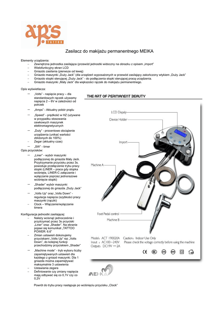 Zasilacz do makijażu permanentnego MEIKA Elementy urządzenia: − Zewnętrzna jednostka zasilająca (przewód jednostki widoczny na obrazku z opisem „import” − Wielofunkcyjny ekran LCD − Gniazdo zasilania (pierwsze od lewej) − Gniazdo maszynki „Duży Jack” (dla urządzeń wyposażonych w przewód zasilający zakończony wtykiem „Duży Jack” − Gniazdo stopki sterującej „Duży Jack” - do podłączenia stopki sterującej pracą urządzenia. − Gniazdo maszynki „Mały Jack” dla większości rączek do makijażu permanentnego. Opis wyświetlacza: − − − − − „Volts” - napięcie pracy – dla standardowych rączek używamy napięcia 2 – 6V w zależności od potrzeb „Amps” - Aktualny pobór prądu „Speed” - prędkość w HZ (używane w przypadku stosowania cewkowych maszynek elektromagnetycznych „Duty” - procentowe obciążenie urządzenia (unikać wartości zbliżonych do 100%) Zegar (aktualny czas) − „SW” - timer Opis przycisków: − − − − „Liner” - wybór maszynki podłączonej do gniazda Mały Jack. Przytrzymanie przycisku przez 3s. powoduje przełączenie trybu pracy stopki (LINER – praca gdy stopka wciśnięta, LINER-C załączanie i wyłączanie poprzez jednorazowe wciśnięcie stopki) „Shader” wybór maszynki podłączonej do gniazda „Duży Jack” „Volts Up” oraz „Volts Down” regulacja napięcia (szybkości pracy maszynki (rączki) Clock – Włączanie/wyłączanie timera Konfiguracja jednostki zasilającej: − Należy wcisnąć jednocześnie i przytrzymać przez 3s przyciski „Liner” oraz „Shader”. Na ekranie pojawi się komunikat „TATTOO POWER: 6.6” − Zmian ustawień dokonujemy przyciskami „Volts Up” raz „Volts Down”, do kolejnej funkcji przechodzimy przyciskiem „Shader” − − − „Machine mode” - tryb wyboru liczby zapamiętywanych ustawień dla każdego z gniazd maszynki. Dla 1 gniazda można zapamiętywać maksymalnie 3 ustawienia Ustawiania zegara Definiowanie czy zmiany napięcia mają odbywać się co 0,1V czy co 0,2V Powrót do trybu pracy następuje po wciśnięciu przycisku „Clock”