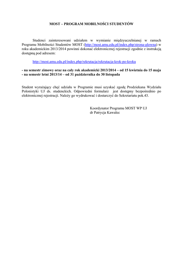 MOST – PROGRAM MOBILNOŚCI STUDENTÓW Studenci zainteresowani udziałem w wymianie międzyuczelnianej w ramach Programu Mobilności Studentów MOST (http://most.amu.edu.pl/index.php/strona-glowna) w roku akademickim 2013/2014 powinni dokonać elektronicznej rejestracji zgodnie z instrukcją dostępną pod adresem: http://most.amu.edu.pl/index.php/rekrutacja/rekrutacja-krok-po-kroku - na semestr zimowy oraz na cały rok akademicki 2013/2014 – od 15 kwietnia do 15 maja - na semestr letni 2013/14 – od 31 października do 30 listopada Student wyrażający chęć udziału w Programie musi uzyskać zgodę Prodziekana Wydziału Polonistyki UJ ds. studenckich. Odpowiedni formularz jest dostępny bezpośrednio po elektronicznej rejestracji. Należy go wydrukować i dostarczyć do Sekretariatu pok.43. Koordynator Programu MOST WP UJ dr Patrycja Kawalec