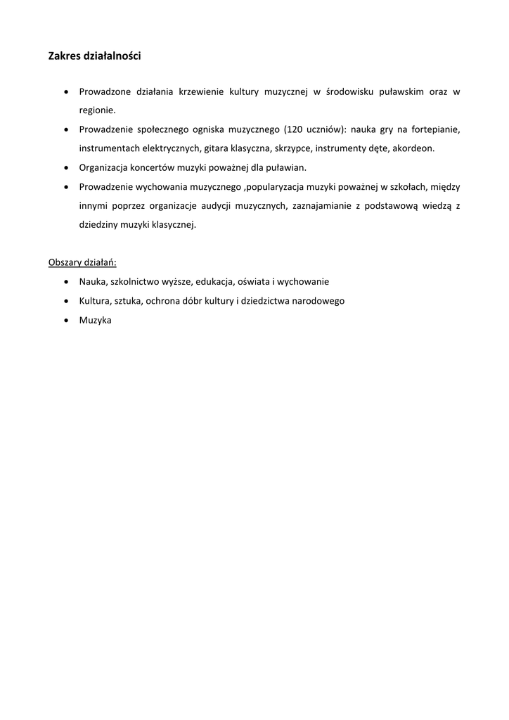 Zakres działalności • Prowadzone działania krzewienie kultury muzycznej w środowisku puławskim oraz w regionie. • Prowadzenie społecznego ogniska muzycznego (120 uczniów): nauka gry na fortepianie, instrumentach elektrycznych, gitara klasyczna, skrzypce, instrumenty dęte, akordeon. • Organizacja koncertów muzyki poważnej dla puławian. • Prowadzenie wychowania muzycznego ,popularyzacja muzyki poważnej w szkołach, między innymi poprzez organizacje audycji muzycznych, zaznajamianie z podstawową wiedzą z dziedziny muzyki klasycznej. Obszary działań: • Nauka, szkolnictwo wyższe, edukacja, oświata i wychowanie • Kultura, sztuka, ochrona dóbr kultury i dziedzictwa narodowego • Muzyka