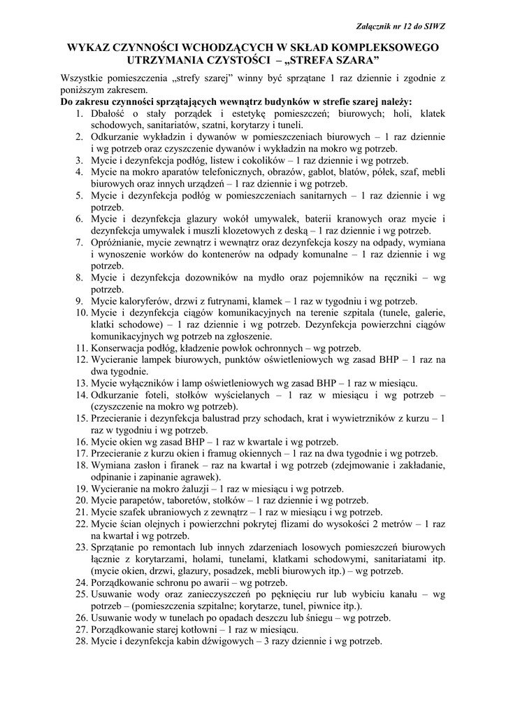 Załącznik nr 12 do SIWZ WYKAZ CZYNNOŚCI WCHODZĄCYCH W SKŁAD KOMPLEKSOWEGO UTRZYMANIA CZYSTOŚCI – „STREFA SZARA” Wszystkie pomieszczenia „strefy szarej” winny być sprzątane 1 raz dziennie i zgodnie z poniższym zakresem. Do zakresu czynności sprzątających wewnątrz budynków w strefie szarej należy: 1. Dbałość o stały porządek i estetykę pomieszczeń; biurowych; holi, klatek schodowych, sanitariatów, szatni, korytarzy i tuneli. 2. Odkurzanie wykładzin i dywanów w pomieszczeniach biurowych – 1 raz dziennie i wg potrzeb oraz czyszczenie dywanów i wykładzin na mokro wg potrzeb. 3. Mycie i dezynfekcja podłóg, listew i cokolików – 1 raz dziennie i wg potrzeb. 4. Mycie na mokro aparatów telefonicznych, obrazów, gablot, blatów, półek, szaf, mebli biurowych oraz innych urządzeń – 1 raz dziennie i wg potrzeb. 5. Mycie i dezynfekcja podłóg w pomieszczeniach sanitarnych – 1 raz dziennie i wg potrzeb. 6. Mycie i dezynfekcja glazury wokół umywalek, baterii kranowych oraz mycie i dezynfekcja umywalek i muszli klozetowych z deską – 1 raz dziennie i wg potrzeb. 7. Opróżnianie, mycie zewnątrz i wewnątrz oraz dezynfekcja koszy na odpady, wymiana i wynoszenie worków do kontenerów na odpady komunalne – 1 raz dziennie i wg potrzeb. 8. Mycie i dezynfekcja dozowników na mydło oraz pojemników na ręczniki – wg potrzeb. 9. Mycie kaloryferów, drzwi z futrynami, klamek – 1 raz w tygodniu i wg potrzeb. 10. Mycie i dezynfekcja ciągów komunikacyjnych na terenie szpitala (tunele, galerie, klatki schodowe) – 1 raz dziennie i wg potrzeb. Dezynfekcja powierzchni ciągów komunikacyjnych wg potrzeb na zgłoszenie. 11. Konserwacja podłóg, kładzenie powłok ochronnych – wg potrzeb. 12. Wycieranie lampek biurowych, punktów oświetleniowych wg zasad BHP – 1 raz na dwa tygodnie. 13. Mycie wyłączników i lamp oświetleniowych wg zasad BHP – 1 raz w miesiącu. 14. Odkurzanie foteli, stołków wyścielanych – 1 raz w miesiącu i wg potrzeb – (czyszczenie na mokro wg potrzeb). 15. Przecieranie i dezynfekcja balustrad przy schodach, krat i wywietrzników z kurzu – 1 raz w tygodniu i wg potrzeb. 16. Mycie okien wg zasad BHP – 1 raz w kwartale i wg potrzeb. 17. Przecieranie z kurzu okien i framug okiennych – 1 raz na dwa tygodnie i wg potrzeb. 18. Wymiana zasłon i firanek – raz na kwartał i wg potrzeb (zdejmowanie i zakładanie, odpinanie i zapinanie agrawek). 19. Wycieranie na mokro żaluzji – 1 raz w miesiącu i wg potrzeb. 20. Mycie parapetów, taboretów, stołków – 1 raz dziennie i wg potrzeb. 21. Mycie szafek ubraniowych z zewnątrz – 1 raz w miesiącu i wg potrzeb. 22. Mycie ścian olejnych i powierzchni pokrytej flizami do wysokości 2 metrów – 1 raz na kwartał i wg potrzeb. 23. Sprzątanie po remontach lub innych zdarzeniach losowych pomieszczeń biurowych łącznie z korytarzami, holami, tunelami, klatkami schodowymi, sanitariatami itp. (mycie okien, drzwi, glazury, posadzek, mebli biurowych itp.) – wg potrzeb. 24. Porządkowanie schronu po awarii – wg potrzeb. 25. Usuwanie wody oraz zanieczyszczeń po pęknięciu rur lub wybiciu kanału – wg potrzeb – (pomieszczenia szpitalne; korytarze, tunel, piwnice itp.). 26. Usuwanie wody w tunelach po opadach deszczu lub śniegu – wg potrzeb. 27. Porządkowanie starej kotłowni – 1 raz w miesiącu. 28. Mycie i dezynfekcja kabin dźwigowych – 3 razy dziennie i wg potrzeb.