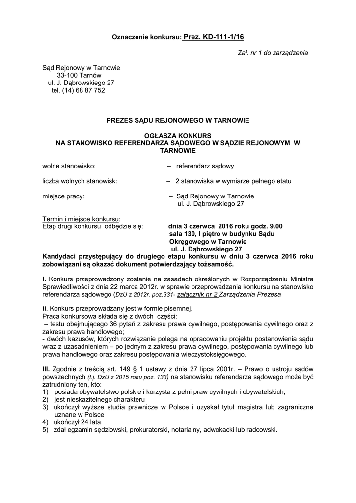 Oznaczenie konkursu: Prez. KD-111-1/16 Zał. nr 1 do zarządzenia Sąd Rejonowy w Tarnowie 33-100 Tarnów ul. J. Dąbrowskiego 27 tel. (14) 68 87 752 PREZES SĄDU REJONOWEGO W TARNOWIE OGŁASZA KONKURS NA STANOWISKO REFERENDARZA SĄDOWEGO W SĄDZIE REJONOWYM W TARNOWIE wolne stanowisko: – referendarz sądowy liczba wolnych stanowisk: – 2 stanowiska w wymiarze pełnego etatu miejsce pracy: – Sąd Rejonowy w Tarnowie ul. J. Dąbrowskiego 27 Termin i miejsce konkursu: Etap drugi konkursu odbędzie się: dnia 3 czerwca 2016 roku godz. 9.00 sala 130, I piętro w budynku Sądu Okręgowego w Tarnowie ul. J. Dąbrowskiego 27 Kandydaci przystępujący do drugiego etapu konkursu w dniu 3 czerwca 2016 roku zobowiązani są okazać dokument potwierdzający tożsamość. I. Konkurs przeprowadzony zostanie na zasadach określonych w Rozporządzeniu Ministra Sprawiedliwości z dnia 22 marca 2012r. w sprawie przeprowadzania konkursu na stanowisko referendarza sądowego (DzU z 2012r. poz.331- załącznik nr 2 Zarządzenia Prezesa II. Konkurs przeprowadzany jest w formie pisemnej. Praca konkursowa składa się z dwóch części: – testu obejmującego 36 pytań z zakresu prawa cywilnego, postępowania cywilnego oraz z zakresu prawa handlowego; - dwóch kazusów, których rozwiązanie polega na opracowaniu projektu postanowienia sądu wraz z uzasadnieniem – po jednym z zakresu prawa cywilnego, postępowania cywilnego lub prawa handlowego oraz zakresu postępowania wieczystoksięgowego. III. Zgodnie z treścią art. 149 § 1 ustawy z dnia 27 lipca 2001r. – Prawo o ustroju sądów powszechnych (t.j. DzU z 2015 roku poz. 133) na stanowisku referendarza sądowego może być zatrudniony ten, kto: 1) posiada obywatelstwo polskie i korzysta z pełni praw cywilnych i obywatelskich, 2) jest nieskazitelnego charakteru 3) ukończył wyższe studia prawnicze w Polsce i uzyskał tytuł magistra lub zagraniczne uznane w Polsce 4) ukończył 24 lata 5) zdał egzamin sędziowski, prokuratorski, notarialny, adwokacki lub radcowski. IV. Wykaz dokumentów wymaganych do zgłoszenia na konkurs od kandydata na stanowisko referendarza sądowego: 1. wniosek o zatrudnienie na stanowisku referendarza sądowego, 2. życiorys i informację o przebiegu kariery zawodowej, 3. oryginał lub urzędowo poświadczone zaświadczenie o zdanym egzaminie sędziowskim, prokuratorskim, notarialnym, adwokackim lub radcowskim, 4. oświadczenie o wyrażeniu zgody na przetwarzanie danych osobowych na potrzeby konkursu, 5. oświadczenie, że jest obywatelem Rzeczypospolitej Polskiej i korzysta z pełni praw cywilnych i obywatelskich załącznik 3 (druki do pobrania) 6. 3 aktualne fotografie zgodne z wymaganiami stosowanymi przy wydawaniu dowodów osobistych. Do zgłoszenia kandydat może dołączyć dokumenty potwierdzające dodatkowe kwalifikacje i osiągnięcia. Kandydat składa wymagane dokumenty opatrzone oznaczeniem konkursu bezpośrednio w siedzibie Sądu - w Oddziale Kadr Sądu Rejonowego w Tarnowie, pokój 220 II piętro, albo przesyła je za pośrednictwem operatora pocztowego. Zgłoszenia kandydatów przyjmowane będą do dnia 18 maja 2016 roku. W przypadku przesyłania dokumentów za pośrednictwem operatora pocztowego, za datę ich złożenia uważa się datę nadania przesyłki w placówce pocztowej operatora. Nie będą rozpatrywane podania złożone przed ogłoszeniem konkursu, jak również po upływie terminu składania podań. Wszelkie braki w dokumentach stwierdzających spełnienie przez kandydata warunków formalnych, nie będą podlegały żadnym działaniom ze strony Sądu zmierzającym do ich uzupełnienia, czy wyjaśnienia. Dodatkowe informacje w sprawie ogłoszonego konkursu na stanowisko referendarza sądowego w Sądzie Rejonowym w Tarnowie można uzyskać telefonicznie (14) 68 87 752. VI. Po przeprowadzeniu etapu pierwszego konkursu – wstępnej weryfikacji zgłoszeń kandydatów pod kątem spełnienia wymogów formalnych przystąpienia do konkursu, Komisja konkursowa ustala listę kandydatów dopuszczonych do drugiego etapu konkursu, która zostanie umieszczona nie później niż na 7 dni przed terminem rozpoczęcia drugiego etapu konkursu na stronie www.tarnow.sr.gov.pl oraz na tablicy ogłoszeń znajdującej się na parterze w budynku Sądu Rejonowego w Tarnowie. Tarnów, 26.IV.2016 roku Prezes Sądu Rejonowego w Tarnowie SSR Zbigniew Zabawa