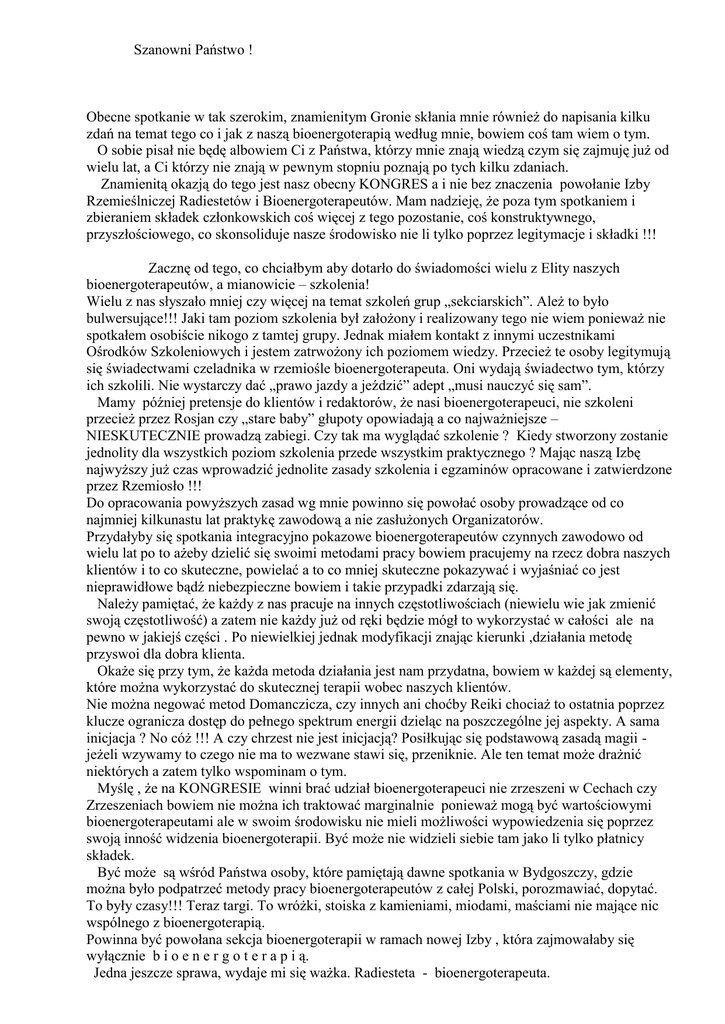 Szanowni Państwo ! Obecne spotkanie w tak szerokim, znamienitym Gronie skłania mnie również do napisania kilku zdań na temat tego co i jak z naszą bioenergoterapią według mnie, bowiem coś tam wiem o tym. O sobie pisał nie będę albowiem Ci z Państwa, którzy mnie znają wiedzą czym się zajmuję już od wielu lat, a Ci którzy nie znają w pewnym stopniu poznają po tych kilku zdaniach. Znamienitą okazją do tego jest nasz obecny KONGRES a i nie bez znaczenia powołanie Izby Rzemieślniczej Radiestetów i Bioenergoterapeutów. Mam nadzieję, że poza tym spotkaniem i zbieraniem składek członkowskich coś więcej z tego pozostanie, coś konstruktywnego, przyszłościowego, co skonsoliduje nasze środowisko nie li tylko poprzez legitymacje i składki !!! Zacznę od tego, co chciałbym aby dotarło do świadomości wielu z Elity naszych bioenergoterapeutów, a mianowicie – szkolenia! Wielu z nas słyszało mniej czy więcej na temat szkoleń grup „sekciarskich”. Ależ to było bulwersujące!!! Jaki tam poziom szkolenia był założony i realizowany tego nie wiem ponieważ nie spotkałem osobiście nikogo z tamtej grupy. Jednak miałem kontakt z innymi uczestnikami Ośrodków Szkoleniowych i jestem zatrwożony ich poziomem wiedzy. Przecież te osoby legitymują się świadectwami czeladnika w rzemiośle bioenergoterapeuta. Oni wydają świadectwo tym, którzy ich szkolili. Nie wystarczy dać „prawo jazdy a jeździć” adept „musi nauczyć się sam”. Mamy później pretensje do klientów i redaktorów, że nasi bioenergoterapeuci, nie szkoleni przecież przez Rosjan czy „stare baby” głupoty opowiadają a co najważniejsze – NIESKUTECZNIE prowadzą zabiegi. Czy tak ma wyglądać szkolenie ? Kiedy stworzony zostanie jednolity dla wszystkich poziom szkolenia przede wszystkim praktycznego ? Mając naszą Izbę najwyższy już czas wprowadzić jednolite zasady szkolenia i egzaminów opracowane i zatwierdzone przez Rzemiosło !!! Do opracowania powyższych zasad wg mnie powinno się powołać osoby prowadzące od co najmniej kilkunastu lat praktykę zawodową a nie zasłużonych Organizatorów. Przydałyby się spotkania integracyjno pokazowe bioenergoterapeutów czynnych zawodowo od wielu lat po to ażeby dzielić się swoimi metodami pracy bowiem pracujemy na rzecz dobra naszych klientów i to co skuteczne, powielać a to co mniej skuteczne pokazywać i wyjaśniać co jest nieprawidłowe bądź niebezpieczne bowiem i takie przypadki zdarzają się. Należy pamiętać, że każdy z nas pracuje na innych częstotliwościach (niewielu wie jak zmienić swoją częstotliwość) a zatem nie każdy już od ręki będzie mógł to wykorzystać w całości ale na pewno w jakiejś części . Po niewielkiej jednak modyfikacji znając kierunki ,działania metodę przyswoi dla dobra klienta. Okaże się przy tym, że każda metoda działania jest nam przydatna, bowiem w każdej są elementy, które można wykorzystać do skutecznej terapii wobec naszych klientów. Nie można negować metod Domanczicza, czy innych ani choćby Reiki chociaż to ostatnia poprzez klucze ogranicza dostęp do pełnego spektrum energii dzieląc na poszczególne jej aspekty. A sama inicjacja ? No cóż !!! A czy chrzest nie jest inicjacją? Posiłkując się podstawową zasadą magii jeżeli wzywamy to czego nie ma to wezwane stawi się, przeniknie. Ale ten temat może drażnić niektórych a zatem tylko wspominam o tym. Myślę , że na KONGRESIE winni brać udział bioenergoterapeuci nie zrzeszeni w Cechach czy Zrzeszeniach bowiem nie można ich traktować marginalnie ponieważ mogą być wartościowymi bioenergoterapeutami ale w swoim środowisku nie mieli możliwości wypowiedzenia się poprzez swoją inność widzenia bioenergoterapii. Być może nie widzieli siebie tam jako li tylko płatnicy składek. Być może są wśród Państwa osoby, które pamiętają dawne spotkania w Bydgoszczy, gdzie można było podpatrzeć metody pracy bioenergoterapeutów z całej Polski, porozmawiać, dopytać. To były czasy!!! Teraz targi. To wróżki, stoiska z kamieniami, miodami, maściami nie mające nic wspólnego z bioenergoterapią. Powinna być powołana sekcja bioenergoterapii w ramach nowej Izby , która zajmowałaby się wyłącznie b i o e n e r g o t e r a p i ą. Jedna jeszcze sprawa, wydaje mi się ważka. Radiesteta - bioenergoterapeuta. Bioenergoterapeuta posługuje się informacją odbieraną bezpośrednio w kontakcie organizm – organizm w radiesteta za pomocą urządzeń radiestezyjnych. Obserwując aurę rąk bioenergoterapeuty i porównując ją z aurą radiestety z np. wahadłem jest ona inna a wiec obaj pracują jakby na innej częstotliwości w tych samych przypadkach jednostek chorobowych. Bioenergoterapeuta „czyta” informacje ciała klienta jakby dokładniej, „czyściej” nawet bez kontaktu empatycznego. Myślę sobie, że jeżeli ja coś takiego obserwuję to i Państwo również. Czy nie należałoby się tym zająć w szerszym gronie. Ponadto tak sobie myślę, że jeżeli już chcemy posiłkować się systemem kontrolnym to dla bioenergoterapeuty powinna wystarczyć do tego metoda OMURY (dwupalcowa O-pierścieniowa metoda molekularnej identyfikacji i lokalizacji, pierścień Omura), a nie wahadło, które może powodować zakłócenia w odbiorze subtelnych zmian a przede wszystkim upośledzać naszą wrodzoną wrażliwość. Ręce to przecież 1/3 wszystkich sygnałów otrzymywanych przez korę mózgową. Każda zmiana położenia rąk zmienia kierunek ich pól magnetycznych. Co zatem jest w stanie dokonać wahadło itp. Być może znajdę w ten sposób zwolenników jak i przeciwników moich spostrzeżeń i być może wyniknie z tego coś, co jest ważne, co pozwoli na udoskonalenie naszego warsztatu, skuteczności oddziaływania na klienta już teraz ale i w przyszłości. Z poważaniem: Andrzej Leśniewicz Bioenergoterapeuta.