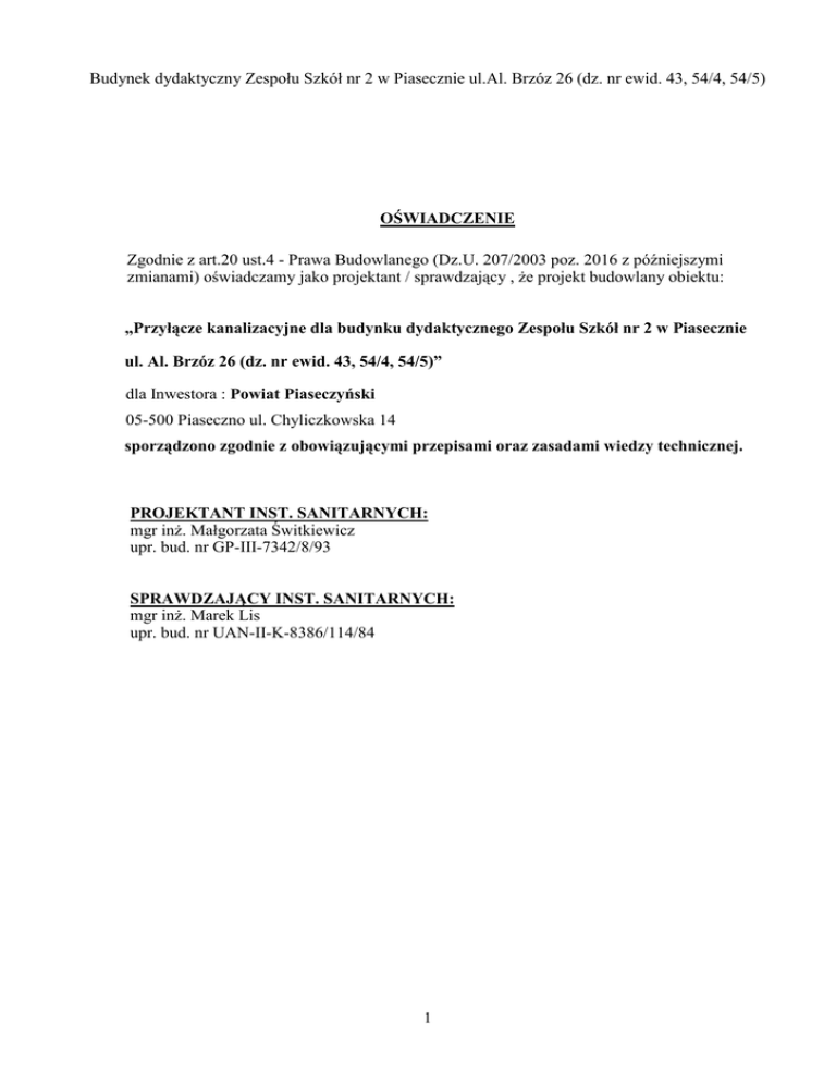 Budynek dydaktyczny Zespołu Szkół nr 2 w Piasecznie ul.Al. Brzóz 26 (dz. nr ewid. 43, 54/4, 54/5) OŚWIADCZENIE Zgodnie z art.20 ust.4 - Prawa Budowlanego (Dz.U. 207/2003 poz. 2016 z późniejszymi zmianami) oświadczamy jako projektant / sprawdzający , Ŝe projekt budowlany obiektu: „Przyłącze kanalizacyjne dla budynku dydaktycznego Zespołu Szkół nr 2 w Piasecznie ul. Al. Brzóz 26 (dz. nr ewid. 43, 54/4, 54/5)” dla Inwestora : Powiat Piaseczyński 05-500 Piaseczno ul. Chyliczkowska 14 sporządzono zgodnie z obowiązującymi przepisami oraz zasadami wiedzy technicznej. PROJEKTANT INST. SANITARNYCH: mgr inŜ. Małgorzata Świtkiewicz upr. bud. nr GP-III-7342/8/93 SPRAWDZAJĄCY INST. SANITARNYCH: mgr inŜ. Marek Lis upr. bud. nr UAN-II-K-8386/114/84 1 Budynek dydaktyczny Zespołu Szkół nr 2 w Piasecznie ul.Al. Brzóz 26 (dz. nr ewid. 43, 54/4, 54/5) SPIS TREŚCI PROJEKTU BUDOWLANEGO przyłącza kanalizacji sanitarnej dla budynku dydaktycznego Zespołu Szkół nr 2 Piaseczno ul. Al. Brzóz 26 (dz. nr ewid. 43, 54/4, 54/5) Projekt zawiera : I OPIS TECHNICZNY 1. Przedmiot i zakres opracowania 2. Podstawa opracowania 3. Warunki gruntowo-wodne 4. Roboty ziemne 5. Opis przyłącza kanalizacyjnego 6. Obliczenia 7. Wykaz materiałów przyłącza kanalizacji sanitarnej II CZĘŚĆ RYSUNKOWA 1. Sytuacja 2. Profil podłuŜny przyłącza kanalizacyjnego 3. Schemat przyłącza kanalizacyjnego 4. Profil pionowy wykopu i zasypki 2 rys.nr 1 rys.nr 2 rys.nr 3 rys.nr 4 Budynek dydaktyczny Zespołu Szkół nr 2 w Piasecznie ul.Al. Brzóz 26 (dz. nr ewid. 43, 54/4, 54/5) I OPIS TECHNICZNY 1. Przedmiot i zakres opracowania Przedmiotem opracowania jest budowa przyłącza kanalizacji sanitarnej dla budynku dydaktycznego Zespołu Szkół nr 2 w Piasecznie ul. Al. Brzóz 26 (dz. nr ewid. 43, 54/4, 54/5) Zakres opracowania obejmuje: - montaŜ nowego przyłącza kanalizacji sanitarnej grawitacyjnej z włączeniem do istniejącej na terenie posesji studzienki kanalizacji sanitarnej podciśnieniowej 2. Podstawa opracowania Projekt opracowano w oparciu o: a) umowa z Inwestorem, Gminą Piaseczno nr 1/07 INW b) wypis i wyrys nr UiA 7328/M/543/06 z 19.10.2006 wydane przez UMiG w Piasecznie c) warunki techniczne przyłączenia budynku do sieci kanalizacyjnej wydane przez Wydział Gospodarki Komunalnej i Mieszkaniowej UMiG Piaseczno oraz Przedsiębiorstwo Techniczne ELMAR Zalesie Górne d) warunki techniczne przyłączenia budynku do sieci kanalizacyjnej deszczowej wydane przez Wydział Gospodarki Komunalnej i Mieszkaniowej UMiG Piaseczno e) warunki techniczne przyłączenia budynku do sieci gazowej wydane przez MSG Warszawa-Oddział Gazownia Warszawska-Warszawa ul. Kruczkowskiego 2 f) projekt budowlany architektoniczno-konstrukcyjny rozbudowywanego budynku g) inwentaryzacja do celów projektowych istniejącego budynku h) obowiązujące przepisy i normy dotyczące projektowania i wykonawstwa instalacji sanitarnych i sieci zewnętrznych. COBRTI "Instal " W-wa i) warunki techniczne wykonania i odbioru rurociągów z tworzyw sztucznych. SGGiK W-wa j) warunki techniczne wykonania i odbioru robót budowlano-montaŜowych. Sieci sanitarne i przemysłowe, W-wa k) aktualne katalogi branŜowe 3. Warunki gruntowo-wodne Teren przedmiotowej działki zbudowany jest z dwóch warstw geotechnicznych. Składają się na nie, w zaleŜności od zagłębienia: - do głębokości 0,5 m p.p.t. - gleba - do głębokości 5,0 m p.p.t. - piaski drobne i średnie Poziom zwierciadła wody gruntowej występuje na głębokości poniŜej 5,00 m p.p.t. Dokumentacja geotechniczna opracowana przez Pracownię Ochrony Środowiska „Eko”. 4. Roboty ziemne Wykonanie wykopów ręczne. Wykopy naleŜy zabezpieczyć wypraskami. Wykop winien być odpowiednio oznakowany i zabezpieczony, aby pozwalał na moŜliwość poruszania się pieszych i pojazdów. Zasypkę wykopu dokonać piaskiem pozbawionym kamieni, grud, części korzeni i innych ciał stałych. Dno wykopu wyprofilować podsypką piaskową do projektowanych rzędnych. Podczas zasypywania wykopu-kolejne warstwy, wys. max.50 cm, zagęszczać mechanicznie. W przypadku występowania w czasie prac ziemnych sączeń naleŜy zastosować wypompowywanie wody gruntowej przy pomocy motopomp o wydajności min.10 m3/h. 3 Budynek dydaktyczny Zespołu Szkół nr 2 w Piasecznie ul.Al. Brzóz 26 (dz. nr ewid. 43, 54/4, 54/5) 5. Opis przyłącza kanalizacji sanitarnej 5.1. Rurociągi Przyłącze kanalizacji sanitarnej grawitacyjnej zaprojektowano z rur PCW klasy "S" φ160 mm. Połączenia rur kielichowe typu P uszczelniane przy uŜyciu uszczelki gumowej. 5.2. Uzbrojenie kanalizacji sanitarnej Uzbrojenie kanalizacji sanitarnej stanowić będą: -studzienka rewizyjna betonowa φ1000 mm -studzienka inspekcyjna polietylenowe φ425 mm f-my WAVIN. Studzienki z pierścieniami odciąŜającymi. Przykrycie studzienek włazami Ŝeliwnymi typu cięŜkiego, klasy D φ 600 i 425 mm. 5.3. Składowanie rur Rury naleŜy składować w oryginalnych paczkach na płaskiej powierzchni wolnej od kamieni i ostrych przedmiotów. Rury składowane w stertach naleŜy układać na balach drewnianych odpowiedniej grubości, aby kielichy rur nie spoczywały bezpośrednio na ziemi. 5.4. Próby szczelności kanałów Po ułoŜeniu kanałów i wykonaniu obsypki (bez złączy) wykonać próbę na eksfiltrację. Wykonać ją naleŜy wodą o ciśnieniu grawitacyjnym. Napełnienie kanału dokonywać od studzienki dolnej. Ciśnienie do 3 m sł.w. Czas trwania próby minimum 15 minut. Po sprawdzeniu złączy, zabezpieczyć je obsypką z piasku odpowiednio zagęszczoną. Po całkowitym zasypaniu wykopu, naleŜy wykonać próbę na deformację przekroju poprzecznego przewodu. 6. Obliczenia - przepływ obliczeniowy ścieków dla budynku Zgodnie z PN - 92/B - 01707 wg wzoru q = k (Σ qn)0,5 przyjęto: umywalki miski w.c. kompaktowe zlewy pisuary wpusty podłogowe z PCW φ50 Σ qn - szt. 15 - szt. 6 - szt. 4 - szt. 3 - szt. 9 = 36,5 qs. = 0,7 x ( 36