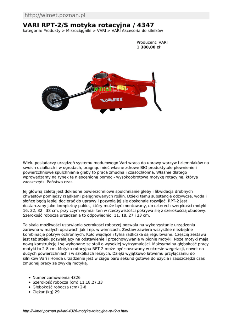 http://wimet.poznan.pl VARI RPT-2/S motyka rotacyjna / 4347 kategoria: Produkty > Mikrociągniki > VARI > VARI Akcesoria do silników Producent: VARI 1 380,00 zł Wielu posiadaczy urządzeń systemu modułowego Vari wraca do uprawy warzyw i ziemniaków na swoich działkach i w ogrodach, pragnąc mieć własne zdrowe BIO produkty,ale plewnienie i powierzchniowe spulchnianie gleby to praca żmudna i czasochłonna. Właśnie dlatego wprowadzamy na rynek tę nieocenioną pomoc - wysokoobrotową motykę rotacyjną, którya zaoszczędzi Państwa czas. Jej główną zaletą jest dokładne powierzchniowe spulchnianie gleby i likwidacja drobnych chwastów pomiędzy rządkami pielęgnowanych roślin. Dzięki temu substancje odżywcze, woda i słońce będą lepiej docierać do uprawy i pozwolą jej się doskonale rozwijać. RPT-2 jest dostarczany jako kompletny pakiet, który może być montowany, do czterech szerpkości motyki 16, 22, 32 i 38 cm, przy czym wymiar ten w rzeczywistości pokrywa się z szerokością obudowy. Szerokość robocza urzadzenia to odpowiednio: 11, 18, 27 i 33 cm. Ta skala możliwości ustawiania szerokości roboczej pozwala na wykorzystanie urządzenia zarówno w małych uprawach jak i np. w winnicach. Zestaw zawiera wszystkie niezbędne kombinacje pokryw ochronnych. Koło wiądące i tylna radliczka są regulowane. Częscią zestawu jest też stojak pozwalający na odstawienie i przechowywanie w pionie motyki. Noże motyki mają nową konstrukcję i są wykonane ze stali o wysokiej wytrzymałości. Maksymalna głębokość pracy motyki to 2-8 cm. Motyka rotacyjna RPT-2 może być stosowany w okresie wegetacji, nawet na dużych powierzchniach i w szkółkach leśnych. Dzięki wyjątkowo łatwemu przyłączaniu do silników Vari i Honda urządzenie jest w ciągu paru sekund gotowe do użycia i zaoszczędzi czas żmudnej pracy ze zwykłą motyką. Numer zamówienia 4326 Szerokość robocza (cm) 11,18,27,33 Głębokość robocza (cm) 2-8 Ciężar (kg) 29 http://wimet.poznan.pl/vari-4326-motyka-rotacyjna-rp-t2-s.html