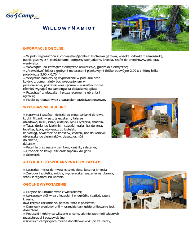 WI L L O W Y N A M I O T INFORMACJE OGÓLNE: • W pełni wyposażona kuchnia/salon/jadalnia: kuchenka gazowa, wysoka lodówka z zamrażarką, palnik gazowy z 4 pierścieniami, poręczny stół jadalny, krzesła, szafki do przechowywania oraz wentylator • Wewnątrz i na zewnątrz elektryczne oświetlenie, gniazdka elektryczne; • „Prawdziwe” łóżka z grubymi materacami piankowymi (łóżko podwójne 2,00 x 1,40m; łóżka pojedyncze 2,00 x 0,70m) • Wszystkie namioty są wyposażone w poduszki oraz kołdry, z domu należy być wyposażonym w prześcieradła, poszewki oraz ręczniki – wszystko można również wynająć na campingu za dodatkową opłatą • Przestrzeń z wieszakami przeznaczoną na ubrania i ręczniki; • Meble ogrodowe wraz z parasolem przeciwsłonecznym. WYPOSAŻENIE KUCHNI: • Naczynia i sztućce: kieliszki do wina, szklanki do piwa, kubki, filiżanki wraz z talerzykami, talerze obiadowe, miski, noże, widelce, łyżki i łyżeczki, chochla, • Taca, deska do krojenia, nożyczki, krajalnica do sera, łopatka, łyżka, otwieracz do butelek, korkociąg, otwieracz do konserw, cedzak, nóż do warzyw, obieraczka do ziemniaków, deseczka, nóż do chleba, dzbanek; • Patelnia oraz zestaw garnków, czajnik, salaterka; • Dzbanek do kawy, filtr oraz zapalnik do gazu. • Ściereczki ARTYKUŁY GOSPODARSTWA DOMOWEGO: • Lusterko, miska do mycia naczyń, zlew, kosz na śmieci,; • Zmiotka i szufelka, miotła, wycieraczka, suszarka na ubrania, szafki z regałami na ubrania. OGÓLNE WYPOSAŻENIE: • Miejsce na ubrania wraz z wieszakami; • Luksusowy stół wraz z krzesłami w ogródku (patio), cztery krzesła, dwa krzesła rozkładane, parasol wraz z podstawą; • Darmowy węglowy grill – wszędzie tam gdzie grillowanie jest dozwolone; • Poduszki i kołdry są wliczone w cenę, ale nie zapomnij własnych prześcieradeł i poszewek (na wszystkich campingach można dodatkowo wykupić te rzeczy).