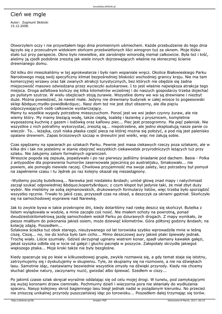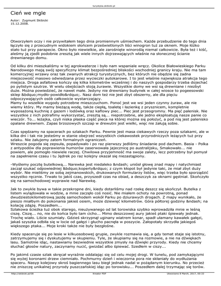 turystyka.skibicki.pl Cień we mgle Autor: Zygmunt Skibicki 15.12.2008. Otworzyłem oczy i nie przywitałem tego dnia promiennym uśmiechem. Każde przebudzenie do tego dnia łączyło się z przecudnym widokiem słońcem prześwietlonych liści winogron tuż za oknem. Moje łóżko stało tuż przy parapecie. Okno było niewielkie, ale zarośnięte winoroślą niemal całkowicie. Była też i kiść, aleśmy ją zjedli podobnie zresztą jak wiele innych dojrzewających właśnie na słonecznej ścianie drewnianego domu. Od kilku dni mieszkaliśmy w tej agrokwaterze i było nam wspaniale wręcz. Okolice Białowieskiego Parku Narodowego mają swój specyficzny klimat bezpośredniej bliskości wschodniej granicy kraju. Nie ma tam komercyjnej wrzawy oraz tak zwanych atrakcji turystycznych, bez których nie obędzie się żadna miejscowość masowo odwiedzana przez wycieczki autokarowe. I to jest właśnie największa atrakcja tego miejsca. Droga asfaltowa kończy się kilka kilometrów wcześniej i do naszych gospodarzy trzeba dojechać po pylistym szutrze. W wielu obejściach stoją żurawie. Wszystkie domy we wsi są drewniane i niezbyt duże. Można powiedzieć, że nawet małe. Jedyny nie drewniany budynek w całej wiosce to pogeesowski sklep „mydło-powidło”. Nasz dom też nie jest zbyt obszerny, ale dla pięciu odpoczywających osób całkowicie wystarczający. Mamy tu wszelkie wygody potrzebne mieszczuchom. Ponoć jest we wsi jeden czynny żuraw, ale nie wiemy który. My mamy bieżącą wodę, także ciepłą, toaletę i łazienkę z prysznicem, kompletnie wyposażoną kuchnię z gazem i lodówką oraz kaflowy piec... Piec jest przeogromny. Ma pięć palenisk. Nie wszystkie z nich potrafimy wykorzystać, zresztą są... niepotrzebne, ale jedno eksploatują nasze panie co wieczór. To... leżajka, czyli niska płaska część pieca na której można się położyć, a pod nią jest palenisko opalane drewnem. Zapas brzozowych szczap w drewutni jest wielki, więc nie żałują sobie. Czas spędzamy na spacerach po szlakach Parku. Pewnie jest masa ciekawych rzeczy poza szlakami, ale w kilka dni i tak nie jesteśmy w stanie obejrzeć wszystkich ciekawostek przyrodniczych leżących tuż przy szlaku. Nie żałujemy zatem formalnych ograniczeń. Wreszcie pogoda się zepsuła, popadywało i po raz pierwszy jedliśmy śniadanie pod dachem. Basia - Polka z antypodów dla poprawienia humorów zaserwowała jajecznicę po australijsku, Smakowało... nie powiem, ale pomogło niewiele raczej. Chwilowa przyjemność ma swoje zalety, lecz potrzebny był pomysł na zapełnienie czasu i tu Jędrek po raz kolejny okazał się niezastąpiony. -Wyślemy pocztę butelkową... Narewka jest niedaleko – uniósł głowę znad mapy i natychmiast zaczął szukać odpowiedniej „koperty” z czym kłopot był jedynie taki, że miał zbyt duży wybór. Nie mieliśmy ze sobą zejmanowskich, drukowanych formularzy listów, więc trzeba było sporządzić wszystko ręcznie. Trwało to jakiś czas, przyszedł czas na obiad, a deszczyk za oknami gęstniał. Skończyło się na samochodowej wyprawie nad Narewkę. Jak to zwykle bywa w takie przekropne dni, kiedy dotarliśmy nad rzekę deszcz się skończył. Butelka z listem wylądowała w wodzie, a mnie zaczęło coś nosić. Nie miałem ochoty na powrotną, ponad dwudziestokilometrową jazdę samochodem wokół Parku po dziurawych drogach. Z mapy wynikało, że pieszo miałbym do pokonania jakieś osiem, może dziewięć kilometrów. Góra półtorej godziny – na kolację zdążę. Poszedłem... Szlakowa ścieżka tuż obok starego, nieużywanego od lat torowiska szybko wprowadziła mnie w leśną ciszę. Ciszę... no, nie do końca było tam cicho... Mimo deszczowej aury jakieś ptaki śpiewały jednak. Trochę wiało. Liście szumiały. Gdzieś skrzypnął uginany wiatrem konar, spadł ułamany kawałek gałęzi, jakaś szyszka odbiła się w locie od gałęzi i głucho pacnęła w poszycie. Załopotały skrzydła jakiegoś większego ptaka... Moje kroki także nie były bezgłośne. Kiedy spaceruje się po lesie w kilkuosobowej grupie, zwykle rozmawia się, a gdy temat staje się istotny, zatrzymujemy się i dyskutujemy w skupieniu. Tyle, że skupiamy się na rozmowie, a nie na dźwiękach lasu. Samotnie idąc, nastawiamy bezwiednie wszystkie zmysły na dźwięki przyrody. Kiedy nie chcemy słuchać głosów natury, zaczynamy nucić, gwizdać albo śpiewać. Szedłem w ciszy... Po jakimś czasie szlak skręcał wyraźnie oddalając się od celu mojej drogi. W tunelu, pod zamykającymi się wyżej koronami drzew ciemniało. Pochmurny dzień i wieczorna pora nie skłaniały do wydłużania spaceru. Nasyp kolejowy skroś bagiennego lasu biegł jednak nadal w pożądanym kierunku. No przecież nie zniszczę unikalnej przyrody puszczańskiej idąc po torowisku... Poszedłem dalej trzymając się torów. http://skibicki.pl/08 Kreator PDF Utworzono 8 March, 2017, 00:33 turystyka.skibicki.pl Szedłem w lekko tylko jaśniejącym tunelu pomiędzy ścianami wielkich drzew. Z bagien leżących po obydwu stronach mojej drogi uniosła się wieczorna mgła. Widoczność spadała z każdym kwadransem. W dodatku trawy zlane całodzienna mżawką były nasiąknięte wodą. Dopóki szedłem szlakiem, nie miało to jakiegokolwiek znaczenia. Teraz, poza ścieżką, brnąc wśród nie koszonych traw przemoczyłem nogi po kilkuset metrach. Nie było to straszną przeszkoda, ale kolejnym elementem podnoszącym dramaturgię wrażeń wynikających z unikalności scenerii. W pewnym momencie, na wprost przed sobą zauważyłem w jasnym tunelu zamglonej drogi spory cień. Zatrzymałem się. To mogli być strażnicy Parku... Było ich tu wyjątkowo dużo. Trudno się temu dziwić – tuż obok była granica państwowa, a jej wojskowe znaczenie określały dwa różne układy po obydwu jej stronach. Strażników spotykaliśmy codziennie podczas spacerów. Poruszali się na rowerach i by