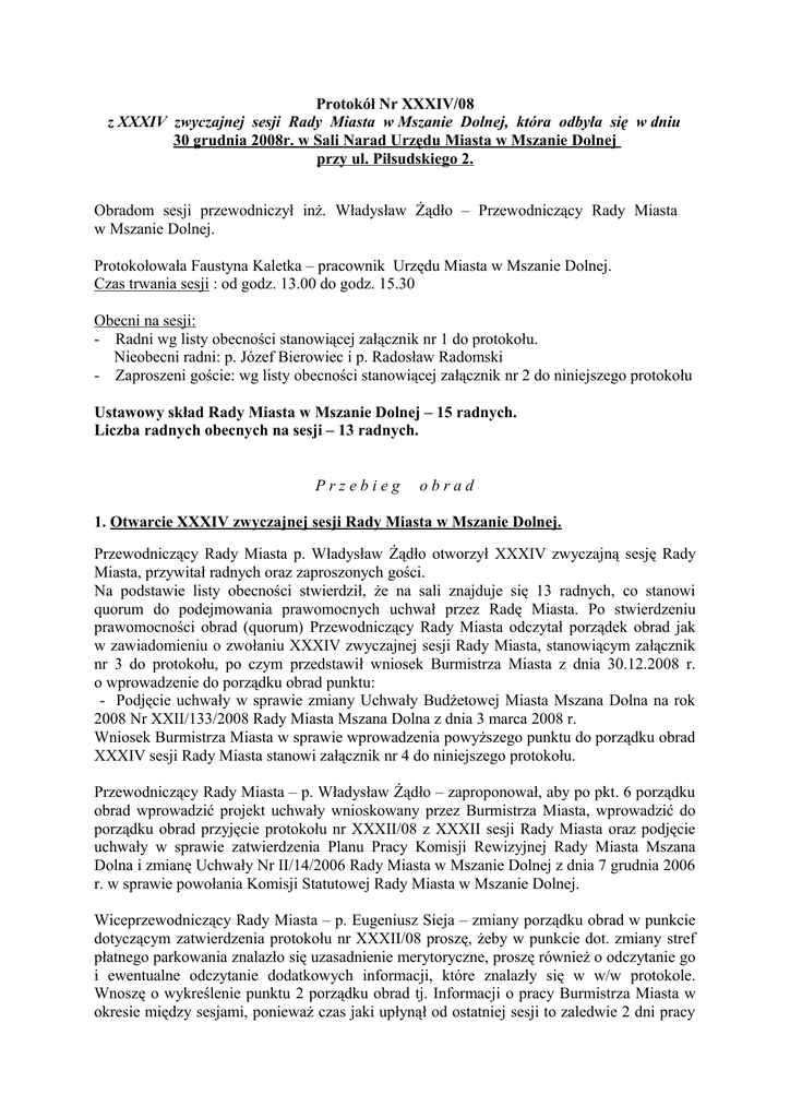 Protokół Nr XXXIV/08 z XXXIV zwyczajnej sesji Rady Miasta w Mszanie Dolnej, która odbyła się w dniu 30 grudnia 2008r. w Sali Narad Urzędu Miasta w Mszanie Dolnej przy ul. Piłsudskiego 2. Obradom sesji przewodniczył inż. Władysław Żądło – Przewodniczący Rady Miasta w Mszanie Dolnej. Protokołowała Faustyna Kaletka – pracownik Urzędu Miasta w Mszanie Dolnej. Czas trwania sesji : od godz. 13.00 do godz. 15.30 Obecni na sesji: - Radni wg listy obecności stanowiącej załącznik nr 1 do protokołu. Nieobecni radni: p. Józef Bierowiec i p. Radosław Radomski - Zaproszeni goście: wg listy obecności stanowiącej załącznik nr 2 do niniejszego protokołu Ustawowy skład Rady Miasta w Mszanie Dolnej – 15 radnych. Liczba radnych obecnych na sesji – 13 radnych. Przebieg obrad 1. Otwarcie XXXIV zwyczajnej sesji Rady Miasta w Mszanie Dolnej. Przewodniczący Rady Miasta p. Władysław Żądło otworzył XXXIV zwyczajną sesję Rady Miasta, przywitał radnych oraz zaproszonych gości. Na podstawie listy obecności stwierdził, że na sali znajduje się 13 radnych, co stanowi quorum do podejmowania prawomocnych uchwał przez Radę Miasta. Po stwierdzeniu prawomocności obrad (quorum) Przewodniczący Rady Miasta odczytał porządek obrad jak w zawiadomieniu o zwołaniu XXXIV zwyczajnej sesji Rady Miasta, stanowiącym załącznik nr 3 do protokołu, po czym przedstawił wniosek Burmistrza Miasta z dnia 30.12.2008 r. o wprowadzenie do porządku obrad punktu: - Podjęcie uchwały w sprawie zmiany Uchwały Budżetowej Miasta Mszana Dolna na rok 2008 Nr XXII/133/2008 Rady Miasta Mszana Dolna z dnia 3 marca 2008 r. Wniosek Burmistrza Miasta w sprawie wprowadzenia powyższego punktu do porządku obrad XXXIV sesji Rady Miasta stanowi załącznik nr 4 do niniejszego protokołu. Przewodniczący Rady Miasta – p. Władysław Żądło – zaproponował, aby po pkt. 6 porządku obrad wprowadzić projekt uchwały wnioskowany przez Burmistrza Miasta, wprowadzić do porządku obrad przyjęcie protokołu nr XXXII/08 z XXXII sesji Rady Miasta oraz podjęcie uchwały w sprawie zatwierdzenia Planu Pracy Komisji Rewizyjnej Rady Miasta Mszana Dolna i zmianę Uchwały Nr II/14/2006 Rady Miasta w Mszanie Dolnej z dnia 7 grudnia 2006 r. w sprawie powołania Komisji Statutowej Rady Miasta w Mszanie Dolnej. Wiceprzewodniczący Rady Miasta – p. Eugeniusz Sieja – zmiany porządku obrad w punkcie dotyczącym zatwierdzenia protokołu nr XXXII/08 proszę, żeby w punkcie dot. zmiany stref płatnego parkowania znalazło się uzasadnienie merytoryczne, proszę również o odczytanie go i ewentualne odczytanie dodatkowych informacji, które znalazły się w w/w protokole. Wnoszę o wykreślenie punktu 2 porządku obrad tj. Informacji o pracy Burmistrza Miasta w okresie między sesjami, ponieważ czas jaki upłynął od ostatniej sesji to zaledwie 2 dni pracy pana Burmistrza. 3 wniosek – Uchwała Nr XXX/197/2008 w sprawie procedury uchwalania budżetu miasta oraz rodzaju i szczegółowości materiałów informacyjnych towarzyszących projektowi - obliguje nas do przyjmowania go w następujących etapach: 1. odczytanie projektu uchwały budżetowej 2. odczytanie opinii Regionalnej Izby Obrachunkowej 3. zapoznanie się z opinią Komisji Budżetowej 4. odniesienie się Burmistrza do opinii Komisji Budżetowej, opinii Regionalnej Izby Obrachunkowej 5. zgłaszanie dodatkowych poprawek do projektu uchwały budżetowej 6. dyskusja nad projektem uchwały i wnoszonymi dodatkowo poprawkami 7. przegłosowanie wnoszonych poprawek 8. głosowanie nad projektem uchwały budżetowej Przewodniczący Rady Miasta – p. Władysław Żądło – standardowo się wprowadza punkt do porządku obrad - Informacje o pracy Burmistrza Miasta w okresie między sesjami. Co do czytania uzasadnienia merytorycznego zawartego w protokole nr XXXII/08 to było ono czytane na sesji Rady Miasta. Jeśli chodzi o przyjęcie budżetu to skoro pan widzi taką potrzebę to możemy ten punkt jeszcze bardziej rozbudować. Radca Prawy UM – p. Marek Panek – można dodać do punktu 8 porządku obrad podpunkt d – głosowanie nad projektem uchwały Przewodniczący Rady Miasta poddał pod głosowanie zmianę porządku obrad. Rada Miasta w głosowaniu jawnym, bezwzględną większością głosów ustawowego składu Rady (13 głosów „za”) przyjęła wnioski o zmianie porządku obrad w zakresie j/w. W związku z powyższym po otwarciu sesji i przedstawieniu porządku obrad oraz jego zmian, co stanowiło pkt 1 porządku obrad, porządek sesji obejmował: a) b) c) d) 1. Otwarcie XXXIV zwyczajnej sesji Rady Miasta Mszana Dolna. 2. Przyjęcie protokołu nr XXXII/08 z XXXII sesji Rady Miasta. 3. Informacja o pracy Burmistrza Miasta w okresie między sesjami 4. Interpelacje i zapytania radnych. 5. Podjęcie uchwały w sprawie zatwierdzenia Planu Pracy Komisji Rewizyjnej Rady Miasta Mszana Dolna. 6. Podjęcie uchwały w sprawie zmiany Uchwały Nr II/14/2006 Rady Miasta w Mszanie Dolnej z dnia 7 grudnia 2006 r. w sprawie powołania Komisji Statutowej Rady Miasta w Mszanie Dolnej. 7. Podjęcie uchwały w sprawie zmiany Uchwały Budżetowej Miasta Mszana Dolna na rok 2008 Nr XXII/133/2008 Rady Miasta Mszana Dolna z dnia 3 marca 2008 r. 8. Podjęcie Uchwały Budżetowej Miasta Mszana Dolna na rok 2009. przedstawienie projektu budżetu Miasta Mszana Dolna na rok 2009 wraz z uzasadnieniem odczytanie opinii Składu Orzekającego Regionalnej Izby Obrachunkowej w sprawie projektu budżetu przedstawienie opinii Komisji stałych Rady Miasta w sprawie projektu budżetu Miasta Mszana Dolna na rok 2009 głosowanie nad projektem uchwały budżetowej 9. Podjęcie uchwały w sprawie przyjęcia Lokalnego Programu Rewitalizacji Miasta Mszana Dolna na lata 2007-2022 10. Odpowiedzi na interpelacje i zapytania radnych. 11. Wolne wnioski. 12. Zamknięcie obrad XXXIII zwyczajnej sesji Rady Miasta Mszana Dolna. Ad. 2. Przyjęcie protokołu nr XXXII/08 z XXXII sesji Rady Miasta