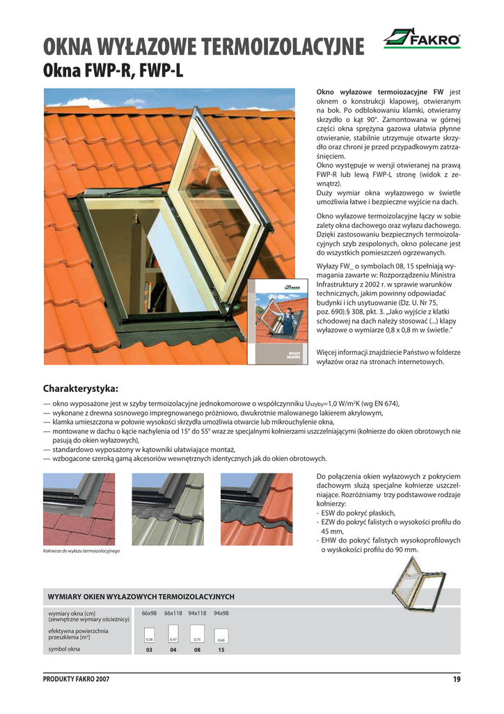 OKNA WYŁAZOWE TERMOIZOLACYJNE Okna FWP-R, FWP-L Okno wyłazowe termoiozacyjne FW jest oknem o konstrukcji klapowej, otwieranym na bok. Po odblokowaniu klamki, otwieramy skrzydło o kąt 90°. Zamontowana w górnej części okna sprężyna gazowa ułatwia płynne otwieranie, stabilnie utrzymuje otwarte skrzydło oraz chroni je przed przypadkowym zatrzaśnięciem. Okno występuje w wersji otwieranej na prawą FWP-R lub lewą FWP-L stronę (widok z zewnątrz). Duży wymiar okna wyłazowego w świetle umożliwia łatwe i bezpieczne wyjście na dach. Okno wyłazowe termoizolacyjne łączy w sobie zalety okna dachowego oraz wyłazu dachowego. Dzięki zastosowaniu bezpiecznych termoizolacyjnych szyb zespolonych, okno polecane jest do wszystkich pomieszczeń ogrzewanych. Wyłazy FW_ o symbolach 08, 15 spełniają wymagania zawarte w: Rozporządzeniu Ministra Infrastruktury z 2002 r. w sprawie warunków technicznych, jakim powinny odpowiadać budynki i ich usytuowanie (Dz. U. Nr 75, poz. 690).§ 308, pkt. 3. „Jako wyjście z klatki schodowej na dach należy stosować (...) klapy wyłazowe o wymiarze 0,8 x 0,8 m w świetle.” 8:";: %"$)08& Więcej informacji znajdziecie Państwo w folderze wyłazów oraz na stronach internetowych. Charakterystyka: — okno wyposażone jest w szyby termoizolacyjne jednokomorowe o współczynniku Uszyby=1,0 W/m2K (wg EN 674), — wykonane z drewna sosnowego impregnowanego próżniowo, dwukrotnie malowanego lakierem akrylowym, — klamka umieszczona w połowie wysokości skrzydła umożliwia otwarcie lub mikrouchylenie okna, — montowane w dachu o kącie nachylenia od 15° do 55° wraz ze specjalnymi kołnierzami uszczelniającymi (kołnierze do okien obrotowych nie pasują do okien wyłazowych), — standardowo wyposażony w kątowniki ułatwiające montaż, — wzbogacone szeroką gamą akcesoriów wewnętrznych identycznych jak do okien obrotowych. Do połączenia okien wyłazowych z pokryciem dachowym służą specjalne kołnierze uszczelniające. Rozróżniamy trzy podstawowe rodzaje kołnierzy: - ESW do pokryć płaskich, - EZW do pokryć falistych o wysokości profilu do 45 mm, - EHW do pokryć falistych wysokoprofilowych o wyskokości profilu do 90 mm. Kołnierze do wyłazu termoizolacyjnego WYMIARY OKIEN WYŁAZOWYCH TERMOIZOLACYJNYCH 66x98 66x118 94x118 94x98 efektywna powierzchnia przeszklenia [m2] 0,38 0,47 0,75 0,60 symbol okna 03 04 08 15 wymiary okna [cm] (zewnętrzne wymiary ościeżnicy) PRODUKTY FAKRO 2007 19
