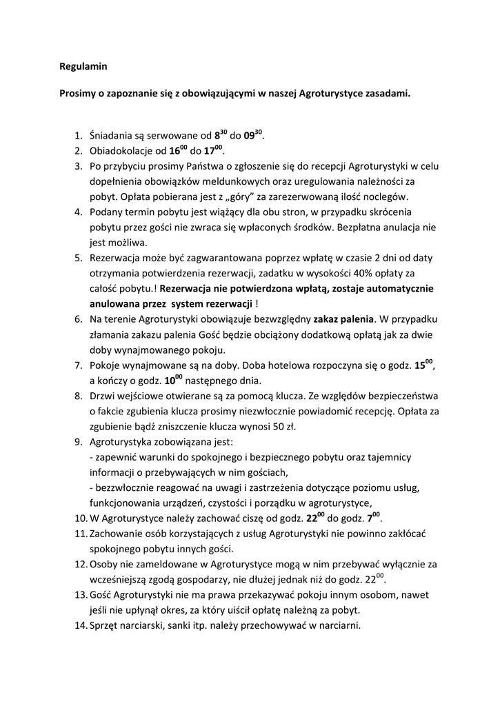 Regulamin Prosimy o zapoznanie się z obowiązującymi w naszej Agroturystyce zasadami. 1. Śniadania są serwowane od 830 do 0930. 2. Obiadokolacje od 1600 do 1700. 3. Po przybyciu prosimy Państwa o zgłoszenie się do recepcji Agroturystyki w celu dopełnienia obowiązków meldunkowych oraz uregulowania należności za pobyt. Opłata pobierana jest z „góry” za zarezerwowaną ilość noclegów. 4. Podany termin pobytu jest wiążący dla obu stron, w przypadku skrócenia pobytu przez gości nie zwraca się wpłaconych środków. Bezpłatna anulacja nie jest możliwa. 5. Rezerwacja może być zagwarantowana poprzez wpłatę w czasie 2 dni od daty otrzymania potwierdzenia rezerwacji, zadatku w wysokości 40% opłaty za całość pobytu.! Rezerwacja nie potwierdzona wpłatą, zostaje automatycznie anulowana przez system rezerwacji ! 6. Na terenie Agroturystyki obowiązuje bezwzględny zakaz palenia. W przypadku złamania zakazu palenia Gość będzie obciążony dodatkową opłatą jak za dwie doby wynajmowanego pokoju. 7. Pokoje wynajmowane są na doby. Doba hotelowa rozpoczyna się o godz. 1500, a kończy o godz. 1000 następnego dnia. 8. Drzwi wejściowe otwierane są za pomocą klucza. Ze względów bezpieczeństwa o fakcie zgubienia klucza prosimy niezwłocznie powiadomić recepcję. Opłata za zgubienie bądź zniszczenie klucza wynosi 50 zł. 9. Agroturystyka zobowiązana jest: - zapewnić warunki do spokojnego i bezpiecznego pobytu oraz tajemnicy informacji o przebywających w nim gościach, - bezzwłocznie reagować na uwagi i zastrzeżenia dotyczące poziomu usług, funkcjonowania urządzeń, czystości i porządku w agroturystyce, 10. W Agroturystyce należy zachować ciszę od godz. 2200 do godz. 700. 11. Zachowanie osób korzystających z usług Agroturystyki nie powinno zakłócać spokojnego pobytu innych gości. 12. Osoby nie zameldowane w Agroturystyce mogą w nim przebywać wyłącznie za wcześniejszą zgodą gospodarzy, nie dłużej jednak niż do godz. 2200. 13. Gość Agroturystyki nie ma prawa przekazywać pokoju innym osobom, nawet jeśli nie upłynął okres, za który uiścił opłatę należną za pobyt. 14. Sprzęt narciarski, sanki itp. należy przechowywać w narciarni. 15. Agroturystyka nie ponosi odpowiedzialności z tytułu utraty lub uszkodzenia mienia gości. 16. Ze względu na bezpieczeństwo przeciwpożarowe zabronione jest używanie w pokojach grzałek, żelazek i innych podobnych urządzeń elektrycznych nie stanowiących stałego wyposażenia tych pomieszczeń. Niedozwolone jest również używanie ognia otwartego (świece itp.). 17. Gość Agroturystyki ponosi odpowiedzialność materialną za wszelkiego rodzaju uszkodzenia lub zniszczenia przedmiotów wyposażenia i urządzeń technicznych powstałych z jego winy lub z winy odwiedzających go osób. Gość powinien zawiadomić gospodarzy Agroturystyki o wystąpieniu szkody niezwłocznie po jej stwierdzeniu. 18. Agroturystyka zastrzega sobie prawo do odmowy dalszego świadczenia usług w przypadku drastycznego naruszenia regulaminu przez gości. 19. Parkowanie pojazdów dozwolone jest wyłącznie w miejscu wyznaczonym do tego celu. Parking jest bezpłatny i niestrzeżony. 20. Kuchnia pracuje w określonych godzinach, osoby które przychodzą na posiłki po czasie i bez wcześniejszych ustaleń nie zostaną obsłużone. 21. Przedmioty osobistego użytku pozostawione przez wyjeżdżającego gościa w pokoju będą odesłane na wskazany adres na koszt Gościa. W przypadku nie otrzymania takiej dyspozycji, rzeczy przechowywane będą przez okres 1 miesiąca, a następnie niszczone. 22. Cennik jest integralną częścią regulaminu, a rezerwacja oznacza zgodę na warunki regulaminu. 23. Agroturystyka może odmówić przyjęcia gościa, który podczas poprzedniego pobytu rażąco naruszył regulamin, wyrządzając szkodę w mieniu Agroturystyki lub gości albo szkodę na osobie gości, pracowników lub innych osób przebywających w pensjonacie, albo też w inny sposób zakłócił spokojny pobyt gości lub funkcjonowanie pensjonatu. 24. Agroturystyka u Teresy, zastrzega sobie prawo do zmiany cen cennikowych w wybranych okresach. 25. Opłata za zwierzę, po wcześniejszym poinformowaniu Agroturystyki, wynosi 20zł/doba.