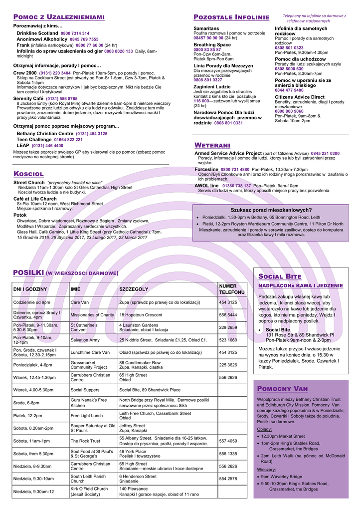 Pomoc z Uzaleznieniami Pozostale Infolinie Porozmawiaj z kims… Drinkline Scotland 0800 7314 314 Anonimowi Alkoholicy 0845 769 7555 Frank (infolinia narkotykowa) 0800 77 66 00 (24 hr) Infolinia do spraw uzaleznienia od gier 0808 8020 133 Daily, 8ammidnight Otrzymaj informacje, porady I pomoc… Samaritans Infolinia dla samotnych rodzicow Poufna rozmowa I pomoc w potrzebie 08457 90 90 90 (24 hr) Pomoc I porady dla samotnych rodzicow 0808 801 0323 Pon-Piatek, 9.30am-4.30pm Breathing Space 0800 83 85 87 Pon-Czw 6pm-2am, Piatek 6pm-Pon 6am Pomoc dla uchodzcow Porady dla ludzi szukajacych azylu 0808 8000 630 Pon-Piatek, 8.30am-7pm Linia Porady dla Mezczyzn Crew 2000 (0131) 220 3404 Pon-Piatek 10am-5pm, po porady I pomoc. Sklep na Cockburn Street jest otwarty od Pon-Sr 1-5pm, Czw 3-7pm, Piatek & Sobota 1-5pm Informacje dotyczace narkotykow I jak byc bezpiecznym. Nikt nie bedzie Cie tam ocenial I krytykowal. Serenity Café (0131) 556 8765 8 Jackson Entry (kolo Royal Mile) otwarte dziennie 9am-5pm & niektore wieczory Prowadzone przez ludzi po odwyku dla ludzi na odwyku. Znajdziesz tam mile powitanie, zrozumienie, dobre jedzenie, duzo rozrywek I mozliwosci nauki I pracy jako voluntariusz. Otrzymaj pomoc poprzez miejscowy program... Bethany Christian Centre (0131) 454 3125 Teen Challenge 01664 822 221 LEAP (0131) 446 4400 Telephony na infolinie sa darmowe z telefonow stacjonarnych Dla mezczyzn przezywajacych przemoc w rodzinie 0808 801 0327 Pomoc w uporaniu sie ze smiercia bliskiego Zaginieni Ludzie 0844 477 9400 Jesli sie zagubiles lub straciles kontakt z kims kto cie poszukuje 116 000—zadzwon lub wyslij smsa (24 hr) Citizens Advice Direct Benefity, zatrudnienie, dlugi I porady mieszkaniowe 0808 800 9060 Pon-Piatek, 9am-8pm & Sobota 10am-2pm Narodowa Pomoc Dla ludzi doswiadczajacych przemoc w rodzinie 0808 801 0331 Weterani Mozesz takze poprosic swojego GP aby skierowal cie po pomoc (zobacz pomoc medyczna na nastepnej stronie) Armed Service Advice Project (part of Citizens Advice) 0845 231 0300 Kosciol Forcesline 0800 731 4880 Pon-Piatek, 10.30am-7.30pm Porady, informacje I pomoc dla ludzi, ktorzy sa lub byli zatrudnieni przez wojsko. Obecni/Byli czlonkowie armi oraz ich rodziny moga porozmawiac w zaufaniu o ich problemach. Street Church “przynosimy kosciol na ulice” Niedziela 11am-1.30pm kolo St Giles Cathedral, High Street Kosciol tworza ludzie a nie budynki. AWOL line 01380 738 137 Pon–Piatek, 9am-10am Serwis dla ludzi w armi, ktorzy opuscili miejsce pracy bez pozwolenia. Café at Life Church Sr-Pia 10am-12 noon, West Richmond Street Miejsce spotkania I rozmowy. Szukasz porad mieszkaniowych? Potok Otwartosc, Dobre wiadomosci, Rozmowy z Bogiem , Zmiany zyciowe, Modlitwa I Wsparcie. Zapraszamy serdecznie wszystkich. Glass Hall, Café Camino, 1 Little King Street (przy Catholic Cathedral). 7pm. 15 Grudnia 2016, 26 Stycznia 2017, 23 Lutego 2017, 23 Marca 2017 Poniedzialki, 1.30-3pm w Bethany, 65 Bonnington Road, Leith Piatki, 12-2pm Royston Wardieburn Community Centre, 11 Pilton Dr North Mieszkanie, zatrudnienie I porady w sprawie zasilkow, dostep do komputera oraz filizanka kawy I mila rozmowa. POSILKI (w wiekszosci darmowe) DNI I GODZINY IMIE Social Bite SZCZEGOLY NUMER TELEFONU Codziennie od 9pm Care Van Zupa (sprawdz po prawej co do lokalizacji) 454 3125 Dziennie, oprocz Srody I Czwartku, 4pm Missionaries of Charity 18 Hopetoun Crescent 556 5444 Pon-Piatek, 9-11.30am, 5.30-6.30pm St Catherine’s Convent 4 Lauriston Gardens Sniadanie, obiad I kolacja 229 2659 Pon-Piatek, 9-10am, 12-1pm Salvation Army 25 Niddrie Street. Sniadanie £1.25, Obiad £1. 523 1060 Pon, Sroda, czwartek I Sobota, 12.30-2.15pm Lunchtime Care Van Obiad (sprawdz po prawej co do lokalizacji) 454 3125 Poniedzialek, 4-6pm Grassmarket Community Project 86 Candlemaker Row Zupa, Kanapki, ciastka 225 3626 Wtorek, 12.45-1.30pm Carrubbers Christian Centre 65 High Street Obiad 556 2626 Wtorek, 4.00-5.30pm Social Suppers Social Bite, 89 Shandwick Place Sroda, 6-8pm Guru Nanak’s Free Kitchen North Bridge przy Royal Mile. Darmowe posilki serwowane przez spolecznosc Sikh Piatek, 12-2pm Free Light Lunch Leith Free Church, Casselbank Street Obiad Sobota, 8.20am-2pm Souper Saturday at Old Jeffrey Street St Paul’s Zupa, Kanapki Sobota, 11am-1pm The Rock Trust 55 Albany Street. Sniadanie dla 16-25 latkow. Dostep do prysznica, pralki, porady I wsparcie. 557 4059 Sobota, from 5.30pm Soul Food at St Paul’s & St George’s 46 York Place Posilek I towarzystwo 556 1335 Niedziela, 8-9.30am Carrubbers Christian Centre 65 High Street Sniadanie—meskie ubrania I koce dostepne 556 2626 Niedziela, 9.30-10am South Leith Parish Church 6 Henderson Street Sniadanie 554 2578 Niedziela, 9.30am-12 Kirk O’Field Church (Jesuit Society) 140 Pleasance Kanapki I gorace napoje, obiad of 11 rano NADPLACONa KAWA I JEDZENIE Podczas zakupu wlasnej kawy lub jedzenia, klienci placa wiecej, aby wystarczylo na kawe lub jedzenie dla kogos, kto nie ma pieniedzy. Wejdz I popros o nadplacony posilek. Social Bite 131 Rose Str & 89 Shandwick Pl Pon-Piatek 9am-noon & 2-3pm Mozesz takze przyjsc I wziasc jedzenie na wynos na koniec dnia, o 15.30 w kazdy Poniedzialek, Srode, Czwartek I Piatek. Pomocny Van Wspolpraca miedzy Bethany Christian Trust and Edinburgh City Mission, Pomocny Van operuje kazdego popoludnia & w Poniedzialki, Srody, Czwartki I Soboty takze do poludnia. Posilki sa darmowe. Obiady: 12.30pm Market Street 1pm-2pm King’s Stables Road, Grassmarket, the Bridges 2pm Leith Walk (na północ od McDonald Road) Wieczory: 9pm Waverley Bridge 9.50-10.30pm King’s Stables Road, Grassmarket, the Bridges Nie ma odebrać od Waterloo Place każdej nocy podczas zimy na 9.15 i 9.30pm. Miejsce schroniska jest rozne—prosze spytac w Care Van (Waverley Bridge 9-9.45pm), sprawdzic na ulotce lub zadzwonic pod numer 0131 561 8930 (dzien) or 07919 557 673 (noc). Bethany Christian Trust, 65 Bonnington Road, Edinburgh, EH6 5JQ Bethany Christian Trust is a registered char
