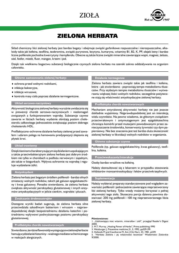 ZIOŁA Zielona Zielonaherbata Herbata Skład chemiczny liści zielonej herbaty jest bardzo bogaty i obejmuje związki garbnikowe rozpuszczalne i nierozpuszczalne, alkaloidy takie jak kofeina, teofilina, teobromina, związki purynowe, lecytyna, kumaryna, witaminy B1, B2, K, PP, olejek lotny i bardzo liczne polifenole pochodne kwercytyny i kempferolu. Obecne są także liczne związki mineralne zawierające wapń, magnez, żelazo, sód, fosfor, miedź, fluor, mangan, krzem i jod. Dzięki tak wielkiemu bogactwu substancji biologicznie czynnych zielona herbata ma szeroki zakres oddziaływania na organizm człowieka. Główne zastosowania zielonej herbaty: ♦ ochrona przed wolnymi rodnikami, ♦ infekcje bakteryjne, ♦ infekcje wirusowe, ♦ kontrola masy ciała poprzez działanie termogeniczne. Układ sercowo-naczyniowy Aktywność biologiczna zielonej herbaty wyraźnie uwidacznia się w prewencji chorób sercowo-naczyniowych i niedomagań związanych z funkcjonowaniem wątroby. Substancje czynne zawarte w liściach herbaty wydatnie obniżają poziom cholesterolu całkowitego jednocześnie zwiększając poziom dobrego cholesterolu HDL. Profilaktyczno-ochronne działanie herbaty zielonej przed zawałem i udarem polega na hamowaniu predyspozycji zlepiania się płytek krwi. Układ trawienny Dzięki tianinom charakteryzującym się działaniem uspokajającym a także przeciwbakteryjnym zielona herbata jest dobrym środkiem nie tylko w chorobach o podłożu nerwowym i zapalnym, ale także w biegunkach. Wpływa ochronnie na wątrobę i reguluje wydzielanie żółci. Antyoksydant Zielona herbata jest bogatym źródłem polifenoli - bardzo silnych zmiataczy wolnych rodników, takich jak galusan epigalokatechiny i kwas galusowy. Ponadto stwierdzono, że zielona herbata zwiększa aktywność peroksydazy glutationowej i innych enzymów antyoksydacyjnych w jelicie cienkim, wątrobie i płucach. Zwalczanie drobnoustrojów Dostępne wyniki badań sugerują, że zielona herbata silne przeciwdziała szkodliwym bakteriom i wirusom – najprawdopodobniej dzięki bezpośredniemu działaniu katechin i pośredniemu wpływowi podwyższonego poziomu peroksydazy glutationowej. Profilaktyka chorób nowotworowych Stwierdzono, że różne flawonoidy występujące w zielonej herbacie hamują wydzielanie histaminy – ważnego mediatora chemicznego w reakcjach alergicznych. Działanie termogenne Zielona herbata zawiera związki takie jak teofilina i kofeina, które - jak stwierdzono - poprawiają tempo metabolizmu tłuszczów. Przy szybszym tempie metabolizmu tłuszczów i wytwarzaniu większej ilości wolnych rodników, szczególnie pożyteczne stają się właściwości antyoksydacyjne zielonej herbaty. Profilaktyka chorób nowotworowych Mechanizm antyrakowej aktywności herbaty nie jest jeszcze dokładnie wyjaśniony. Najprawdopodobniej jest on interakcją wielu czynników. Na pewno wiadomo, że głównym związkiem przeciwrakowym i antymutagennym jest epigalokatechina chroniąca komórki przed mutacjami powodowanymi przez zanieczyszczenie środowiska, konserwanty żywności czy dym papierosowy. Nie bez znaczenia jest też bardzo duża skuteczność zielonej herbaty w likwidacji wolnych rodników w organizmie. Główne substancje czynne Polifenole (np. galusan epigalokatechiny, kwas galusowy), teofilina, kofeina. Przeciwwskazania/interakcje Osoby bardzo wrażliwe na kofeinę. Należy skonsultować się z lekarzem w przypadku stosowania inhibitorów monoaminooksydazy i leków przeciwkrzepliwych. Suplementacja Należy wybierać preparaty standaryzowane pod względem zawartości polifenoli i jednocześnie zawierające nieprzetworzony liść zielonej herbaty. Tylko wtedy możemy korzystać z pełnej aktywności tego zioła. Skuteczna porcja dzienna powinna dostarczać: 200 mg polifenoli i 100 mg nieprzetworzonego liścia zielonej herbaty. Piśmiennictwo: 1. „Uzdrawiająca moc witamin, minerałów i ziół”, przegląd Reader’s Digest 2000. 2. M.T. Murray „Healing Power of Herbs”, Prima publishing 1995 3. Weisburger J, Preventive medicine,21, 3, 1992, pp329-391 4. Hollands M and Cawthorne M, Am J Clin Nurt, 34, 1981, p2291 5. “Herbata Zielona i jej właściwości lecznicze” Wiadomości Zielarskie 9/2000.