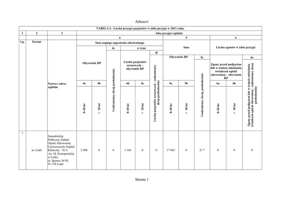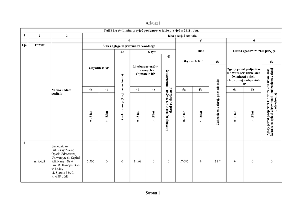 Arkusz1 TABELA 6 - Liczba przyjęć pacjentów w izbie przyjęć w 2011 roku. 1 2 3 Izba przyjęć szpitala 4 Lp. Powiat 5 6 Inne Liczba zgonów w izbie przyjęć Stan nagłego zagrożenia zdrowotnego 4c w tym: 4f Strona 1 0 21 * 6a 6b 0 0 Zgony przed podjęciem lub w trakcie udzielania świadczeń opieki zdrowotnej - cudzoziemcy (kraj pochodzenia) 17 083 Zgony przed podjęciem lub w trakcie udzielania świadczeń opieki zdrowotnej – obywatele RP > 18 lat 0 6c 0-18 lat 0 5b 5c Cudzoziemcy (kraj, pochodzenie) 1 168 5a > 18 lat 0 4e 0-18 lat 0 Cudzoziemcy (kraj pochodzenia) 2 506 4d > 18 lat m. Łódź Samodzielny Publiczny Zakład Opieki Zdrowotnej Uniwersytecki Szpital Kliniczny Nr 4 im. M. Konopnickiej w Łodzi, ul. Sporna 36/50, 91-738 Łódź 4b 0-18 lat 1 4a > 18 lat Nazwa i adres szpitala 0-18 lat Obywatele RP Liczba pacjentów urazowych – obywatele RP Liczba pacjentów urazowych - cudzoziemcy (kraj pochodzenia) Obywatele RP 0 Arkusz1 2 m. Łódź Samodzielny Publiczny Zakład Opieki Zdrowotnej Uniwersytecki Szpital Kliniczny Nr 1 im. N.Barlickiego Uniwersytetu Medycznego w Łodzi ul. Kopcińskiego 22 90-153 Łódź 46 6 607 29 * 21 895 10 * 386 14 761 0 0 0 0 m. Łódź SP ZOZ Szpital Kliniczny im. Wojskowej Akademii Medycznej Uniwersytetu Medycznego W Łodzi - Centralny Szpital Weteranów, ul. Żeromskiego 113 90-549 Łódź 0 27 017 14 * 0 8 426 4* 42 10 493 0 0 16 0 0 935 6* 0 0 0 0 1 712 3* 0 0 0 3 4 m. Łódź SP ZOZ Szpital Kliniczny im. Wojskowej Akademii Medycznej Uniwersytetu Medycznego w Łodzi - Centralny Szpital Weteranów, Szpital Kardiologiczny im. Sterlinga ul. Sterlinga 1/3 91-425 Łódź Strona 2 Arkusz1 5 m. Łódź SP ZOZ Szpital Kliniczny im. Wojskowej Akademii Medycznej Uniwersytetu Medycznego w Łodzi - Centralny Szpital Weteranów, 0 2 388 4* 0 293 0 4 4 381 1* 0 0 0 0 64 0 0 0 0 13 701 0 0 0 0 m. Łódź IV Szpital Miejski im. dr H. Jordana w Łodzi, ul. Przyrodnicza 7/9 91-480 Łódź 0 2 961 1* 0 845 0 0 0 0 0 0 0 m. Łódź III Szpital Miejski im. dr Karola Jonschera ul. Milionowa 14 93-113 Łódź 0 18 501 0 0 6 621 0 0 4 170 0 0 0 0 m. Łódź II Szpital Miejski im. dr L. Rydygiera w Łodzi ul. Sterlinga 13, 90-217 Łódź 20 1 878 4* 0 0 0 1 997 2 157 2* 0 0 0 Plac Hallera 1 90-647 Łódź 6 m. Łódź SP ZOZ Szpital Kliniczny im. Wojskowej Akademii Medycznej Uniwersytetu Medycznego w Łodzi - Centralny Szpital Weteranów, ul. Krzemieniecka 5 94-017 Łódź 7 8 9 Strona 3 Arkusz1 10 m. Łódź I Szpital Miejski im. dr E. Sonnenberga ul. Pieniny 30, 92-003 Łódź 27 7 142 0 20 2 762 0 0 2 259 0 0 0 0 m. Łódź Wojewódzki Specjalistyczny Szpital im.drWł.Biegańskiego w Łodzi ul. Kniaziewicza 1/5 91-347 Łódź 2 429 10 822 37 * 0 0 0 1 494 9 589 0 0 0 0 m. Łódź Centralny Szpital Kliniczny Uniwersytetu Medycznego w Łodzi, ul. Czechosłowacka 8/10 92-216 Łódź 41 65 0 0 0 0 311 1 194 0 0 0 0 m. Łódź Wojewódzkie Centrum Ortopedii i Rehabilitacji Narządu Ruchu im. dr Z.Radlińskiego ul. Drewnowska 75 91-002 Łódź 174 2 428 1* 174 2 428 1* 0 0 0 0 0 0 m. Łódź Specjalistyczny Psychiatryczny Zespół Opieki Zdrowotnej Szpital im. J. Babińskiego ul. Aleksandrowska 159, 91-229 Łódź 0 0 0 0 0 0 2 010 4 043 0 0 0 0 11 12 13 14 Strona 4 Arkusz1 15 m. Łódź Instytut Centrum Zdrowia Matki Polki w Łodzi ul.Rzgowska 181/289 93-338 Łódź 6 902 4 424 31 * 1 166 6 0 14 572 17 666 55 * 0 0 0 m. Łódź Wojewódzki Specjalistyczny Szpital im. M. Pirogowa w Łodzi, ul. Wólczańska 191/195 90-531 Łódź 115 12 292 13 * 25 572 0 47 7 170 0 0 0 0 m. Łódź Wojewódzki Specjalistyczny Szpital im. M. Pirogowa w Łodzi ul. Wileńska 37 94-029 Łódź 51 3 518 5* 0 0 0 15 508 0 0 2 0 m. Łódź Szpital Zakonu Bonifratrów św. Jana Bożego w Łodzi ul. Kosynierów Gdyńskich 61, 93-357 Łódź 2 634 0 1 183 0 0 1 831 0 0 1 0 m. Łódź Zakład Opieki Zdrowotnej MSWiA w Łodzi, ul. Północna 42, 91-425 Łódź 2 2 007 4* 0 235 1* 19 8 273 5* 0 5 0 m. Łódź Instytut Medycyny Pracy w Łodzi ul. Św. Teresy 8 90-950 Łódź Oddział Toksykologii 258 2 401 1* 0 0 0 30 65 0 0 0 0 16 17 18 19 20 Strona 5 Arkusz1 21 m. Łódź Wojewódzki Szpital Specjalistyczny im. M. Kopernika w Łodzi 6 110 11 162 11 * 2 641 0 0 0 0 0 0 0 0 10 466 34 3* 4 093 5 3* 1 510 0 5* 0 0 0 2 2 250 0 0 0 0 4 2 350 0 0 0 0 ul. Pabianicka 62 92-513 Łódź 22 Wojewódzki Szpital Specjalistyczny im. M. Kopernika W Łodzi m. Łódź 23 Szpital im. J. Korczaka, ul Marszałka Piłsudskiego 71 90-329 Łódź Wojewódzki Zespół Zakładów Opieki Zdrowotnej Centrum Leczenia Chorób Płuc i Rehabilitacji w Łodzi m. Łódź Szpital Chorób Płuc im. Błogosławionego Ojca Rafała Chylińskiego w Łodzi ul. Okólna 181 91-520 Łódź Strona 6 Arkusz1 24 Łódzki Wschodni Wojewódzki Zespół Zakładów Opieki Zdrowotnej Centrum Leczenia Chorób Płuc i Rehabilitacji w Łodzi 0 650 0 0 0 0 0 560 0 0 0 0 bełchatowski Szpital Wojewódzki im. Jana Pawła II w Bełchatowie ul. Czapliniecka 123 97-400 Bełchatów 79 1 477 6* 0 0 0 606 4 972 0 0 0 0 brzeziński Niepubliczny Zakład Opieki Zdrowotnej Powiatowe Centrum Zdrowia w Brzezinach ul. M.SkłodowskiejCurie 6 96-060 Brzeziny 648 8 086 4* 363 4 771 3* 285 3 315 0 0 0 0 kutnowski Samodzielny Publiczny Zakład Opieki Zdrowotnej w Kutnie Szpital Rejonowy im. A.Troczewskiego ul. Kościuszki 52 99-300 Kutno 1 054 9 158 12 * 134 1 321 4* 57 3 562 1* 0 4 0 25 26 27 Szpital Gruźlicy Chorób Płuc i Rehabilitacji w Tuszynie ul. Szpitalna 5, 95-080 Tuszyn Strona 7 Arkusz1 28 Samodzielny Publiczny Zespół Opieki Zdrowotnej w Łasku ul Warszawska 62, 98-100 Łask 1 385 3 249 0 1 048 1 993 0 25 61 1* 0 7 0 łęczycki Zakład Opieki Zdrowotnej w Łęczycy ul. Zachodnia 6, 99-100 Łęczyca 2 467 11 805 0 1 257 3 626 7* 1 281 4 568 5* 0 15 0 łowicki Zakład Opieki Zdrowotnej w Łowiczu ul. Ułańska 28, 99-400 Łowicz 1 318 4 982 29 * 1 248 4 237 21 * 526 3 296 0 0 14 0 Samodzielny Publiczny Zakład Opieki Zdrowotnej Szpital Powiatowy im.E.Biernack