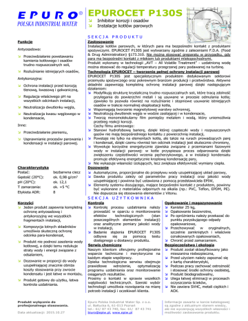 EPUROCET P130S Inhibitor korozji i osadów Instalacje kotłów parowych SEKCJA PRODUKTU Funkcje Antyosadowa: Przeciwdziałanie powstawaniu kamienia kotłowego i osadów trudno rozpuszczalnych soli, Rozluźnianie istniejących osadów, Antykorozyjna: Ochrona instalacji przed korozją tlenową, kwasową i galwaniczną, Regulacja właściwego pH na wszystkich odcinkach instalacji, Neutralizacja dwutlenku węgla, Neutralizacja kwasu węglowego w kondensacie, Inne: Przeciwdziałanie pienieniu, Usprawnianie procesów parowania i kondensacji w instalacji parowej. Charakterystyka Postać: Gęstość (20°C): pH (20°C): T zamarzania: Etykieta ADR: bezbarwna ciecz ok. 0,98 g/cm3 ok. 12,1 ok. +5 °C 8 Zastosowanie Instalacje kotłów parowych, w których para ma bezpośredni kontakt z produktami spożywczymi. EPUROCET P130S jest wytwarzany zgodnie z zaleceniami F.D.A. (Food & Drug Administration) §173.310. Nie można stosować preparatu w przypadku, gdy para ma bezpośredni kontakt z mlekiem lub produktami mlekopochodnymi. Produkt wykonany w technologii „AVT – All Volatile Treatment” - uzdatnioną wodę można stosować do regulacji temperatury przegrzanej pary podawanej na turbinę. Technologia EPUROCET – tworzenie pełnej ochrony instalacji parowej EPUROCET P130S jest specjalistycznym produktem dedykowanym sektorowi przemysłu spożywczego oraz pokrewnym branżom produkcji i przetwórstwa. Aktywne składniki zapewniają kompletną ochronę instalacji parowej dzięki następującym działaniom: Modyfikują strukturę krystaliczną trudno rozpuszczalnych soli, które tracą zdolność przylegania do powierzchni metali i są usuwane w procesie odmulania kotła; zjawisko to pozwala również na rozluźnianie i stopniowe usuwanie istniejących osadów w trakcie normalnej eksploatacji kotła, Wspomagają tworzenie magnetytowej warstwy ochronnej, Neutralizują dwutlenek węgla w wodzie zasilającej i w kondensacie, Tworzą monomolekularny film pomiędzy metalem i wodą, który uniemożliwia przebieg reakcji korozji. Cechy filmu aminowego: Stanowi hydrofobową barierę, dzięki której cząsteczki wody i rozpuszczonych gazów nie mają bezpośredniego kontaktu z powierzchnią instalacji, Powstaje nie tylko na elementach kotła, ale także na rurach prowadzących parę i kondensat, dzięki czemu również ten odcinek instalacji jest skutecznie chroniony, Wywołuje korzystne energetycznie zjawiska związane z przemianami fazowymi wody w instalacji parowej: w kotle przyspiesza proces odparowania dzięki zwiększeniu częstotliwości wrzenia pęcherzykowego, a w instalacji kondensatu promuje efektywną energetycznie kroplową kondensację pary, Nie wykazuje własności izolujących, lecz zwiększa efektywność wymiany ciepła. Dozowanie Automatyczne, proporcjonalne do przepływu wody uzupełniającej układ parowy, Dawka produktu zależy od parametrów pracy instalacji oraz jakości wody uzupełniającej i powinna być ustawiona z pomocą przedstawiciela EPIW, Elementy systemu dozującego, mające bezpośredni kontakt z produktem, powinny być wykonane z materiałów odpornych na alkalia (np.: PVC, Teflon, EPDM, PE). Nie dopuszcza się stosowania elementów z Vitonu. SEKCJA UŻYTKOWNIKA Korzyści Jeden produkt zapewnia kompletną ochronę antyosadową i antykorozyjną we wszystkich fragmentach instalacji, Kompozycja lotnych składników umożliwia skuteczną ochronę odcinka para-kondensat, Produkt nie podnosi zasolenia wody kotłowej, a dzięki temu redukuje straty wody i energii związane z odsalaniem, Dozowanie w proporcji do wody uzupełniającej znacznie obniża koszty stosowania przy zwrocie kondensatu i jest łatwe w montażu, Produkt gotowy do użytku, łatwa kontrola uzdatniania. Produkt wyłącznie do profesjonalnego stosowania. Data aktualizacji: 2015.10.27 Kontrola Kontrolę procesu uzdatniania należy prowadzić w oparciu o monitorowanie efektów technologicznych (stan poszczególnych elementów instalacji) oraz analityczne pomiary jakości wody w instalacji, Badanie stężenia EPUROCET P130S odbywa się za pomocą testu dostępnego u dostawcy produktu. Serwis chemiczny Naszym klientom oferujemy profesjonalne wsparcie techniczne i merytoryczne na każdym etapie współpracy. Opieka technologiczna serwisu obejmuje prawidłowe wdrożenie, optymalizację programu uzdatniania oraz monitorowanie osiąganych rezultatów. Prosimy o kontakt w sprawie wszelkich wątpliwości technicznych. Szeroki wybór technologii umożliwia rozwiązania na miarę potrzeb instalacji i oczekiwań klienta. Opakowanie i magazynowanie Kanister 25 kg, Opakowanie bezzwrotne, Po opróżnieniu należy przekazać do punktu pozyskującego odpady opakowaniowe, Przechowywać w oryginalnych, szczelnie zamkniętych i właściwie oznakowanych opakowaniach, Chronić przed zamarzaniem. Bezpieczeństwo i ekologia Produkt został sklasyfikowany jako mieszanina niebezpieczna, Przed użyciem należy zapoznać się z kartą charakterystyki, Podczas pracy zachować ostrożność i stosować środki ochrony osobistej, Produkt biodegradowalny, Ulega łatwej eliminacji w procesach oczyszczania ścieków, Nie zawiera SVHC, metali ciężkich i AOX. Epuro Polska Industrial Water Sp. z o.o. ul. Bałtycka 6, 61-013 Poznań tel.: 61/ 87 43 740, fax: 61/ 87 43 741 [email protected], www.epiw.pl Informacje zawarte w karcie katalogowej są zgodne z aktualnym stanem wiedzy, ale nie wyczerpują wszystkich własności i możliwości zastosowania produktu.