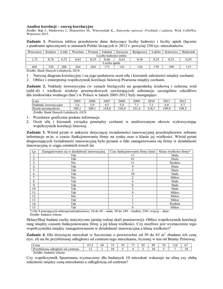 Analiza korelacji – szereg korelacyjny Źródło: Bąk I., Markowicz I., Mojsiewicz M., Wawrzyniak K., Statystyka opisowa. Przykłady i zadania, Wyd. CeDeWu, Warszawa 2015. Zadanie 1. Poniższa tablica przedstawia dane dotyczące liczby ludności i liczby aptek (łącznie z punktami aptecznymi) w miastach Polski liczących w 2012 r. powyżej 250 tys. mieszkańców. Warszawa Kraków Łódź Wrocław 1,72 0,76 0,72 0,63 602 330 288 264 Źródło: Bank Danych Lokalnych, GUS. Poznań Gdańsk Szczecin Liczba ludności (mln) 0,55 0,46 0,41 Liczba aptek 264 173 141 Bydgoszcz Lublin Katowice Białystok 0,36 0,35 0,31 0,29 126 170 109 115 1. Narysuj diagram korelacyjny i na jego podstawie oceń siłę i kierunek zależności między cechami. 2. Oblicz i zinterpretuj współczynnik korelacji liniowej Pearsona między cechami. Zadanie 2. Nakłady inwestycyjne (w cenach bieżących) na gospodarkę ściekową i ochronę wód (mld zł) i wielkość ścieków przemysłowych zawierających substancje szczególnie szkodliwe dla środowiska wodnego (hm3) w Polsce w latach 2005-2012 były następujące: Lata 2005 2006 Nakłady inwestycyjne 3,6 3,9 Ścieki przemysłowe 289,1 309,1 Źródło: Bank Danych Lokalnych, GUS. 2007 4,5 318,8 2008 5,4 310,9 2009 7,1 251,4 2010 7,2 316,7 2011 6,8 199,9 2012 5,7 198,3 1. Przedstaw graficznie podane informacje. 2. Oceń siłę i kierunek związku pomiędzy cechami w analizowanym okresie wykorzystując współczynnik korelacji liniowej. Zadanie 3. Wśród pytań w ankiecie dotyczącej świadomości innowacyjnej przedsiębiorstw zebrano informacje m.in. o czasie funkcjonowania firmy na rynku oraz o klasie jej wielkości. Wśród pytań diagnozujących świadomość innowacyjną było pytanie o fakt zaangażowania się firmy w działalność innowacyjną w ciągu ostatnich trzech lat. Lp. Zaangażowanie się w działalność innowacyjną Czas funkcjonowania firmy (lata) Klasa wielkości firmy* 1. Tak 11 Mała 2. Tak 61 Duża 3. Nie 11 Średnia 4. Tak 9 Duża 5. Tak 2 Duża 6. Tak 10 Mała 7. Nie 2 Mikro 8. Tak 6 Mała 9. Tak 8 Mała 10. Tak 3 Mała 11. Tak 8 Mikro 12. Nie 1 Mikro 13. Tak 1 Mikro 14. Tak 7 Średnia 15. Tak 8 Mikro *) Do 9 pracujących mikroprzedsiębiorstwo, 10 do 49 – małe, 50 do 249 – średnie, 250 i więcej – duże Źródło: badania własne. Sklasyfikuj badane cechy statystyczne (podaj rodzaj skali pomiarowej). Oblicz współczynnik korelacji rang między czasem funkcjonowania firmy a jej klasą wielkości. Czy możliwe jest wyznaczenie tego współczynnika między zaangażowaniem w działalność innowacyjną a klasą wielkości? Zadanie 4. Dla dziesięciu mieszkań w Szczecinie o powierzchni od 50 do 65 m2 zbadano ich cenę (tys. zł) na tle przybliżonej odległości od centrum tego mieszkania, liczonej w km od Bramy Portowej. Cena Przybliżona odległość od centrum Źródło: badania własne. 67,5 12 69 1 75 10 70 5 77 4 95 2 89 10 70 5 110 7 67 10 Czy współczynnik Spearmana wyznaczony dla badanych 10 mieszkań wskazuje na silną czy słabą zależność między ceną mieszkania a odległością od centrum?