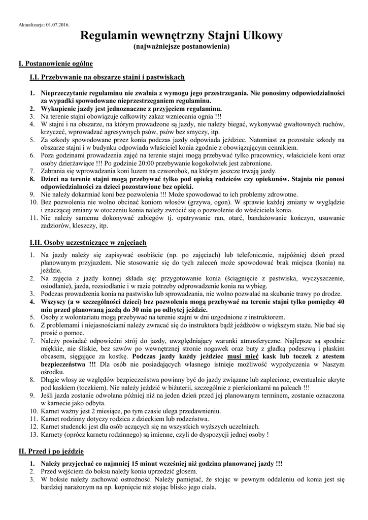 Aktualizacja: 01.07.2016. Regulamin wewnętrzny Stajni Ulkowy (najważniejsze postanowienia) I. Postanowienie ogólne I.I. Przebywanie na obszarze stajni i pastwiskach 1. Nieprzeczytanie regulaminu nie zwalnia z wymogu jego przestrzegania. Nie ponosimy odpowiedzialności za wypadki spowodowane nieprzestrzeganiem regulaminu. 2. Wykupienie jazdy jest jednoznaczne z przyjęciem regulaminu. 3. Na terenie stajni obowiązuje całkowity zakaz wzniecania ognia !!! 4. W stajni i na obszarze, na którym prowadzone są jazdy, nie należy biegać, wykonywać gwałtownych ruchów, krzyczeć, wprowadzać agresywnych psów, psów bez smyczy, itp. 5. Za szkody spowodowane przez konia podczas jazdy odpowiada jeździec. Natomiast za pozostałe szkody na obszarze stajni i w budynku odpowiada właściciel konia zgodnie z obowiązującym cennikiem. 6. Poza godzinami prowadzenia zajęć na terenie stajni mogą przebywać tylko pracownicy, właściciele koni oraz osoby dzierżawiące !!! Po godzinie 20:00 przebywanie kogokolwiek jest zabronione. 7. Zabrania się wprowadzania koni luzem na czworobok, na którym jeszcze trwają jazdy. 8. Dzieci na terenie stajni mogą przebywać tylko pod opieką rodziców czy opiekunów. Stajnia nie ponosi odpowiedzialności za dzieci pozostawione bez opieki. 9. Nie należy dokarmiać koni bez pozwolenia !!! Może spowodować to ich problemy zdrowotne. 10. Bez pozwolenia nie wolno obcinać koniom włosów (grzywa, ogon). W sprawie każdej zmiany w wyglądzie i znaczącej zmiany w otoczeniu konia należy zwrócić się o pozwolenie do właściciela konia. 11. Nie należy samemu dokonywać zabiegów tj. opatrywanie ran, otarć, bandażowanie kończyn, usuwanie zadziorów, kleszczy, itp. I.II. Osoby uczestniczące w zajęciach 1. Na jazdy należy się zapisywać osobiście (np. po zajęciach) lub telefonicznie, najpóźniej dzień przed planowanym przyjazdem. Nie stosowanie się do tych zaleceń może spowodować brak miejsca (konia) na jeździe. 2. Na zajęcia z jazdy konnej składa się: przygotowanie konia (ściągnięcie z pastwiska, wyczyszczenie, osiodłanie), jazda, rozsiodłanie i w razie potrzeby odprowadzenie konia na wybieg. 3. Podczas prowadzenia konia na pastwisko lub sprowadzania, nie wolno pozwalać na skubanie trawy po drodze. 4. Wszyscy (a w szczególności dzieci) bez pozwolenia mogą przebywać na terenie stajni tylko pomiędzy 40 min przed planowaną jazdą do 30 min po odbytej jeździe. 5. Osoby z wolontariatu mogą przebywać na terenie stajni w dni uzgodnione z instruktorem. 6. Z problemami i niejasnościami należy zwracać się do instruktora bądź jeźdźców o większym stażu. Nie bać się prosić o pomoc. 7. Należy posiadać odpowiedni strój do jazdy, uwzględniający warunki atmosferyczne. Najlepsze są spodnie miękkie, nie śliskie, bez szwów po wewnętrznej stronie nogawek oraz buty z gładką podeszwą i płaskim obcasem, sięgające za kostkę. Podczas jazdy każdy jeździec musi mieć kask lub toczek z atestem bezpieczeństwa !!! Dla osób nie posiadających własnego istnieje możliwość wypożyczenia w Naszym ośrodku. 8. Długie włosy ze względów bezpieczeństwa powinny być do jazdy związane lub zaplecione, ewentualnie ukryte pod kaskiem (toczkiem). Nie należy jeździć w biżuterii, szczególnie z pierścionkami na palcach !!! 9. Jeśli jazda zostanie odwołana później niż na jeden dzień przed jej planowanym terminem, zostanie oznaczona w karnecie jako odbyta. 10. Karnet ważny jest 2 miesiące, po tym czasie ulega przedawnieniu. 11. Karnet rodzinny dotyczy rodzica z dzieckiem lub rodzeństwa. 12. Karnet studencki jest dla osób uczących się na wszystkich wyższych uczelniach. 13. Karnety (oprócz karnetu rodzinnego) są imienne, czyli do dyspozycji jednej osoby ! II. Przed i po jeździe 1. Należy przyjechać co najmniej 15 minut wcześniej niż godzina planowanej jazdy !!! 2. Przed wejściem do boksu należy konia uprzedzić głosem. 3. W boksie należy zachować ostrożność. Należy pamiętać, że stojąc w pewnym oddaleniu od konia jest się bardziej narażonym na np. kopnięcie niż stojąc blisko jego ciała. 4. Konia należy wyczyścić, szczególnie w miejscach, gdzie znajdować się będzie siodło oraz popręg. Przed i po jeździe należy również wyczyścić kopyta. 5. Sprzęt (szczotki, kopystki, czapraki, siodła, ogłowia, kaski, baciki, itd.) należy odkładać na swoje miejsce. 6. Należy zgłaszać każde zmiany skórne (rany, otarcia, itd.). Pozwoli to zapobiec cierpieniu konia i dalszym urazom. 7. Podczas siodłania założyć należy w kolejności czaprak, podkładkę, siodło, a następnie ogłowie. Po jeździe najpierw należy ściągnąć ogłowie. Wszystkie czynności wykonujemy z lewej strony konia. 8. Jeśli jest potrzeba pozostawienia osiodłanego konia w boksie, należy zabezpieczyć wodze poprzez zaczepienie je za strzemiona !!! 9. Na komendę wszyscy jeźdźcy wraz z końmi wychodzą na plac. Nie należy opuszczać boksu samodzielnie (bez pozwolenia instruktora). 10. Zabrania się zakładania koniom sprzętu innego niż jest przydzielony odgórnie dla danego zwierzęcia. Czyli nie wolno bez pozwolenia zakładać ochraniaczy, owijek, derek, wypinaczy, wytoków itp. 11. Na jazdę należy brać tylko krótkie baty (bez pozwolenia nie wolno używać batów ujeżdżeniowych). 12. Przy wyprowadzaniu (i wprowadzaniu) konia z boksu strzemiona muszą być podciągnięte! Drzwi muszą być otwarte na całą szerokość! Konia prowadzić należy na wprost, a następnie delikatnie skręcić w odpowiednim kierunku (trzeba uważać, aby koń się nie zaczepił siodłem o nic, gdyż może to spowodować jego spłoszenie). Wodze trzyma się w prawej ręce. 13. Przed wsiadaniem należy sprawdzić popręg. 14. Wsiadanie odbywa się z pomocą schodków, z lewej strony konia. Należy unikać wsiadania z ziemi, gdyż obciąża to kręgosłup konia i powoduje niszczenie sprzętu. 15. Po zakończeniu jazdy należ