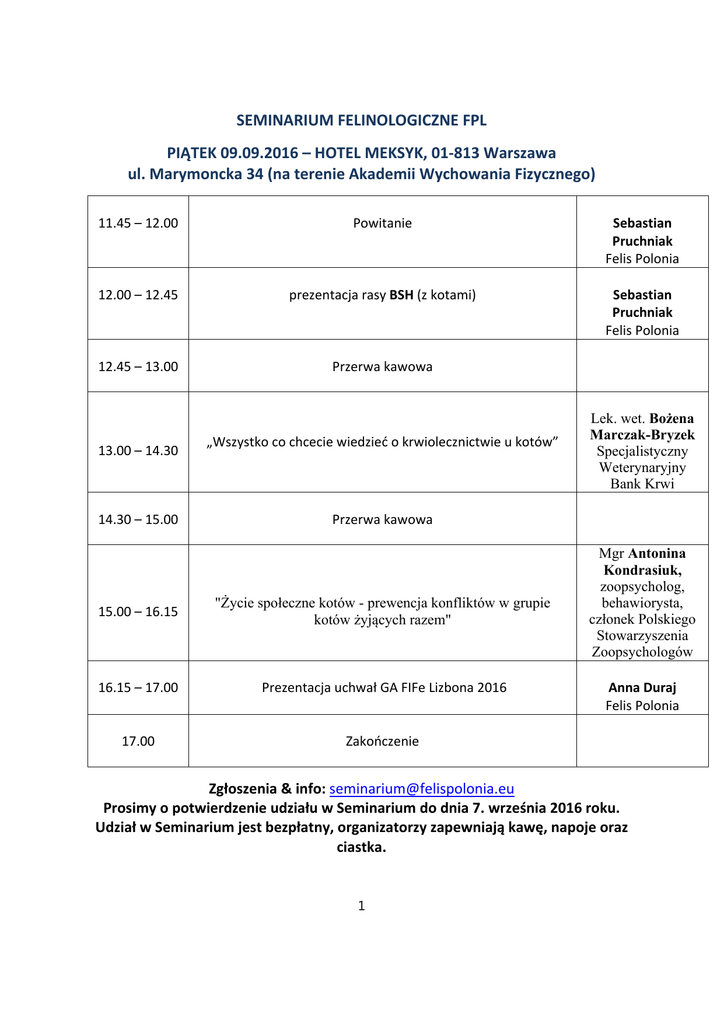 SEMINARIUM FELINOLOGICZNE FPL PIĄTEK 09.09.2016 – HOTEL MEKSYK, 01‐813 Warszawa ul. Marymoncka 34 (na terenie Akademii Wychowania Fizycznego) 11.45 – 12.00 Powitanie Sebastian Pruchniak Felis Polonia 12.00 – 12.45 prezentacja rasy BSH (z kotami) Sebastian Pruchniak Felis Polonia 12.45 – 13.00 Przerwa kawowa 13.00 – 14.30 14.30 – 15.00 „Wszystko co chcecie wiedzieć o krwiolecznictwie u kotów” Lek. wet. Bożena Marczak-Bryzek Specjalistyczny Weterynaryjny Bank Krwi Przerwa kawowa 15.00 – 16.15 "Życie społeczne kotów - prewencja konfliktów w grupie kotów żyjących razem" 16.15 – 17.00 Prezentacja uchwał GA FIFe Lizbona 2016 17.00 Zakończenie Mgr Antonina Kondrasiuk, zoopsycholog, behawiorysta, członek Polskiego Stowarzyszenia Zoopsychologów Anna Duraj Felis Polonia Zgłoszenia & info: [email protected] Prosimy o potwierdzenie udziału w Seminarium do dnia 7. września 2016 roku. Udział w Seminarium jest bezpłatny, organizatorzy zapewniają kawę, napoje oraz ciastka. 1 Klub SMK1 zaprasza na XLVI i XLVII Wystawę Kotów Rasowych, która odbędzie się 10./11. września 2016 roku w Warszawie Informacje odnośnie wystawy: www.facebook.com/events/1626536667669912/ 2