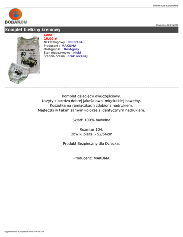 Informacje o produkcie Utworzono 08-03-2017 Komplet bielizny kremowy Cena : 19,00 zł Nr katalogowy : 0030/104 Producent : MAKOMA Dostępność : Dostępny Stan magazynowy : niski Średnia ocena : brak recenzji Komplet dziecięcy dwuczęściowy. Uszyty z bardzo dobrej jakościowo, mięciutkiej bawełny. Koszulka na ramiączkach zdobiona nadrukiem. Majteczki w takim samym kolorze z identycznym nadrukiem. Skład: 100% bawełna Rozmiar 104. Obw.kl.piers. - 52/56cm Produkt Bezpieczny dla Dziecka. Producent: MAKOMA Wygenerowano w programie www.oscGold.com Informacje o produkcie Wygenerowano w programie www.oscGold.com Informacje o produkcie Dostępne opcje Komplet bielizny kremowy » Producent: Makoma. Wygenerowano w programie www.oscGold.com