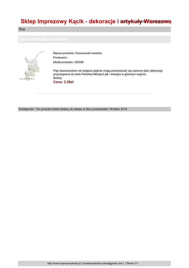 czwartek, 11 sierpień 2016 Sklep Imprezowy Kącik - dekoracje i Utworzono: artykuły Warszawa Ślub Dzwoneczki weselne Nazwa produktu: Dzwoneczki weselne Producent: Model produktu: GD008 Pięć dzwoneczkow na wstążce pięknie mogą prezentować się zarowno jako dekoracja przyczepiona do stołu Państwa Młodych jak i wisząca w głownym wejściu. Cena: 2.58zł Dostępność: Ten produkt został dodany do sklepu w dniu poniedziałek, 09 lipiec 2012 http://www.imprezowykacik.pl | [email protected] | | Strona 1/1