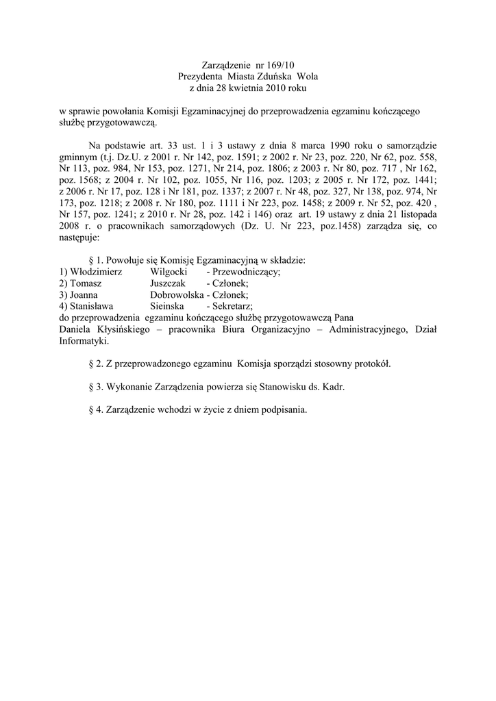Zarządzenie nr 169/10 Prezydenta Miasta Zduńska Wola z dnia 28 kwietnia 2010 roku w sprawie powołania Komisji Egzaminacyjnej do przeprowadzenia egzaminu kończącego służbę przygotowawczą. Na podstawie art. 33 ust. 1 i 3 ustawy z dnia 8 marca 1990 roku o samorządzie gminnym (t.j. Dz.U. z 2001 r. Nr 142, poz. 1591; z 2002 r. Nr 23, poz. 220, Nr 62, poz. 558, Nr 113, poz. 984, Nr 153, poz. 1271, Nr 214, poz. 1806; z 2003 r. Nr 80, poz. 717 , Nr 162, poz. 1568; z 2004 r. Nr 102, poz. 1055, Nr 116, poz. 1203; z 2005 r. Nr 172, poz. 1441; z 2006 r. Nr 17, poz. 128 i Nr 181, poz. 1337; z 2007 r. Nr 48, poz. 327, Nr 138, poz. 974, Nr 173, poz. 1218; z 2008 r. Nr 180, poz. 1111 i Nr 223, poz. 1458; z 2009 r. Nr 52, poz. 420 , Nr 157, poz. 1241; z 2010 r. Nr 28, poz. 142 i 146) oraz art. 19 ustawy z dnia 21 listopada 2008 r. o pracownikach samorządowych (Dz. U. Nr 223, poz.1458) zarządza się, co następuje: § 1. Powołuje się Komisję Egzaminacyjną w składzie: 1) Włodzimierz Wilgocki - Przewodniczący; 2) Tomasz Juszczak - Członek; 3) Joanna Dobrowolska - Członek; 4) Stanisława Sieinska - Sekretarz; do przeprowadzenia egzaminu kończącego służbę przygotowawczą Pana Daniela Kłysińskiego – pracownika Biura Organizacyjno – Administracyjnego, Dział Informatyki. § 2. Z przeprowadzonego egzaminu Komisja sporządzi stosowny protokół. § 3. Wykonanie Zarządzenia powierza się Stanowisku ds. Kadr. § 4. Zarządzenie wchodzi w życie z dniem podpisania.