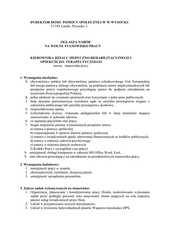 DYREKTOR DOMU POMOCY SPOŁECZNEJ W W WYSOCKU 37-543 Laszki, Wysocko 2 OGŁASZA NABÓR NA WOLNE STANOWISKO PRACY KIEROWNIKA DZIAŁU MEDYCZNO-REHABILITACYJNEGO I OPIEKUŃCZO- TERAPEUTYCZNEGO nazwa stanowiska pracy 1. Wymagania niezbędne: 1. obywatelstwo polskie lub obywatelstwo państwa członkowskiego Unii Europejskiej lub innego państwa, którego obywatelom, na podstawie umów międzynarodowych lub przepisów prawa wspólnotowego przysługuje prawo do podjęcia zatrudnienia na terytorium Rzeczypospolitej Polskiej, 2. pełna zdolność do czynności prawnych oraz korzystanie z pełni praw publicznych, 3. brak skazania prawomocnym wyrokiem sądu za umyślne przestępstwo ścigane z oskarżenia publicznego lub umyślne przestępstwo skarbowe, 4. nieposzlakowana opinia, 5. wykształcenie wyższe, wskazane pielęgniarskie lub w innej dziedzinie mającej zastosowanie w ochronie zdrowia 6. co najmniej pięcioletni staż pracy, 7. biegła znajomość poniżej wymienionych przepisów prawa: a) ustawa o pomocy społecznej b) rozporządzenie w sprawie domów pomocy społecznej c) ustawa o świadczeniach opieki zdrowotnej finansowanych ze środków publicznych, d) ustawy o ochronie zdrowia psychicznego e) ustawy o ochronie danych osobowych f) Kodeks Pracy ( szczególnie czas pracy) 8. umiejętność obsługi komputera w zakresie MS Office Word, Exel, 9. stan zdrowia pozwalający na zatrudnienie na przedmiotowym stanowisku pracy, 2. Wymagania dodatkowe: 1. umiejętność pracy w zespole, 2. obowiązkowość, rzetelność, dyspozycyjność. 3. umiejętność zarządzania personelem 3. Zakres zadań wykonywanych na stanowisku: 1. Organizacja, planowanie i koordynowanie pracy Działu, kontrolowanie wykonania zadań przez podległy personel oraz inicjowanie zmian mających na celu poprawę jakości usług świadczonych przez Dom, 2. Udział w przyjmowaniu nowych mieszkańców, 3. Udział w tworzeniu Indywidualnych planów Wsparcia mieszkańca DPS, 4. Opracowanie potrzeb w zakresie zapewnienia właściwych zajęć usprawniających, w tym organizacja i nadzór nad zajęciami rehabilitacyjnymi, terapeutycznymi i kulturalno- oświatowymi, 5. Współpraca ze służbą zdrowia w zakresie profilaktyki zdrowotnej mieszkańców, a w szczególności przygotowywanie harmonogramu badań lekarskich i ich realizacja, 6. Prowadzenie programu komputerowego DOM- moduł medyczny oraz dokumentacji z zakresu profilaktyki i promocji zdrowia, 7. Udzielanie wsparcia mieszkańcom w sytuacjach trudnych i kryzysowych, 8. Dbanie o właściwy poziom opieki pielęgniarskiej i jakości świadczonych usług przez podległy personel na rzecz mieszkańców, 9. Czuwanie nad prawidłowym żywieniem mieszkańców w ramach obowiązujących norm poprzez udział w opracowaniu jadłospisów, 10. Planowanie właściwego rozmieszczenia personelu oraz prowadzenie ewidencji czasu pracy( grafiki) sporządzanie planów urlopu dla podległego personelu, 11. Organizowanie i inicjowanie szkoleń dla pracowników, 12. Nadzór i kontrola nad właściwym stanem sanitarno - epidemiologicznym w Domu a także dbanie o ład i porządek wokół Domu i współpraca w tym zakresie z Kierownikiem działu A/G 4. Informacja o warunkach pracy na stanowisku: 1. miejsce pracy - Dom Pomocy Społecznej w Wysocku 2. wymiar czasu pracy - pełny etat 3. praca na przedmiotowym stanowisku pracy nie jest narażona na występowanie uciążliwych i szkodliwych warunków pracy, 4. praca w godzinach: od poniedziałku do piątku: od 7ºº-15 ºº, 5. Informacja o wskaźniku zatrudnienia osób niepełnosprawnych Informacja, czy w miesiącu poprzedzającym datę upublicznienia ogłoszenia wskaźnik zatrudnienia osób niepełnosprawnych w jednostce, w rozumieniu przepisów o rehabilitacji zawodowej i społecznej oraz zatrudnianiu osób niepełnosprawnych, wynosi co najmniej 6% nie dotyczy 6. Wymagane dokumenty: podpisany własnoręcznie list motywacyjny, podpisany własnoręcznie życiorys - CV, wypełniony kwestionariusz osobowy dla osoby ubiegającej się o zatrudnienie, kopie dokumentów potwierdzających kwalifikacje zawodowe, wymagane do wykonywania oferowanej pracy, 5. kopie świadectw pracy z poprzednich miejsc pracy lub zaświadczenia potwierdzające okresy zatrudnienia, obejmujące okresy poprzedzające w roku kalendarzowym, w którym kandydat ubiega się o zatrudnienie, 6. osoba ubiegająca się o zatrudnienie może dodatkowo przedłożyć kopie dokumentów potwierdzających jej umiejętności i osiągnięcia zawodowe, świadectw pracy z poprzednich miejsc pracy lub zaświadczenia potwierdzające okresy zatrudnienia, obejmujące okresy pracy przypadające w innym roku kalendarzowym niż rok, w którym kandydat ubiega się o zatrudnienie oraz dokumenty stanowiące podstawę do korzystania ze szczególnych uprawnień w zakresie stosunku pracy, 7. referencje z poprzednich miejsc pracy, opinie ( jeżeli kandydat takie posiada), 1. 2. 3. 4. 8. oświadczenie kandydata o posiadaniu obywatelstwa polskiego, 9. kopie właściwych dokumentów potwierdzających znajomość języka polskiego( dotyczy obywateli Unii Europejskiej oraz obywateli innych państw, którym na podstawie umów międzynarodowych lub przepisów prawa wspólnotowego przysługuje prawo do podjęcia zatrudnienia na terytorium Rzeczypospolitej Polskiej zgodnie z art.11 ust.2 i ust.3 ustawy o pracownikach samorządowych), 10. oświadczenie kandydata o posiadania pełnej zdolności do czynności prawnych i korzystaniu z pełni praw publicznych, 11. oświadczenie kandydata o niekaralności za umyślne przestępstwo ścigane z oskarżenia publicznego lub umyślne przestępstwo skarbowe, 12. oświadczenie kandydata o braku przeciwwskazań zdrowotnych do podjęcia pracy na stanowisku objętym naborem, 13. oświadczenie kandydata o wyrażeniu zgody na przetwarzanie jego danych osobowych o treści: "Oświadczam, iż wyrażam zgodę na przetwarzanie moich danych osobowych, na zasadach określonych w ustawie z dnia 29 sierpni