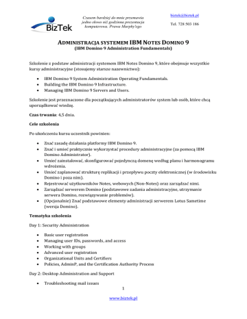 Czasem bardziej do mnie przemawia jedno s owo ni godzinna prezentacja komputerowa. Prawa Murphy'ego [email protected] Tel. 728 503 186 ADMINISTRACJA SYSTEMEM IBM NOTES DOMINO (IBM Domino Administration Fundamentals) Szkolenie podstaw administracji systemem IBM Notes Domino 9, które obejmuje wszystkie kursy administracyjne (stosujemy starsze nazewnictwo): IBM Domino System Administration Operating Fundamentals. Building the IBM Domino Infrastructure. Managing IBM Domino Servers and Users. Szkolenie jest przeznaczone dla pocz tkuj cych administratorów system lub osób, które chc uporz dkowa wiedz Czas trwania 4,5 dnia. Cele szkolenia Po uko czeniu kursu uczestnik powinien: Zna zasad dzia ania platformy IBM Domino 9. Zna umie praktycznie wykorzysta procedury administracyjne (za pomoc IBM Domino Administrator). Umie zainstalowa skonfigurowa pojedyncz domen wed ug planu harmonogramu wdro enia. Umie zaplanowa struktur replikacji przep ywu poczty elektronicznej (w rodowisku Domino poza nim). Rejestrowa ytkowników Notes, webowych (Non-Notes) oraz zarz dza nimi. Zarz dza serwerem Domino (podstawowe zadania administracyjne, utrzymanie serwera Domino, rozwi zywanie problemów). (Opcjonalnie) Zna podstawowe elementy administracji serwerem Lotus Sametime (wersja Domino). Tematyka szkolenia Day 1: Security Administration Basic user registration Managing user IDs, passwords, and access Working with groups Advanced user registration Organizational Units and Certifiers Policies, AdminP, and the Certification Authority Process Day 2: Desktop Administration and Support Troubleshooting mail issues www.biztek.pl Czasem bardziej do mnie przemawia jedno s owo ni godzinna prezentacja komputerowa. Prawa Murphy'ego Managing and monitoring mail performance Installing Notes clients Upgrade Day 3: Server Administration Server monitoring Server access controls Mail controls Replication and backup DAOS Day 4: Server Administration Transaction logging Database maintenance AdminP Server crash Server decommissioning Day 5: Domino Architect and Bootcamp Culminating Activity Naming schemes Server installation Day 5: Domino Architect and Bootcamp Culminating Activity Naming schemes Server installation Directories Traveler ID Vault Bootcamp culminating activity www.biztek.pl [email protected] Tel. 728 503 186