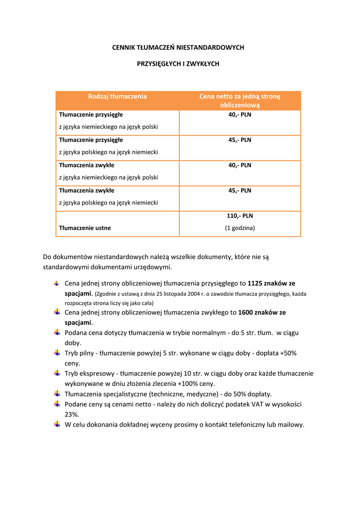 CENNIK TŁUMACZEO NIESTANDARDOWYCH PRZYSIĘGŁYCH I ZWYKŁYCH Rodzaj tłumaczenia Tłumaczenie przysięgłe Cena netto za jedną stronę obliczeniową 40,- PLN z języka niemieckiego na język polski Tłumaczenie przysięgłe 45,- PLN z języka polskiego na język niemiecki Tłumaczenia zwykłe 40,- PLN z języka niemieckiego na język polski Tłumaczenia zwykłe 45,- PLN z języka polskiego na język niemiecki 110,- PLN Tłumaczenie ustne (1 godzina) Do dokumentów niestandardowych należą wszelkie dokumenty, które nie są standardowymi dokumentami urzędowymi. Cena jednej strony obliczeniowej tłumaczenia przysięgłego to 1125 znaków ze spacjami. (Zgodnie z ustawą z dnia 25 listopada 2004 r. o zawodzie tłumacza przysięgłego, każda rozpoczęta strona liczy się jako cała) Cena jednej strony obliczeniowej tłumaczenia zwykłego to 1600 znaków ze spacjami. Podana cena dotyczy tłumaczenia w trybie normalnym - do 5 str. tłum. w ciągu doby. Tryb pilny - tłumaczenie powyżej 5 str. wykonane w ciągu doby - dopłata +50% ceny. Tryb ekspresowy - tłumaczenie powyżej 10 str. w ciągu doby oraz każde tłumaczenie wykonywane w dniu złożenia zlecenia +100% ceny. Tłumaczenia specjalistyczne (techniczne, medyczne) - do 50% dopłaty. Podane ceny są cenami netto - należy do nich doliczyd podatek VAT w wysokości 23%. W celu dokonania dokładnej wyceny prosimy o kontakt telefoniczny lub mailowy.