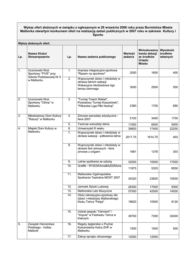 Wykaz ofert złożonych w związku z ogłoszonym w 29 września 2006 roku przez Burmistrza Miasta Malborka otwartym konkursem ofert na realizację zadań publicznych w 2007 roku w zakresie Kultury i Sportu Wykaz złożonych ofert: Lp. 1. 2. Nazwa Klubu/ Stowarzyszenia Uczniowski Klub Sportowy "FIVE" przy Szkole Podstawowej Nr 5 w Malborku Wartość zadania Wnioskowana Wysokość kwota dotacji środków ze środków własnych Urzędu Miasta Lp. Nazwa zadania publicznego 1. Impreza integracyjno-sportowa "Razem na sportowo" 2000 1600 400 2. Wypoczynek dzieci i młodzieży w okresie letnich wakacji Wakacyjna młodzieżowa liga tenisa ziemnego 3000 2500 500 "Turniej Trzech Rakiet", Powiatowy Turniej Koszykówki", "Piłkarska Liga Piłki Nożnej" 2380 1700 680 5100 3400 1700 Uczniowski Klub Sportowy "Olimp" w Malborku 3. 3. Młodzieżowy Dom Kultury "Ratusz" w Malborku 4. Zimowe warsztaty artystyczne ferie 2007 4. Miejski Dom Kultury w Malborku 5. 6. 7. Twórcze warsztaty letnie Uniwersytet III wieku Wypoczynek dzieci i młodzieży w okresie wakacji - półkolonie letnie 11000 39600 6000 17400 5000 22200 2017,75 1614,75 403 Wypoczynek dzieci i młodzieży w okresie ferii zimowych - ferie zimowe z origami 1681 1378 303 32500 15500 17000 11875 5325 6550 34320 23820 10500 26300 57000 17000 42500 9300 14500 18620 10500 8120 39700 7300 32400 Regaty żeglarskie o Puchar Komendanta Hufca ZHP w Malborku 1500 1000 500 Zakup sprzętu obozowego 12000 12000 8. 9. 10. Letnie spotkania ze sztuką Graffiti - RYSOWAnieBAZGRAnie 11. Malborskie Ogólnopolskie Spotkania Teatralne MOST 2007 12. 13. 14. 15. 5. Związek Harcerstwa Polskiego - Hufiec Malbork 16. 17. Jarmark Sztuki Ludowej Malborskie Lato Muzyczne Obóz rekreacyjno-sportowy dla dzieci i młodzieży Malborskiego Klubu Tańca "Pasja" Udział zespołu "Uśmiech" i "Impuls" w Festiwalu Tańca w Kielcach 6. 7. Parafia Rzymskokatolicka p.w. Bł. 108 Męczenników Polskich w Malborku Szkoła Podstawowa Nr 2 w Malborku 18. Harcerska Akcja letnia zgrupowania obozów 19. 20. 21. 78000 78000 Gra terenowa "Drugi brzeg" Andrzejkowy biwak drużyn Festiwal Piosenki "SATYRYKON" 700 1500 500 1000 200 500 1500 1000 500 22. 23. Biwak drużyn harcerskich XXIII Harcerski Rajd Turystyczny "Rodło" 3600 3000 600 2500 1500 1000 24. Organizacja koncertu z okazji Dnia Papieskiego 9200 2000 7200 25. Oświata, kultura i sport Organziacja imprez rekreacyjnosporotwych (Festyn Parafialny) 16000 3600 12400 26. Wypoczynek letni dzieci i młodzieży 36000 4000 32000 27. Oświata, kultura i sport - Udział w Przeglądzie Piosenki Religijnej 15180 3200 11980 Miejski Turniej o Bezpieczeństwie Ruchu Drogowego dla szkół podstawowych i gimnazjalnych 1608 1200 408 Festyn środowiskowy pod hasłem "Baw się razem z nami" 4000 3000 1000 1200 1000 200 7500 5000 2500 70000 30000 40000 19000 13000 6000 84640 20000 64640 6500 3000 3500 20270 7000 13270 11300 3000 8300 28. 29. 30. 8. 9. 10. 11. 12. Zespół Charytatywny "Caritas" przy Parafii p.w. Miłosierdzia Bożego 31. Stowarzyszenie Piłki Ręcznej "POMEZANIA MALBORK" 32. Towarzystwo Krzewienia Kultury Fizycznej Ognisko "Miejskie" w Malborku Szkoła Podstawowa Nr 9 w Malborku MKS "TRIATHLON" w Malborku VI Powiatowy Konkurs Amatorskich Zespołów Teatralnych "Podaruj mi trochę słońca" Wypoczynek dzieci i młodzieży w okresie letnich wakacji Udział i organizacja rozgrywek II ligi pilki ręcznej mężczyzn, szkolenie młodzieży przygotowanie drużyn młodzieżowych do rozgrywek na sezon 2007/2008 33. 34. "Sport dla wszystkich" Studio Rekreacji Ruchowej 35. Organizacja festynu szkolnego "Kazimierki" w Szkole Podstawowej nr 9 w Malborku z okazji 550 rocznicy wjazdu Kazimierza Jagiellończyka do Malborka 36. Organizacja VII Malbork Triathlon 37. Wypoczynek dzieci i młodzieży w okresie letnich wakacji 13. 14. 15. 16. 17. 18. 19. Zespół Szkół Nr 1 w Malborku 38. Polski Związek Wędkarski Okręg Elbląg Koło Malbork 39. Uczniowski Międzyszkolny Klub Sportowy "Jurand" w Malborku, 40. Siatkarskie wakacje - obóz sportowy 41. Przygotowanie i udział w rozgrywkach p.siatkowej na szczeblu wojewódzkim, centralnym w kategorii KADET i JUNIOR Rzym.-Kat. PARAFIA św. Jana Chrzciciela w Malborku Festyn Rodzinny ze św. Janem 43. Konkurs plastyczny, wiedzy historycznej i zawody sportowe z racji Jubileuszu 50-lecia Zgromadzenia Księży Orionistów w Malborku Zespół Charytatywny CARITAS przy Parafii św. Jana Chrzciciela w Malborku 44. Malborskie Stowarzyszenie Abstynenckie "Tu i Teraz" w Malborku 45. Malborski Klub Sportowy "Nogat" w Malborku 46. Uczniowski Klub Sportowy "Orzeł" przy Gimnazjum Nr 3 w Malborku 2700 1100 1600 3321 2631 690 14850 5300 9550 71000 34600 36400 15000 12000 3000 15000 11500 3500 21840 11000 10840 5558 1550 4008 54940 19720 35220 Zawody wędkarskie 42. Wypoczynek dzieci i młodzieży w okresie letnich wakacji Rozwój sportu wśród dzieci i młodzieży IV Malborski Bieg Trzeźwości Wypoczynek dzieci i młodzieży w okresie letnich wakacji pod nazwą "Wakacje za jeden uśmiech - kolonia socjoterapeutyczna" 47. Rozwój sportu wśród dzieci i młodzieży 60000 60000 48. Wypoczynek dzieci i młodzieży podczas wakacji 14000 10000 49. Organizacja VII Malborskich Wyścigów Smoczych Łodzi 16000 16000 50. Organizacja Wyścigów Smoczych Łodzi z okazji "Oblężenia Malborka" 11000 11000 Organizacja XXXXIII Regat Kajakowych o Puchar Nogatu im. Józefa Wiatra 5200 3500 1700 51. 20. Organizacja imprez rekreacyjnosportowych (festyny) dla mieszkańców miasta 4000 52. Rozwój sportu wśród dzieci i młodzieży - turnieje sportowe 10000 5000 5000 53. Wypoczynek dzieci i młodzieży w okresie letnich wakacji - obóz sportowy 17160 8440 8720 54. 21. Parafia Rzymskokatolicka pw. Miłosierdzia Bożego w Malborku Organizacja imprez rekreacyjnosportowych dla mieszkańców miasta - Familijny Turniej (festyn) Piłki Siatkowej 3100 1750 1350 55. Rozwój sportu wśród dzieci i młodzieży - stroje sportowe 6150 4000 2150 56. Rozwój s
