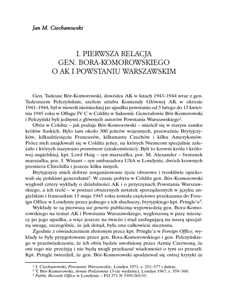 Jan M. Ciechanowski I. PIERWSZA RELACJA GEN. BORA-KOMOROWSKIEGO O AK I POWSTANIU WARSZAWSKIM Gen. Tadeusz Bór-Komorowski, dowódca AK w latach 1943–1944 wraz z gen. Tadeuszem Pełczyńskim, szefem sztabu Komendy Głównej AK w okresie 1941–1944, był w niewoli niemieckiej po upadku powstania od 5 lutego do 13 kwietnia 1945 roku w Oflagu IV C w Colditz w Saksonii. Generałowie Bór-Komorowski i Pełczyński byli jednymi z głównych autorów Powstania Warszawskiego1. Obóz w Colditz – jak podaje Bór-Komorowski – mieścił się w starym zamku królów Saskich. Było tam około 300 jeńców wojennych, przeważnie Brytyjczyków, kilkudziesięciu Francuzów, kilkunastu Czechów i kilku Amerykanów. Prócz nich znajdowali się w Colditz jeńcy, na których Niemcom specjalnie zależało i których nazywano prominent (znakomitości). Byli to krewni króla i królowej angielskiej, kpt. Lord Haig – syn marszałka, por. M. Alexander – bratanek marszałka, por. J. Winant – syn ambasadora USA w Londynie, dwóch krewnych premiera Chirchilla i jeszcze kilku innych. Brytyjczycy mieli dobrze zorganizowane życie obozowe i troskliwie opiekowali się polskimi generałami2. W czasie pobytu w Colditz gen. Bór-Komorowski wygłosił cztery wykłady o działalności AK i o przyczynach Powstania Warszawskiego, a ich treść – w postaci obszernych notatek sporządzonych w języku angielskim i francuskim 15 maja 1945 roku została częściowo przekazana do Foreign Office w Londynie przez jednego z ich słuchaczy, brytyjskiego kpt. Pringle’a3. Wykłady te są pierwszą sui generis publiczną wypowiedzią gen. Bora-Komorowskiego na temat AK i Powstania Warszawskiego, wygłoszoną w parę miesięcy po jego upadku, a więc jeszcze na świeżo i stąd zasługującą na naszą specjalną uwagę, szczególnie, że jak dotąd, była ona całkowicie nieznana. Zgodnie z oświadczeniem złożonym przez kpt. Pringle’a w Foreign Office, wykłady te były przygotowane przez gen. Bora-Komorowskiego i gen. Pełczyńskiego w przeświadczeniu, że ich obóz będzie uwolniony przez Armię Czerwoną, że oni tego nie przeżyją i nie będą mogli przekazać wiadomości o tym co przeszli. Kpt. Pringle twierdził, że gen. Bór-Komorowski spodziewał się ostrej krytyki ze 1 J. Ciechanowski, Powstanie Warszawskie, Londyn 1971, s. 251–377 i dalsze. T. Bór-Komorowski, Armia Podziemna (3-cie wydanie), Londyn 1967, s. 359–360. 3 Public Records Office w Londynie – FO 371 N 5395/265/55. 2 526 Dokumenty i materiały strony Rządu Polskiego w Londynie za wywołanie powstania, ale był gotów ją odpierać kontrzarzutem, że nie otrzymał od niego żadnych szczegółowych instrukcji przed rozpoczęciem się walki o Warszawę i musiał pobierać swoje decyzje na podstawie wiadomości uzyskanych z niemieckich i rosyjskich komunikatów4. I. WYKŁAD „Jesteśmy niezmiernie ujęci Panów zainteresowaniem naszą działalnością podziemną w Polsce oraz naszą bitwą o Warszawę. Z wielką przyjemnością postaramy się w ciągu paru godzin przedstawić Panom sytuację jaka panowała w Polsce i naszą walkę z okupantem. Całość ujęta będzie w trzech wykładach5. W pierwszym zapoznamy Panów z ogólną sytuacją jaka panowała w okupowanej Polsce, podamy zarys rozwoju ruchu podziemnego oraz jego strukturę organizacyjną i zaczniemy omawiać działalność AK. Temat ten rozwiniemy w drugim wykładzie. Trzeci wykład będzie dotyczył dwumiesięcznej walki w Warszawie jaką stoczyliśmy z Niemcami w sierpniu i wrześniu ubiegłego roku. Dla zachowania przejrzystości opuściłem z treści wykładów szereg problemów wymagających osobnego i szczegółowego rozwinięcia. Niemniej, gotów jestem udzielić Panom wszelkich dalszych wyjaśnień na ich pytania – które prosiłbym przedstawić mi na piśmie – w dodatkowym wykładzie. Nasza przegrana we wrześniu 1939 roku nie oznaczała, jak Panowie wiedzą, zaniechania oporu w kraju, a jedynie rozpoczęcie organizowania oporu podziemnego, co nie było łatwym zadaniem ze względu na warunki, w jakich przyszło nam działać. Ci z Panów, którzy znają niemieckie i rosyjskie metody działania, w pełni to pojmą. Kraj był podzielony na niemiecką i rosyjską strefę okupacyjną, a granica pomiędzy nimi pilnie strzeżona przez obie strony. Pomimo to, że większość z Panów wie już coś nie coś na temat warunków jakie panowały w okupowanej Polsce, pewne zasadnicze fakty warte są przypomnienia. Rosjanie w ich strefie stworzyli wielką maszynę propagandową, która pracowała na rzecz ZSRR, a której celem było zdobycie umysłów Polaków lub po prostu ich zastraszenie. Maszyna ta posługiwała się szeregiem środków: szeroko rozbudowaną prasą szermującą potokiem sloganów, radiem – głośnikami, kinem, teatrem i przymusowymi zebraniami. W rezultacie nikt nie mógł ujść spod jej zasięgu. Ludziom przywykłym do wolności myślenia trudno jest wprost zrozumieć na jakie to męki wystawiało tych, którzy byli jej poddani. Strefa ta włączona była do sowieckiego systemu gospodarczego, a własność prywatna została 4 Tamże; w sprawie instrukcji otrzymanych przez gen. Bora-Komorowskiego przed Powstaniem patrz: Ciechanowski, s. 339–376. Wykłady podaję według własnego tłumaczenia. Dziękuję też p. Janowi Korwin-Szymanowskiemu za pomoc przy tłumaczeniu notatek z ostatnich dwóch wykładów sporządzonych przez kpt. Pringle’a po francusku. Co pozwala przypuszczać, iż były one wygłoszone przez gen. Bora-Komorowskiego w tym języku. – JMC. 5 W istocie odbyły się cztery wykłady. Pierwsza relacja gen. Bora-Komorowskiego o AK i powstaniu warszawskim 527 zniesiona. Najniebezpieczniejszym zjawiskiem było jednak deportowanie około półtora miliona Polaków – głównie pochodzących z inteligencji – na Syberię, do Kazachstanu i północnej Rosji. W listopadzie 1939 na tych ziemiach został przeprowadzony plebiscyt, zgodnie z którym