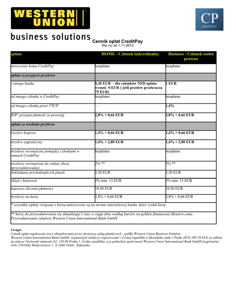 Cennik opłat CreditPay Wa ny od 1.11.2012 opłata utworzenie konta CreditPay HOME - Członek indywidualny bezpłatne Business - Członek osoba prawna bezpłatne opłata za przyjęcie przelewu z innego banku od innego członka w CreditPay od innego członka przez VTCP IDP: przyjęta płatność za prowizję 0,20 EUR - dla członków NFD opłata 1 EUR wynosi 0 EUR ( jeśli przelew przekracza 75 EUR) bezpłatne bezpłatne - 1,4% 2,8% + 0,66 EUR 2,8% + 0,66 EUR przelew krajowy 1,4% + 0,66 EUR 1,4% + 0,66 EUR przelew zagraniczny 1,4% + 2,80 EUR 1,4% + 2,80 EUR przelewy wewnętrzne pomiędzy członkami w ramach CreditPay bezpłatne bezpłatne przelewy wewnętrzne do waluty obcej (przewalutowanie) dohľadanie prichádzajúcich plateb 2% ** 2% ** 2.20 EUR 2.20 EUR vklad v hotovosti 5% min. 13 EUR 5% min. 13 EUR naprawa zlecenia płatności 10,50 EUR 10,50 EUR przelewy na kartę 2,8% + 0,66 EUR 2,8% + 0,66 EUR opłata za wysłanie przelewu * wszystkie opłaty związane z kartą umieszczone są na stronie internetowej banku, który wydał kartę ** kurzy do przewałutowania się aktualizują 3 razy w ciągu dnia według kurzów na gełdzie finansowej (Reuters.com). Przewałutowanie załatwia Western Union International Bank GmbH. Uwaga: Cennik opłat regulowany jest i aktualizowany przez dostawcę usług płatniczych - spółkę Western Union Business Solution. Western Union International Bank GmbH, organizační složka je registrovaná v Českej republike u Mestského súdu v Prahe (IČO 289 29 853) so sídlom na adrese Václavské námestie 62, 110 00 Praha 1, Česká republika, a je pobočkou spoločnosti Western Union International Bank GmbH (registrační číslo 256184t) Maderstrasse 1, A-1040 Vídeň , Rakousko Cennik opłat CreditPay Wa ny od 1.11.2012 opłata utworzenie konta CreditPay HOME - Członek indywidualny bezpłatne Business - Członek osoba prawna bezpłatne opłata za przyjęcie przelewu z innego banku od innego członka w CreditPay od innego członka przez VTCP IDP: przyjęta płatność za prowizję 5 CZK - dla członków NFD opłata wynosi 25 CZK 0 CZK ( jeśli przelew przekracza 2.000 CZK) bezpłatne bezpłatne - 1,4% 2,8% + 15,50 CZK 2,8% + 15,50 CZK przelew krajowy 1,4% + 15,50 CZK 1,4% + 15,50 CZK przelew zagraniczny 1,4% + 70 CZK 1,4% + 70 CZK przelewy wewnętrzne pomiędzy członkami w ramach CreditPay bezpłatne bezpłatne przelewy wewnętrzne do waluty obcej (przewalutowanie) dohľadanie prichádzajúcich plateb 2% ** 2% ** 50 CZK 50 CZK vklad v hotovosti 5% min. 300 CZK 5% min. 300 CZK naprawa zlecenia płatności 240 CZK 240 CZK przelewy na kartę 2,8% + 15,50 CZK 2,8% + 15,50 CZK opłata za wysłanie przelewu * wszystkie opłaty związane z kartą umieszczone są na stronie internetowej banku, który wydał kartę ** kurzy do przewałutowania się aktualizują 3 razy w ciągu dnia według kurzów na gełdzie finansowej (Reuters.com). Przewałutowanie załatwia Western Union International Bank GmbH. Uwaga: Cennik opłat regulowany jest i aktualizowany przez dostawcę usług płatniczych - spółkę Western Union Business Solution. Western Union International Bank GmbH, organizační složka je registrovaná v Českej republike u Mestského súdu v Prahe (IČO 289 29 853) so sídlom na adrese Václavské námestie 62, 110 00 Praha 1, Česká republika, a je pobočkou spoločnosti Western Union International Bank GmbH (registrační číslo 256184t) Maderstrasse 1, A-1040 Vídeň , Rakousko Cennik opłat CreditPay Wa ny od 1.11.2012 opłata utworzenie konta CreditPay HOME - Członek indywidualny bezpłatne Business - Członek osoba prawna bezpłatne opłata za przyjęcie przelewu z innego banku 1 PLN - dla członków NFD opłata wynosi 4 PLN 0 PLN ( jeśli przelew przekracza 300 PLN) od innego członka w CreditPay bezpłatne od innego członka przez VTCP IDP: przyjęta płatność za prowizję - bezpłatne 1,4% 2,8% + 2 PLN 2,8% + 2 PLN przelew krajowy 1,4% + 2,7 PLN 1,4% + 2,7 PLN przelew zagraniczny 1,4% + 15 PLN 1,4% + 15 PLN przelewy wewnętrzne pomiędzy członkami w ramach CreditPay bezpłatne bezpłatne przelewy wewnętrzne do waluty obcej (przewalutowanie) dohľadanie prichádzajúcich plateb 2% ** 2% ** 8,80 PLN 8,80 PLN vklad v hotovosti 5% min. 53 PLN 5% min. 53 PLN naprawa zlecenia płatności 42 PLN 42 PLN przelewy na kartę 2,8% + 2 PLN 2,8% + 2 PLN opłata za wysłanie przelewu * wszystkie opłaty związane z kartą umieszczone są na stronie internetowej banku, który wydał kartę ** kurzy do przewałutowania się aktualizują 3 razy w ciągu dnia według kurzów na gełdzie finansowej (Reuters.com). Przewałutowanie załatwia Western Union International Bank GmbH. Uwaga: Cennik opłat regulowany jest i aktualizowany przez dostawcę usług płatniczych - spółkę Western Union Business Solution. Western Union International Bank GmbH, organizační složka je registrovaná v Českej republike u Mestského súdu v Prahe (IČO 289 29 853) so sídlom na adrese Václavské námestie 62, 110 00 Praha 1, Česká republika, a je pobočkou spoločnosti Western Union International Bank GmbH (registrační číslo 256184t) Maderstrasse 1, A-1040 Vídeň , Rakousko Cennik opłat CreditPay Wa ny od 1.11.2012 opłata utworzenie konta CreditPay HOME - Członek indywidualny Business - Członek osoba prawna bezpłatne bezpłatne 0,30 USD - dla członków NFD opłata wynosi 0 USD (jeśli przelew przekracza 100 USD) bezpłatne 1,30 USD opłata za przyjęcie przelewu z innego banku od innego członka w CreditPay od innego członka przez VTCP IDP: przyjęta płatność za prowizję - bezpłatne 1,4% 2,8% + 1 USD 2,8% + 1 USD przelew krajowy 1,4% + 1 USD 1,4% + 1 USD przelew zagraniczny 1,4% + 3,60 USD 1,4% + 3,60 USD przelewy wewnętrzne pomiędzy członkami w ramach CreditPay bezpłatne bezpłatne przelewy wewnętrzne do waluty obcej (przewalutowanie) dohľadanie prichádzajúcich plateb 2% ** 2% ** 3 USD 3 USD vklad v hotovosti 5% min. 18 USD 5% min. 18 USD naprawa 