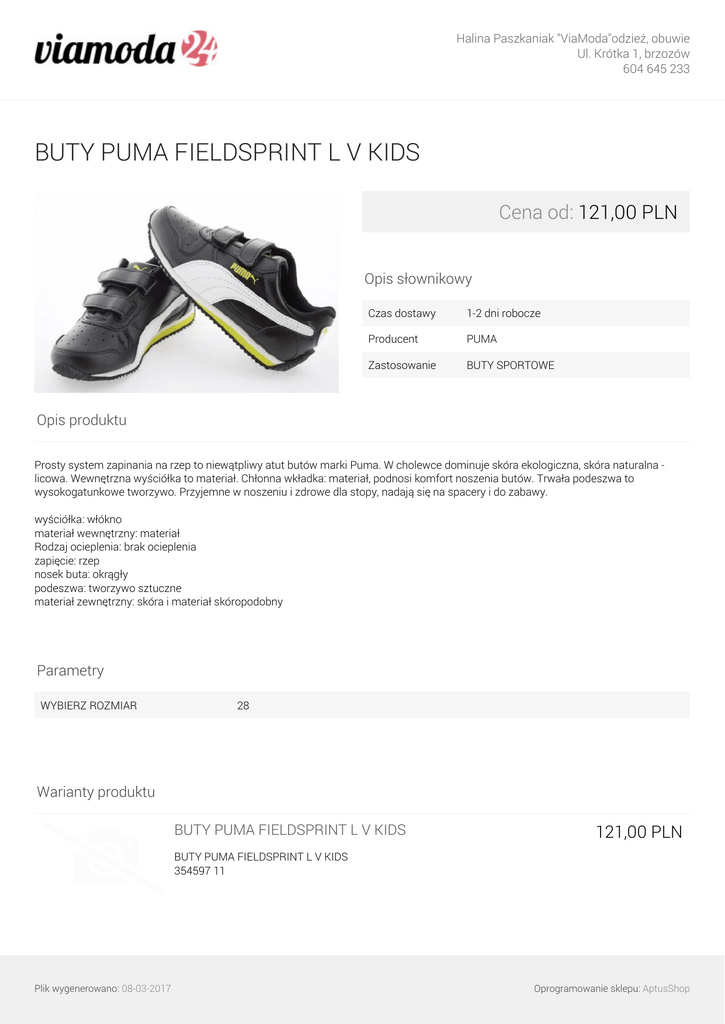 Halina Paszkaniak "ViaModa"odzież, obuwie Ul. Krótka 1, brzozów 604 645 233 BUTY PUMA FIELDSPRINT L V KIDS Cena od: 121,00 PLN Opis słownikowy Czas dostawy 1-2 dni robocze Producent PUMA Zastosowanie BUTY SPORTOWE Opis produktu Prosty system zapinania na rzep to niewątpliwy atut butów marki Puma. W cholewce dominuje skóra ekologiczna, skóra naturalna licowa. Wewnętrzna wyściółka to materiał. Chłonna wkładka: materiał, podnosi komfort noszenia butów. Trwała podeszwa to wysokogatunkowe tworzywo. Przyjemne w noszeniu i zdrowe dla stopy, nadają się na spacery i do zabawy. wyściółka: włókno materiał wewnętrzny: materiał Rodzaj ocieplenia: brak ocieplenia zapięcie: rzep nosek buta: okrągły podeszwa: tworzywo sztuczne materiał zewnętrzny: skóra i materiał skóropodobny Parametry WYBIERZ ROZMIAR 28 Warianty produktu BUTY PUMA FIELDSPRINT L V KIDS 121,00 PLN BUTY PUMA FIELDSPRINT L V KIDS 354597 11 Plik wygenerowano: 08-03-2017 Oprogramowanie sklepu: AptusShop Halina Paszkaniak "ViaModa"odzież, obuwie Ul. Krótka 1, brzozów 604 645 233 Galeria Plik wygenerowano: 08-03-2017 Powered by TCPDF (www.tcpdf.org) Oprogramowanie sklepu: AptusShop
