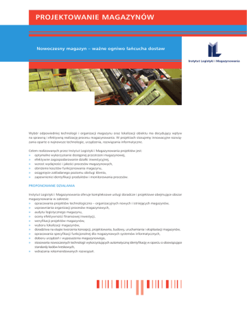 PROJEKTOWANIE MAGAZYNÓW Nowoczesny magazyn – ważne ogniwo łańcucha dostaw Wybór odpowiedniej technologii i organizacji magazynu oraz lokalizacji obiektu ma decydujący wpływ na sprawną i efektywną realizację procesu magazynowania. W projektach stosujemy innowacyjne rozwiązania oparte o najnowsze technologie, urządzenia, rozwiązania informatyczne. Celem realizowanych przez Instytut Logistyki i Magazynowania projektów jest: optymalne wykorzystanie dostępnej przestrzeni magazynowej, efektywne zagospodarowanie działki inwestycyjnej, wzrost wydajności i jakości procesów magazynowych, obniżenie kosztów funkcjonowania magazynu, osiągnięcie zakładanego poziomu obsługi klienta, zapewnienie identyfikacji produktów i monitorowania procesów. » » » » » » PROPONOWANE DZIAŁANIA Instytut Logistyki i Magazynowania oferuje kompleksowe usługi doradcze i projektowe obejmujące obszar magazynowania w zakresie: » opracowania projektów technologiczno – organizacyjnych nowych i istniejących magazynów, » usprawniania organizacji procesów magazynowych, » audytu logistycznego magazynu, » oceny efektywności finansowej inwestycji, » weryfikacji projektów magazynów, » wyboru lokalizacji magazynów, » doradztwa na etapie tworzenia koncepcji, projektowania, budowy, uruchamiania i eksploatacji magazynów, » opracowania specyfikacji funkcjonalnej dla magazynowych systemów informatycznych, » doboru urządzeń i wyposażenia magazynowego, » stosowania nowoczesnych technologii wykorzystujących automatyczną identyfikację w oparciu o obowiązujące standardy kodów kreskowych, » wdrażania rekomendowanych rozwiązań. PROJEKTOWANIE MAGAZYNÓW ZASTOSOWANIE Projektowanie nowych i usprawnianie istniejących systemów magazynowych dotyczy magazynów dowolnego przeznaczenia: » przemysłowych (surowców, półfabrykatów, opakowań, wyrobów gotowych, materiałów do utrzymania ruchu, itp), » dystrybucyjnych (handlowych), » przeładunkowych (cross-dockingowych), » dla dowolnych branż oraz różnych form własności. STOSOWANE NARZĘDZIA » » » » System generowania wariantowych rozwiązań technologiczno-organizacyjnych magazynów Metodyka oceny infrastruktury i organizacji procesów w magazynie Aplikacja oceny efektywności budowy magazynu Nowoczesne narzędzia informatyczne do wspomagania prac projektowych WYBRANE REFERENCJE » » » » » » » » » » » » » » » » » GlaxoSmithKline Pharmaceuticals S.A. DELPHI Automotive Systems Poland Sp. z o.o. Unilever Polska S.A. POLPAK - KARTON Sp. z o.o. WIX-FILTRON Sp. z o.o. Cukiernia Mistrza Jana Sp. z o.o. L’Oréal Polska Sp. z o.o NKT CABLES S.A PKN ORLEN S.A. Wydawnictwo Pedagogiczne OPERON Philips Lighting Poland S.A. Zakłady Chemiczne LUBOŃ Sp z o.o. Becker Acroma Polska Sp. z o.o. Zakłady Farmaceutyczne POLPHARMA S.A. DANMAG SERVICES Sp. z o.o. ANNEBERG TRANSPOL Sp. z o.o. Avon Operations Polska Sp. z o.o. Prace dostosowujemy do potrzeb naszych Klientów i realizujemy je przy ścisłej współpracy