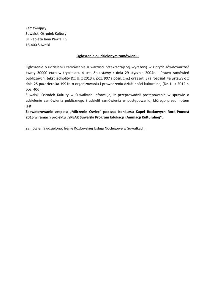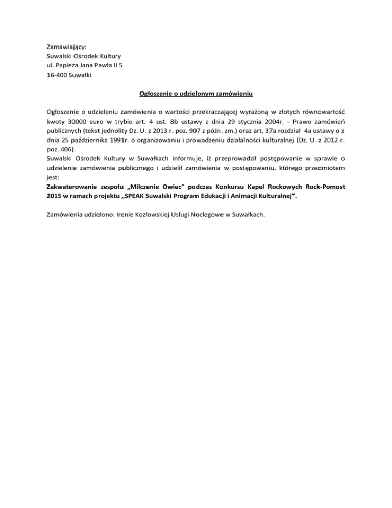 Zamawiający: Suwalski Ośrodek Kultury ul. Papieża Jana Pawła II 5 16-400 Suwałki Ogłoszenie o udzielonym zamówieniu Ogłoszenie o udzieleniu zamówienia o wartości przekraczającej wyrażoną w złotych równowartość kwoty 30000 euro w trybie art. 4 ust. 8b ustawy z dnia 29 stycznia 2004r. - Prawo zamówień publicznych (tekst jednolity Dz. U. z 2013 r. poz. 907 z późn. zm.) oraz art. 37a rozdział 4a ustawy o z dnia 25 października 1991r. o organizowaniu i prowadzeniu działalności kulturalnej (Dz. U. z 2012 r. poz. 406). Suwalski Ośrodek Kultury w Suwałkach informuje, iż przeprowadził postępowanie w sprawie o udzielenie zamówienia publicznego i udzielił zamówienia w postępowaniu, którego przedmiotem jest: Zakwaterowanie zespołu „Milczenie Owiec” podczas Konkursu Kapel Rockowych Rock-Pomost 2015 w ramach projektu „SPEAK Suwalski Program Edukacji i Animacji Kulturalnej”. Zamówienia udzielono: Irenie Kozłowskiej Usługi Noclegowe w Suwałkach.