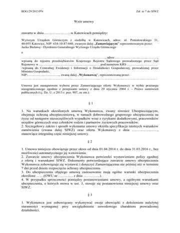 Zał. nr 7 do SIWZ BDG/29/2013/PN Wzór umowy zawarta w dniu…………………..w Katowicach pomiędzy: Wyższym Urzędem Górniczym z siedzibą w Katowicach, adres: ul. Poniatowskiego 31, 40-055 Katowice, NIP: 634-10-87-040, zwanym dalej „Zamawiającym” reprezentowanym przez: Jacka Bielawę - Dyrektora Generalnego Wyższego Urzędu Górniczego a ………………….…………………………………. ………….., adres:……………………...…………, wpisaną do rejestru przedsiębiorców Krajowego Rejestru Sądowego prowadzonego przez Sąd Rejonowy w ………………………………………….....… pod numerem KRS ………….…………… /wpisaną do Centralnej Ewidencji i Informacji o Działalności Gospodarczej, prowadzonej przez Ministra Gospodarki, NIP:……………………….., zwaną dalej „Wykonawcą”, reprezentowaną przez: …………………………………………………………………………………………………………… Umowa jest następstwem wyboru przez Zamawiającego oferty Wykonawcy w trybie przetargu nieograniczonego zgodnie z przepisami ustawy z dnia 29 stycznia 2004 r. - Prawo zamówień publicznych (t.j. Dz. U. z 2013 r. poz. 907, ze zm.). §1 1. Na warunkach określonych umową Wykonawca, zwany również Ubezpieczającym, obejmuje ochroną ubezpieczeniową, w ramach dobrowolnego grupowego ubezpieczenia na życie od następstw nieszczęśliwych wypadków wraz z ryzykami dodatkowymi, pracowników urzędów górniczych oraz członków rodzin i partnerów życiowych pracowników. 2. Szczegółowy zakres i sposób wykonania umowy określa specyfikacja istotnych warunków zamówienia (zwana dalej SIWZ) oraz oferta Wykonawcy z dnia …………………, stanowiące integralną część niniejszej umowy. §2 1. Umowa niniejsza obowiązuje przez okres od dnia 01.04.2014 r. do dnia 31.03.2016 r., bez możliwości automatycznego jej wznowienia. 2. Zawarcie umowy ubezpieczenia Wykonawca potwierdzi wystawieniem polisy zgodnej z ofertą i warunkami SIWZ. Dokumenty potwierdzające zawarcie umowy ubezpieczenia Wykonawca zobowiązuje się wystawić i doręczyć Zamawiającemu nie później niż w terminie 7 dni przed dniem rozpoczęcia ochrony ubezpieczenia. 3. Do ubezpieczenia objętego umową zastosowanie mają ogólne warunki ubezpieczenia określone ……(OWU nr ………… z dnia …………..). 4. W przypadku sprzeczności pomiędzy postanowieniami umowy, a ogólnymi warunkami ubezpieczenia, o których mowa w ust. 3, stosuje się postanowienia niniejszej umowy oraz SIWZ. §3 1. Wykonawca jest zobowiązany wykonywać swoje obowiązki z dołożeniem należytej staranności wymaganej przy uwzględnieniu zawodowego charakteru prowadzonej działalności. 2. Wykonawca jest zobowiązany, zarówno w czasie obowiązywania umowy, jak i po zakończeniu jej obowiązywania, do zachowania w tajemnicy wszelkich informacji związanych z jej przedmiotem. §4 1. Łączna wysokość składki z tytułu ubezpieczenia objętego przedmiotem umowy, zgodnie z ofertą Wykonawcy, wynosi …………… zł (słownie: …………………….). 2. Składka za ubezpieczenie będzie płatna w ratach miesięcznych z góry, przelewem na konto wskazane przez Wykonawcę, w terminie do 5-go dnia każdego miesiąca, za który jest należna. 3. Wysokość miesięcznej raty składki stanowi sumę wynikającą z przemnożenia liczby ubezpieczonych w danej grupie ubezpieczonych w miesiącu przez składkę miesięczną przypadającą od jednej osoby, tj.: w zakresie grupy I:……….zł. (słownie:……………), w zakresie grupy II:……….zł.(słownie:……………), w zakresie grupy III:……….zł. (słownie:……………), w zakresie grupy IV:……….zł. (słownie:……………). 4. W przypadku nieterminowego dokonania zapłaty Wykonawcy przysługują odsetki ustawowe. 5. Wysokość składki może ulec obniżeniu w przypadku zmniejszenia wartości przedmiotu ubezpieczenia. §5 1.Wykonawca zobowiązuje się do wypłaty świadczenia w terminie 30 dni, licząc od dnia otrzymania zawiadomienia o zajściu zdarzenia objętego zakresem umowy ubezpieczenia. 2. Gdy wyjaśnienie okoliczności koniecznych do ustalenia prawa do świadczenia lub jego wysokości okazało się niemożliwe w wyżej wymienionym terminie, Wykonawca wypłaci świadczenie w terminie 14 dni, licząc od dnia, w którym przy dochowaniu należytej staranności wyjaśnienie tych okoliczności było możliwe. §6 1. Osoba przystępująca do ubezpieczenia (zwana również Ubezpieczonym) składa deklarację przystąpienia, w której wyraża zgodę na potrącanie składek w określonej wysokości z wynagrodzenia za pracę oraz wyznacza osoby uposażone do wypłaty świadczenia, z prawem zmiany osób uposażonych w każdym czasie. 2. Ubezpieczony ma prawo w każdym czasie złożyć rezygnację z ubezpieczenia, składając pisemne oświadczenie Ubezpieczającemu o rezygnacji, które będzie skutkować końcem odpowiedzialności z upływem ostatniego dnia miesiąca, za jaki przekazano składkę. 3. Nowo przystępujący do umowy ubezpieczenia grupowego pracownicy Zamawiającego będą ubezpieczeni wg stawek i na warunkach określonych w SIWZ i ofercie. 4. Stawki ubezpieczenia nie podlegają zmianie w okresie obowiązywania umowy. 5. Wykonawca gwarantuje niezmienność oferty, bez względu na liczbę ubezpieczonych w czterech grupach ubezpieczenia. §7 1. Wykonawca będzie wykonywał zobowiązania wynikające z umowy ubezpieczenia za pośrednictwem sieci placówek na terenie całego kraju, z których co najmniej jedna 2 znajduje się w odległości od 35 km od siedziby Zamawiającego - siedziby Wyższego Urzędu Górniczego, tj. pod adresem:………………………………………………………………… 2.Wykonawca udostępni elektroniczną obsługę ubezpieczenia grupowego w terminie 30 dni od daty rozpoczęcia ochrony ubezpieczenia. 3. Osobami odpowiedzialn