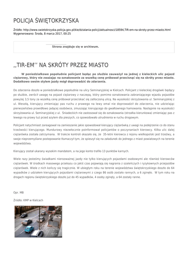 POLICJA ŚWIĘTOKRZYSKA Źródło: http://www.swietokrzyska.policja.gov.pl/kie/dzialania-policji/aktualnosci/18594,TIR-em-na-skroty-przez-miasto.html Wygenerowano: Środa, 8 marca 2017, 00:25 Strona znajduje się w archiwum. ,,TIR-EM’’ NA SKRÓTY PRZEZ MIASTO W poniedziałkowe popołudnie policjant będąc po służbie zauważył na jednej z kieleckich ulic pojazd ciężarowy, który nie zważając na oznakowanie za wszelką cenę próbował przecisnąć się na skróty przez miasto. Dodatkowo swoim stylem jazdy mógł doprowadzić do zdarzenia. Do zdarzenia doszło w poniedziałkowe popołudnie na ulicy Seminaryjskiej w Kielcach. Policjant z kieleckiej drogówki będący po służbie, zwrócił uwagę na pojazd ciężarowy z naczepą, który pomimo oznakowania zabraniającego wjazdu pojazdów powyżej 3,5 tony za wszelką cenę próbował przeciskać się zatłoczoną ulicą. Na wysokości skrzyżowania ul. Seminaryjskiej z ul. Wesołą, kierujący zmieniając pas ruchu z prawego na lewy omal nie doprowadził do zdarzenia, nie udzielając pierwszeństwa prawidłowo jadącej osobówce, zmuszając kierującego do gwałtownego hamowania. Następnie na wysokości skrzyżowania ul. Seminaryjskiej z ul. Śniadeckich nie zastosował się do oznakowania (strzałka kierunkowa) zmieniając pas z lewego na prawy tuż przed azylem dla pieszych, co spowodowało utrudnienia w ruchu drogowym. Policjant natychmiast zareagował na zamieszanie jakie spowodował kierujący ciężarówką z uwagi na podejrzenie co do stanu trzeźwości kierującego. Mundurowy niezwłocznie poinformował policjantów o poczynaniach kierowcy. Kilka ulic dalej ciężarówka została zatrzymana. W trakcie kontroli okazało się, że 35-letni kierowca z rejonu wielkopolski jest trzeźwy, a swoje nieprzemyślane postepowanie tłumaczył tym, że spieszył się na załadunek do jednego z miast powiatowych na terenie województwa. Kierujący został ukarany wysokim mandatem, a na jego konto trafiło 13 punktów karnych. Wiele razy jesteśmy świadkami nierozważnej jazdy nie tylko kierujących pojazdami osobowymi ale również kierowców ciężarówek. W środkach masowego przekazu co jakiś czas pojawiają się nagrania z szaleńczych i ryzykownych przejazdów ciężarówek. Wiele z nich kończy się tragicznie. W ubiegłym roku na terenie województwa świętokrzyskiego doszło do 64 wypadków z udziałem kierujących pojazdami ciężarowymi z czego 86 osób zostało rannych, a 6 zginęło. W tym roku na drogach regionu świętokrzyskiego doszło już do 45 wypadków, 4 osoby zginęły, a 64 zostały ranne. Opr. MB Źródło: KMP w Kielcach Film Zainstaluj wtyczkę Flash, aby zobaczyć odtwarzacz. pobierz film - 5.26 MB Ocena: 0/5 (0) Tweetnij