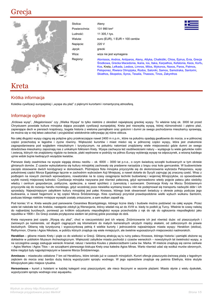 Grecja Stolica: Ateny Powierzchnia: 131 990 km² Ludność: 11 305,1 tys. Waluta: euro (EUR), 1 EUR = 100 centów Napięcie: 220 V Język: grecki Wiza: wiza nie jest wymagana Regiony: Alonissos, Andros, Antiparos, Ateny, Attyka, Chalkidiki, Chios, Epirus, Evia, Grecja Środkowa, Grecka Macedonia, Ikaria, Ios, Itaka, Karpathos, Kefalonia, Keos, Korfu, Kos, Kreta, Lefkada, Lesbos, Limnos, Milos, Mykonos, Naxos, Paros, Patmos, Peloponez, Riwiera Olimpijska, Rodos, Saloniki, Samos, Samotraka, Santorini, Skiathos, Skopelos, Syros, Tesalia, Thassos, Tinos, Zakynthos Kreta Krótka informacja Kolebka cywilizacji europejskiej i „wyspa stu plaż” z pięknymi kurortami i romantyczną atmosferą. Informacje ogólne „Królowa wysp”, „Megalonissos” czy „Wielka Wyspa” to tylko niektóre z określeń największej greckiej wyspy. To właśnie tutaj ok. 3000 lat przed Chrystusem powstała kultura minojska dająca początek cywilizacji europejskiej. Kreta jest niezwykłą wyspą, której różnorodność i piękno plaż, zapierające dech w piersiach krajobrazy, bogata historia z wieloma pamiątkami oraz gościnni i dumni ze swego pochodzenia mieszkańcy sprawiają, że można się w niej łatwo zakochać i przyjeżdżać wielokrotnie odkrywając jej różne oblicza. Na całej długości wyspy ciągną się potężne góry przekraczające nawet 2400 m n.p.m., które na południu opadają gwałtownie do morza, a w północnej części przechodzą w łagodne i żyzne równiny. Większość kurortów i miast mieści się w północnej części wyspy, która jest znakomicie zagospodarowana pod względem mieszkalnym i turystycznym, na południu natomiast znajdziemy wiele miejscowości gdzie dumni ze swego dziedzictwa mieszkańcy zapoznają nas z unikalnym folklorem Krety. Wyspa zachwyca też osobliwościami natury – występuje tu wiele gatunków roślin i zwierzą, których nie znajdziemy nigdzie na świecie, ptaki wędrowne w podróży na północ Europy wybierają wyspę na odpoczynek, a wiosną każdego ujmie widok bujnie kwitnących wszędzie kwiatów. Pierwsze ślady osadnictwa na wyspie sięgają okresu neolitu – ok. 6000 – 3000 lat p.n.e., o czym świadczą szczątki budowanych w tym okresie glinianych domów. Z czasów wykształcenia się kultury minojskiej zachowały się pradawne narzędzia z brązu oraz koła garncarskie. W budownictwie zaczęto stosowanie dwóch kondygnacji w domostwach. Późniejsza flota minojska przyczyniła się do skolonizowania wybrzeża Peloponezu, wysp południowej części Morza Egejskiego łącznie w zachodnim wybrzeżem Azji Mniejszej, a nawet dotarła do Sycylii zajmując jej znaczną cześć. Wraz z podbojem na nowych ziemiach wprowadzano, nowatorskie na te czasy osiągnięcia techniki budowlanej i wojennej Minojczyków, co spowodowało szybki rozwój miejscowej ludności. Cywilizacja minojska nazywana jest również pałacową, gdyż wprowadzono wtedy pojęcie pałacu jako siedziby władcy i centrum gospodarcze, polityczne, społeczne, a nawet spichlerz z żywnością i surowcami. Dominacja Krety na Morzu Śródziemnym przyczyniła się do rozwoju handlu morskiego, gdyż wcześniej poza niewielka wymianą towaru nikt nie podejmował się transportu nadwyżki dóbr i ich sprzedaży. Najważniejszym zabytkiem kultury minojskiej jest pałac Knossos, którego brak obwarowań świadczy o okresie pokoju podczas jego budowania, a nawet hegemonii w tej części Morza Śródziemnego. Kres cywilizacji przyniósł prawdopodobnie wielki wybuch wulkanu Santorini, podczas którego niektóre mniejsze wysepki zostały zniszczone, a sam wulkan zapadł się. Pod koniec VI w. Kreta weszła pod panowanie Cesarstwa Bizantyjskiego, którego liczne ślady i budowle można podziwiać na całej wyspie. Przez wiele lat należała też do Arabów, następnie zdobyli ją Wenecjanie, którzy władali nią aż do XVIII w. kiedy to podbili ją Turcy. Właśnie te czasy należą do najbardziej burzliwych, ponieważ po krótkim odzyskaniu niepodległości wyspa przechodziła z rąk do rąk do ogłoszenia niepodległości jako republika w 1908 r. Do Grecji została przyłączona siedem lat później gdzie pozostaje do dziś. Kreta nazywana jest często „Wyspą stu plaż”, choć w rzeczywistości jest ich więcej. Zróżnicowanie ich jest również duże: od piaszczystych i żwirowych po kamieniste, od długich ciągnących się kilometrami do małych kameralnych ukrytych między skałami, od zatłoczonych do prawie bezludnych. Główną rolę turystyczną i wypoczynkową pełnią 4 wielkie kurorty i jednocześnie najważniejsze miasta wyspy: Heraklion (stolica), Rethymnon, Chania i Agios Nikolaos, w pobliżu których znajduje się wiele mniejszych, ale świetnie wyposażonych miejscowości nadmorskich. Heraklion – główne miasto Krety i piąte co do wielkości w Grecji. Główną atrakcją są tu ruiny pałacu Knossos, którego historia i pamiątki złożone są dokładnie w pobliskim Muzeum Archeologicznym. Większość zabytków miasta pochodzi z czasów weneckich – nowożytnych lat świetności wyspy, a na szczególna uwagę zasługuje wenecki Arsenał, ratusz i twierdza Koules z płaskorzeźbami Lwów św. Marka. W mieście znajdują się cenne cerkwie – Agios Markos i Agios Titos – ze szczątkami pierwszego biskupa Krety oraz katedra Agios Minas. Warto również udać się wzdłuż murów obronnych, które niegdyś były najpotężniejszymi w basenie Morza Śródziemnego. Amnissos – miasteczko oddalone 7 km od Heraklionu, które istniało już w czasach minojskich. Kurort oferuje piaszczysto-żwirową plażę z łagodnym zejściem do morza oraz bardzo dużą ilością wypożyczalni sprzętu wodnego. W jego sąsiedztwie znajduje się jaskinia Eilethyia, która służyła Minojczykom jako miejsce rytualne. Hersonissos – kurort z hotelami w każdej kategorii oraz piaszczystymi, ale nieco tłocznymi w sezonie plażami. Miasto słynie z wielu dyskotek, wypożyczal
