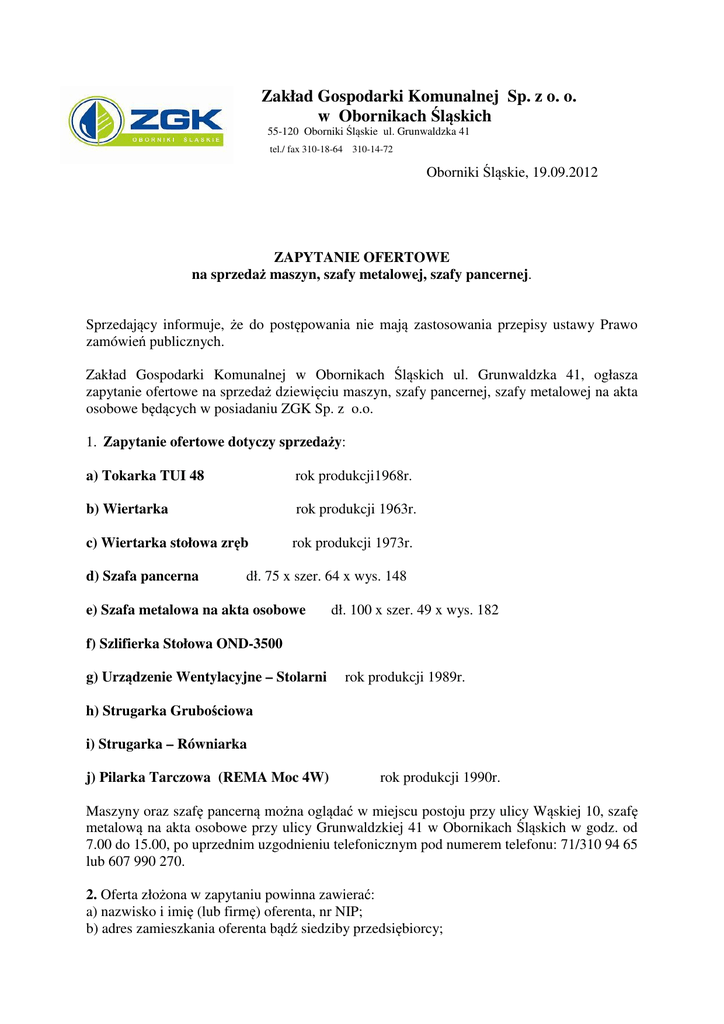 Zakład Gospodarki Komunalnej Sp. z o. o. w Obornikach Śląskich 55-120 Oborniki Śląskie ul. Grunwaldzka 41 tel./ fax 310-18-64 310-14-72 Oborniki Śląskie, 19.09.2012 ZAPYTANIE OFERTOWE na sprzedaż maszyn, szafy metalowej, szafy pancernej. Sprzedający informuje, że do postępowania nie mają zastosowania przepisy ustawy Prawo zamówień publicznych. Zakład Gospodarki Komunalnej w Obornikach Śląskich ul. Grunwaldzka 41, ogłasza zapytanie ofertowe na sprzedaż dziewięciu maszyn, szafy pancernej, szafy metalowej na akta osobowe będących w posiadaniu ZGK Sp. z o.o. 1. Zapytanie ofertowe dotyczy sprzedaży: a) Tokarka TUI 48 rok produkcji1968r. b) Wiertarka rok produkcji 1963r. c) Wiertarka stołowa zręb rok produkcji 1973r. d) Szafa pancerna dł. 75 x szer. 64 x wys. 148 e) Szafa metalowa na akta osobowe dł. 100 x szer. 49 x wys. 182 f) Szlifierka Stołowa OND-3500 g) Urządzenie Wentylacyjne – Stolarni rok produkcji 1989r. h) Strugarka Grubościowa i) Strugarka – Równiarka j) Pilarka Tarczowa (REMA Moc 4W) rok produkcji 1990r. Maszyny oraz szafę pancerną można oglądać w miejscu postoju przy ulicy Wąskiej 10, szafę metalową na akta osobowe przy ulicy Grunwaldzkiej 41 w Obornikach Śląskich w godz. od 7.00 do 15.00, po uprzednim uzgodnieniu telefonicznym pod numerem telefonu: 71/310 94 65 lub 607 990 270. 2. Oferta złożona w zapytaniu powinna zawierać: a) nazwisko i imię (lub firmę) oferenta, nr NIP; b) adres zamieszkania oferenta bądź siedziby przedsiębiorcy; c) cenę oferowaną za przedmiot przetargu; d) oświadczenie oferenta, że zapoznał się ze stanem technicznym przedmiotu zapytania ofertowego; 3. Ofertę, w zamkniętej kopercie z dopiskiem ,,Oferta kupna”, należy złożyć w siedzibie ZGK Sp. z o.o. ul. Grunwaldzka 41 do dnia 17 października 2012 do godziny 10:00. 4.Otwarcie ofert odbędzie się w dniu 18 października 2012r. o godzinie 12:00 w Biurze Zarządu ZGK ul. Grunwaldzka 41, Oborniki Śląskie. 5. Nabywcą zostaje oferent, który zaoferował najwyższą cenę spośród złożonych ofert. 6. W przypadku, gdy uczestnicy zapytania ofertowego zaoferują tę samą cenę, zostanie pomiędzy nimi przeprowadzona licytacja, o terminie której zostaną powiadomieni osobnym pismem. 7. Nabywca odbiera zakupiony przedmiot z miejsca postoju na własny koszt. Z góry dziękujemy za złożenie oferty. Oborniki Śląskie, dnia 19.09.2012r. Oborniki Śląskie, dnia………………. OŚWIADCZENIE Ja niżej podpisany oświadczam, że zapoznałem się z warunkami zapytania ofertowego z dnia 19.09.2012 r. na sprzedaż maszyn, szafy metalowej, szafy pancernej będących w posiadaniu ZGK Sp. z o.o. Akceptuję warunki udziału w postępowaniu oraz po zapoznaniu się za stanem technicznym wyżej wymienionych przedmiotów składam ofertę kupna ………………………