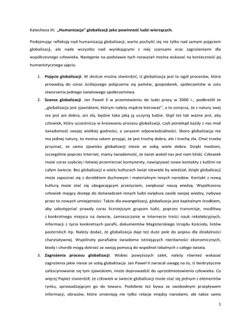 Katecheza III: „Humanizacja” globalizacji jako powinnośd ludzi wierzących. Podejmując refleksję nad humanizacją globalizacji, warto pochylid się nie tylko nad samym pojęciem globalizacji, ale nade wszystko nad wynikającymi z niej szansami oraz zagrożeniami dla współczesnego człowieka. Następnie na podstawie tych rozważao można wskazad na koniecznośd jej humanistycznego ujęcia. 1. Pojęcie globalizacji. W skrócie można stwierdzid, iż globalizacja jest to ogół procesów, które prowadzą do coraz ściślejszego połączenia się paostw, gospodarek, społeczeostw w celu stworzenia jednego światowego społeczeostwa. 2. Szanse globalizacji. Jan Paweł II w przemówieniu do ludzi pracy w 2000 r., podkreślił że „globalizacja jest zjawiskiem, którym należy mądrze kierowad”, a to oznacza, że z natury swej nie jest ani dobra, ani zła, będzie taka jaką ją uczynią ludzie. Stąd też tak ważne jest, aby człowiek, który uczestniczy w kreowaniu procesu globalizacji, czyli poniekąd każdy z nas miał świadomośd swojej wielkiej godności, a zarazem odpowiedzialności. Skoro globalizacja nie ma jednej natury, to można zatem przyjąd, że jest trochę dobra, ale i trochę zła. Chod trzeba przyznad, że samo zjawisko globalizacji niesie ze sobą wiele dobra. Dzięki mediom, szczególnie poprzez Internet, mamy świadomośd, że świat wokół nas jest nam bliski. Człowiek może coraz szybciej i łatwiej przemierzad kontynenty, nawiązywad nowe kontakty z ludźmi na całym świecie. Bez globalizacji o wielu kulturach świat niewiele by wiedział, dzięki globalizacji może zapoznad się z dorobkiem duchowym i materialnym innych narodów. Kontakt z nową kulturą może stad się ubogacającym przeżyciem, zwiększad naszą wiedzę. Współczesny człowiek mający dostęp do doświadczeo innych ludzi zwiększa zasób swojej wiedzy, nabywa przez to nowych umiejętności. Także dla ewangelizacji, globalizacja jest kapitalnym środkiem, aby udostępniad prawdy coraz liczniejszym grupom ludzi, poprzez transmisje, modlitwy z konkretnego miejsca na świecie, zamieszczanie w Internecie treści nauk rekolekcyjnych, informacji z życia konkretnych parafii, dokumentów Magisterskiego Urzędu Kościoła, listów pasterskich itp. Należy dodad, że globalizacja daje też duże pole do popisu dla działalności charytatywnej. Wspólnoty parafialne świadome istniejących nierówności ekonomicznych, biedy i chorób mogą dotrzed ze swoją pomocą do wspólnot lokalnych z całego świata. 3. Zagrożenia procesu globalizacji. Wobec powyższych zalet, należy również wskazad zagrożenia jakie niesie ze sobą globalizacja. Jan Paweł II zwracał uwagę na to, iż bezkrytyczne zafascynowanie się tym zjawiskiem, może doprowadzid do uprzedmiotowienia człowieka. Co więcej Papież stwierdził, że człowiek w świecie globalizacji może stad się jednym z elementów rynku, sprowadzającym go do towaru. Podobnie też bywa ze swobodnym przepływem informacji, obrazów, które zmieniają nie tylko relacje między narodami, ale także samo 1 rozumienie świata, a to może powodowad, że człowiek gubi się w pojmowaniu wartości, które wcześniej traktował jako jedyne i najważniejsze. Media mają dziś ogromną siłę. Zamiast obiektywnie informowad o wydarzeniach, to właśnie owe wydarzenia są kształtowane tak, aby odpowiadały konkretnym mediom. Dziś wśród natłoku informacji, wielu różnych filozofii życia, człowiek zadaje sobie pytanie: co wybrad? Ta presja różnorodności może doprowadzid do oddalenia od poznania obiektywnej prawdy. Człowiek okresu globalizacji niejako błąka się po świecie, szuka nowych wrażeo i może przekornie odrzucid te prawdy, które ostatecznie są dla niego najważniejsze. Coraz trudniej współczesnemu człowiekowi zachowad swoją ludzką godnośd, a przez to trudniej jest mu dokonywad dojrzałych i mądrych decyzji. Dlatego też, tak ważne wydaje się byd apostolstwo okresu globalizacji, które powinno skupiad się na zgłębianiu rozumienia prawd wiary, np. dobra książka, czasopismo, kazanie katechizmowe, itp. 4. Koniecznośd „humanizacji” globalizacji. Pomimo ogromu dobra, jakie niesie ze sobą globalizacja, o którym wyżej była mowa, niebezpieczeostwo zagrożeo wydaje się byd większe, ponieważ dotyka człowieka nie tylko w wymiarze gospodarczym czy ekonomicznym, ale nade wszystko w wymiarze moralnym i duchowym. Wola człowieka w tym czasie staje przed zwielokrotnionym wyborem, na który ogromny wpływ ma reklama, zmieniona hierarchia wartości, zastąpiona żądzą pieniądza i łatwego życia. W tym chaosie i zgiełku, różnych sensacji czy plotek, trudno odnaleźd powołanie do świętości. Coraz trudniej zachowad swoją ludzką godnośd zarówno w myśleniu, jak i w zachowaniu. Toteż tak wymowne są słowa Jezusa: „beze Mnie nic uczynid nie możecie” (J15,5). Człowiek nie może sam kierowad własnym postępem, ponieważ nie może sam z siebie ustanowid prawdziwego humanizmu. Największą siłę w służbie rozwoju może dad jedynie humanizm chrześcijaoski, oparty na wielkiej godności człowieka, która uzdalnia go do miłości, do poznania prawdy, a także do pewnej dyspozycyjności wobec braci. Tylko z Jezusem postawionym w centrum życia społecznego, a więc także całego procesu globalizacji, może człowiek odnaleźd sens działania i poszukiwania dobra wszystkich. Człowiek zapatrzony w Jezusa może czynid ten świat bardziej ludzkim, opartym na miłości i wzajemnej solidarności, zaangażowanym na rzecz sprawiedliwości i rozwoju narodów. Każda próba narzucenia humanizmu wykluczającego Boga, stanie się humanizmem bezdusznie nieludzkim. 2