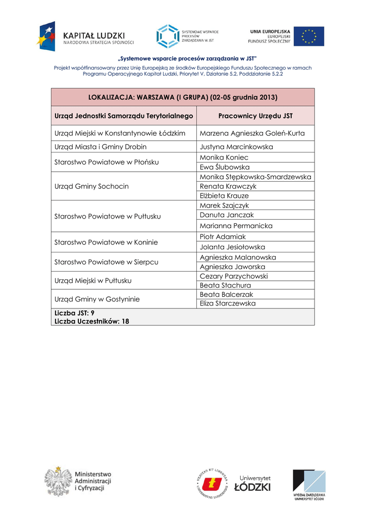 „Systemowe wsparcie procesów zarządzania w JST” Projekt współfinansowany przez Unię Europejską ze środków Europejskiego Funduszu Społecznego w ramach Programu Operacyjnego Kapitał Ludzki, Priorytet V, Działanie 5.2, Poddziałanie 5.2.2 LOKALIZACJA: WARSZAWA (I GRUPA) (02-05 grudnia 2013) Urząd Jednostki Samorządu Terytorialnego Pracownicy Urzędu JST Urząd Miejski w Konstantynowie Łódzkim Marzena Agnieszka Goleń-Kurta Urząd Miasta i Gminy Drobin Justyna Marcinkowska Starostwo Powiatowe w Płońsku Urząd Gminy Sochocin Starostwo Powiatowe w Pułtusku Monika Koniec Ewa Ślubowska Monika Stępkowska-Smardzewska Renata Krawczyk Elżbieta Krauze Marek Szajczyk Danuta Janczak Marianna Permanicka Starostwo Powiatowe w Koninie Starostwo Powiatowe w Sierpcu Urząd Miejski w Pułtusku Urząd Gminy w Gostyninie Liczba JST: 9 Liczba Uczestników: 18 Piotr Adamiak Jolanta Jesiołowska Agnieszka Malanowska Agnieszka Jaworska Cezary Parzychowski Beata Stachura Beata Balcerzak Eliza Starczewska „Systemowe wsparcie procesów zarządzania w JST” Projekt współfinansowany przez Unię Europejską ze środków Europejskiego Funduszu Społecznego w ramach Programu Operacyjnego Kapitał Ludzki, Priorytet V, Działanie 5.2, Poddziałanie 5.2.2 LOKALIZACJA: KRAKÓW (I GRUPA) (3-6 lutego 2014) Urząd Jednostki Samorządu Terytorialnego Urząd Gminy Mszana Dolna Urząd Gminy i Miasta Nowe Brzesko Urząd Marszałkowski Województwa Małopolskiego Urząd Gminy w Kozach Starostwo Powiatowe w Pszczynie Urząd Miejski w Jaworznie Urząd Gminy w Wiślicy Urząd Gminy Dzwola Urząd Miasta w Tychach Starostwo Powiatowe w Drawsku Pomorskim Liczba JST: 10 Liczba Uczestników: 21 Pracownicy Urzędu JST Magdalena Nawara Kinga Marcińska Jarosław Jurczak Agnieszka Sabina Walczak Agnieszka Monika Turalińska Mariola Bochenek Halina Renata Adamska Jędrzejczyk Dagmara Wdowicz Barbara Walewska Krystyna Kućka Urszula Gabriela Piesiur Szymon Damian Sekta Anna Swatek Łukasz Kolarczyk Mirosława Niedbała Jadwiga Flis Milena Bielecka Aneta Róża Gilas Paulina Boryczko-Wąsik Katarzyna Pytlarz Estera Madej „Systemowe wsparcie procesów zarządzania w JST” Projekt współfinansowany przez Unię Europejską ze środków Europejskiego Funduszu Społecznego w ramach Programu Operacyjnego Kapitał Ludzki, Priorytet V, Działanie 5.2, Poddziałanie 5.2.2 LOKALIZACJA: KATOWICE (03-06 marca 2014) Urząd Jednostki Samorządu Terytorialnego Urząd Miasta Radlin Urząd Miasta Rydułtowy Urząd Gminy Miedźno Starostwo Powiatowe w Bieruniu Urząd Gminy Czarny Bór Urząd Miejski w Gliwicach Urząd Miejski w Pyskowicach Starostwo Powiatowe w Wodzisławiu Śląskim Starostwo Powiatowe w Tarnowskich Górach Urząd Miasta Opola Urząd Gminy w Wiślicy Liczba JST: 11 Liczba Uczestników: 22 Pracownicy Urzędu JST Piotr Andrzej Absalon Bogumiła Jamrozik Krzysztof Jędrośka Jolanta Magnowska Katarzyna Joanna Jargon Justyna Janina Suchańska Piotr Derejczyk Aleksandra Wanda Bernaś Krystian Grzesica Ewa Hudzikowska Zbigniew Suchostawski Tomasz Gromala Joanna Beata Nowatkowska – Banaszak Aleksandra Agata Grzyb Edyta Nieczypor Piotr Denisiewicz Renata Jolanta Kościelak Agnieszka Bogacz Małgorzata Krawiec Ewa Lukosz Katarzyna Osiecka Jacek Paweł Balicki „Systemowe wsparcie procesów zarządzania w JST” Projekt współfinansowany przez Unię Europejską ze środków Europejskiego Funduszu Społecznego w ramach Programu Operacyjnego Kapitał Ludzki, Priorytet V, Działanie 5.2, Poddziałanie 5.2.2 LOKALIZACJA: POZNAŃ (14-17 kwietnia 2014) Urząd Jednostki Samorządu Terytorialnego Urząd Miejski w Babimoście Urząd Gminy w Święciechowie Urząd Miejski w Nowym Tomyślu Urząd Gminy w Kramsku Urząd Miejski Kościan Urząd Gminy Przemęt Urząd Miasta Luboń Urząd Miejski w Okonku Starostwo Powiatowe w Lubaniu Liczba JST: 9 Liczba Uczestników: 21 Pracownicy Urzędu JST Bernard Radny Zbigniew Woziński Patryk Tomczak Ewa Bagińska Maria Jolanta Ceglecka Sławomira Teresa Ksiąg-Górna Marlena Małgorzata Przedwojska Jolanta Warzych Maria Kordyl Łukasz Postaremczak Beata Tycner Beata Fornalik Jadwiga Beata Józefowska Beata Anna Ślebioda Janusz Frąckowiak Janusz Piasecki Ewa Zimowska Mieczysław Ryszard Rapta Dariusz Jan Rybak Małgorzata Anna Zahnd Marzena Sokulska-Tropiejko „Systemowe wsparcie procesów zarządzania w JST” Projekt współfinansowany przez Unię Europejską ze środków Europejskiego Funduszu Społecznego w ramach Programu Operacyjnego Kapitał Ludzki, Priorytet V, Działanie 5.2, Poddziałanie 5.2.2 LOKALIZACJA: SZCZECIN (23-26 czerwca 2014) Urząd Jednostki Samorządu Terytorialnego Pracownicy Urzędu JST Katarzyna Mintus-Trojan Jolanta Wilczyńska Urząd Miasta w Krośnie Odrzańskim Anna Maria Januszkiewicz Elżbieta Kozioł Urząd Miejski w Pełczycach Aneta Wolniak Urząd Miejski w Czaplinku Katarzyna Anna Szlońska Urząd Miasta w Szczecinku Joanna Gawrych Agnieszka Anna Kanderska Starostwo Powiatowe w Kołobrzegu Gabriela Okinczyc Lidia Konwa Starostwo Powiatowe w Drawsku Pomorskim Małgorzata Kraus Urząd Miejski w Cedyni Beata Lucyna Szóstakiewicz Jadwiga Teresa Michno Starostwo Powiatowe w Wałczu Zbigniew Jan Wolny Ewelina Mazurak-Januchowska Urząd Gminy Nowogródek Pomorski Kamila Bieniaszewska Liczba JST: 10 Liczba Uczestników: 16 Urząd Miejski w Słubicach „Systemowe wsparcie procesów zarządzania w JST” Projekt współfinansowany przez Unię Europejską ze środków Europejskiego Funduszu Społecznego w ramach Programu Operacyjnego Kapitał Ludzki, Priorytet V, Działanie 5.2, Poddziałanie 5.2.2 LOKALIZACJA: GDAŃSK (22-25 września 2014) Urząd Jednostki Samorządu Terytorialnego Urząd Gminy w Sadkach Pracownicy Urzędu JST Katarzyna Monika Łukaszczyk Mirela Darul Anna Ożóg Urząd Marszałkowski Województwa Kujawsko Pomorskiego w Toruniu Wiesława Anna Murawska Starostwo Powiatowe w Bydgoszczy Barbara Kalińska Urząd Gminy Słupsk Urząd Miejski w Czersk