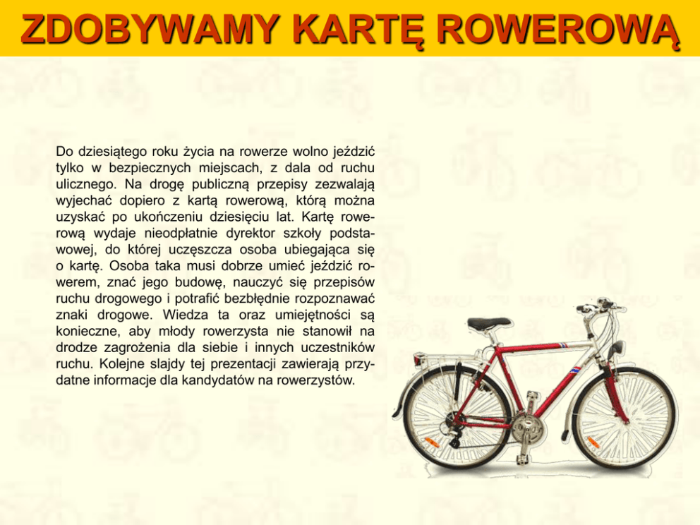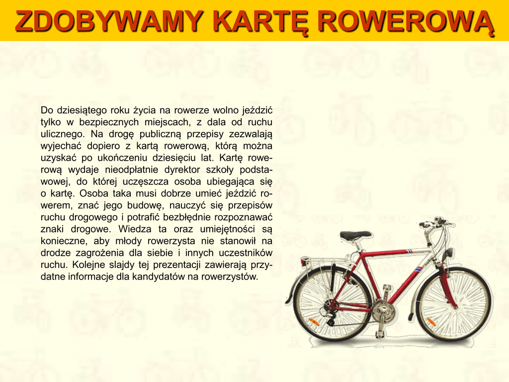 ZDOBYWAMY KARTĘ ROWEROWĄ Do dziesiątego roku życia na rowerze wolno jeździć tylko w bezpiecznych miejscach, z dala od ruchu ulicznego. Na drogę publiczną przepisy zezwalają wyjechać dopiero z kartą rowerową, którą można uzyskać po ukończeniu dziesięciu lat. Kartę rowerową wydaje nieodpłatnie dyrektor szkoły podstawowej, do której uczęszcza osoba ubiegająca się o kartę. Osoba taka musi dobrze umieć jeździć rowerem, znać jego budowę, nauczyć się przepisów ruchu drogowego i potrafić bezbłędnie rozpoznawać znaki drogowe. Wiedza ta oraz umiejętności są konieczne, aby młody rowerzysta nie stanowił na drodze zagrożenia dla siebie i innych uczestników ruchu. Kolejne slajdy tej prezentacji zawierają przydatne informacje dla kandydatów na rowerzystów. Podstawowe elementy budowy roweru kierownica siodełko światło tylne czerwone dzwonek światło przednie białe hamulec tylny hamulec przedni łańcuch Szkielet roweru stanowi rama. Do niej przytwierdzone są pozostałe elementy roweru, takie jak: kierownica, koła czy siodełko. Aby wprawić rower w ruch, niezbędny jest łańcuch rozpięty na kołach łańcuchowych. Każdy rower powinien być wyposażony w przynajmniej jeden sprawnie działający hamulec, dzwonek lub inny sygnał ostrzegawczy, jedno światło pozycyjne barwy białej lub żółtej (z przodu), jedno światło pozycyjne barwy czerwonej (z tyłu). Warto również zadbać o dodatkowe wyposażenie: bagażnik, pompkę, lusterko boczne, żółte światła odblaskowe umieszczone na szprychach i na pedałach, szybkościomierz, zestaw do naprawy ogumienia. Przyda się również kask, który chroni głowę w razie upadku. Przygotowanie roweru do jazdy Przed wyruszeniem w drogę należy najpierw przygotować rower tak, aby móc na nim wygodnie i bezpiecznie podróżować. Oto kilka praktycznych porad: Siodełko – jego wysokość powinna być taka, aby można by-ło, przy lekko ugiętej nodze, swobodnie oprzeć piętę na pedale, znajdującym się w najniższym położeniu. Kierownica – powinna być ustawiona na takiej wysokości, by opierając ręce na kierownicy, mieć lekko pochylony tułów. Przednie światło – nie może oślepiać tych, którzy jadą z przeciwnej strony, ale musi dobrze oświetlać drogę. Ogumienie – prawidłowo napompowana opona nie powinna się ugiąć pod wpływem nacisku więcej niż do jednej trzeciej jej wysokości. Łańcuch – powinien być zawsze czysty i odpowiednio napięty. Hamulce – należy sprawdzić ich sprawność. Znaki i sygnały w ruchu drogowym Znaki ostrzegawcze A-5 skrzyżowanie dróg A-7 ustąp pierwszeństwa A-10 przejazd kolejowy bez zapór A-14 roboty na drodze A-17 dzieci A-30 inne niebezpieczeństwo Znaki ostrzegawcze umieszczane są w tych miejscach na drodze, w których występuje lub może występować niebezpieczeństwo. Znaki te zobowiązują do zachowania szczególnej ostrożności. Na przykład znak drogowy Skrzyżowanie dróg ostrzega o skrzyżowaniu, na którym drogi są równorzędne pod względem pierwszeństwa przejazdu i gdzie stosuje się zasadę prawej ręki. Znak Ustąp pierwszeństwa ostrzega o zbliżaniu się do skrzyżowania, na którym należy ustąpić pierwszeństwa pojazdom jadącym drogą z pierwszeństwem przejazdu. Z kolei znak Roboty na drodze ostrzega o miejscu, w którym wykonywane są roboty drogowe. Znaki i sygnały w ruchu drogowym Znaki zakazu B-1 zakaz ruchu w obu kierunkach B-2 zakaz wjazdu B-9 zakaz wjazdu rowerów B-20 stop B-23 zakaz zawracania B-36 zakaz zatrzymywania się Znaki zakazu informują o zakazie ruchu bądź o jego ograniczeniach na określonym obszarze. Obowiązują one tylko na drodze, przy której są umieszczone. Na przykład znak Zakaz ruchu w obu kierunkach oznacza drogę zamkniętą dla ruchu drogowego w obu kierunkach. Znak Zakaz wjazdu zabrania wjazdu wszystkim pojazdom na drogę jednokierunkową lub dwukierunkową od strony jego umieszczenia, a znak Zakaz wjazdu rowerów – wjazdu na drogę rowerom. Znak Stop wskazuje, że kierujący pojazdem, dojeżdżając do skrzyżowania, musi się zatrzymać, zanim wjedzie na drogę z pierwszeństwem przejazdu. Znaki i sygnały w ruchu drogowym Znaki nakazu C-1 nakaz jazdy w prawo przed znakiem C-4 nakaz jazdy w lewo za znakiem C-5 nakaz jazdy prosto C-12 ruch okrężny C-13 droga dla rowerów C-16 droga dla pieszych Znaki nakazu wyrażają bezwzględne nakazy dla kierującego pojazdem. Wskazują, jak powinien się zachować w miejscu, do którego się zbliża. Należy pamiętać, że znaki nakazu jazdy w prawo lub w lewo są dwojakiego rodzaju: te z prostą strzałką nakazują skręcić przed znakiem, a te ze strzałką „wygiętą” pod kątem 95 stopni – za znakiem. Pozostałe znaki nie powinny już sprawiać żadnych trudności. Znak drogowy Nakaz jazdy prosto zabrania skręcania na skrzyżowaniu. Znak Ruch okrężny nakazuje jazdę dookoła wysepki. Znak Droga dla rowerów wskazuje drogę, z której zobowiązani są korzystać rowerzyści, a znak Droga dla pieszych – z której powinni korzystać piesi. Znaki i sygnały w ruchu drogowym Znaki informacyjne, kierunku i uzupełniające D-1 droga z pierwszeństwem D- 42 obszar zabudowany D- 3 droga jednokierunkowa D- 4a droga bez przejazdu E-13 tablica kierunkowa F-10 kierunki na pasach ruchu Znaki informacyjne mówią o sposobie jazdy lub o obiektach znajdujących się w pobliżu drogi. Na przykład znak Droga z pierwszeństwem informuje o wjeździe na drogę z pierwszeństwem przejazdu i oznacza, że kierujący ma pierwszeństwo przejazdu na skrzyżowaniach z innymi drogami. Z kolei znak Droga bez przejazdu informuje o wjeździe na drogę, która nie ma połączenia z inną drogą. Znaki kierunku ułatwiają wybór właściwej drogi i przedstawiają odległości do celu. Wskazują też drogi lub szlaki drogowe do poszczególnych miast, wsi, dzielnic czy innych obiektów. Znaki uzupełniające natomiast zawierają informacje u