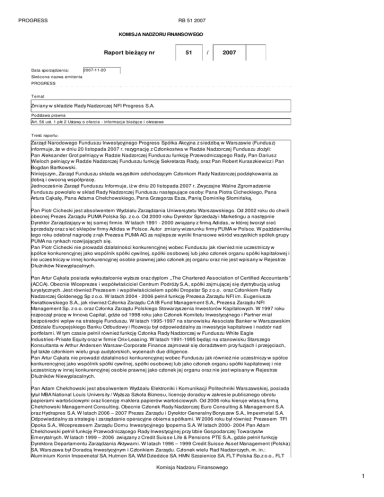 PROGRESS RB 51 2007 KOMISJA NADZORU FINANSOWEGO Raport bieżący nr Data sporządzenia: 51 / 2007 2007-11-20 Skrócona nazwa emitenta PROGRESS Temat Zmiany w składzie Rady Nadzorczej NFI Progress S.A. Podstawa prawna Art. 56 ust. 1 pkt 2 Ustawy o ofercie - informacje bieżące i okresowe Treść raportu: Zarząd Narodowego Funduszu Inwestycyjnego Progress Spółka Akcyjna z siedzibą w Warszawie (Fundusz) informuje, że w dniu 20 listopada 2007 r. rezygnację z Członkostwa w Radzie Nadzorczej Funduszu złożyli: Pan Aleksander Grot pełniący w Radzie Nadzorczej Funduszu funkcję Przewodniczącego Rady, Pan Dariusz Wieloch pełniący w Radzie Nadzorczej Funduszu funkcję Sekretarza Rady, oraz Pan Robert Kuraszkiewicz i Pan Bogdan Bartkowski. Niniejszym, Zarząd Funduszu składa wszystkim odchodzącym Członkom Rady Nadzorczej podziękowania za dobrą i owocną współpracę. Jednocześnie Zarząd Funduszu Informuje, iż w dniu 20 listopada 2007 r. Zwyczajne Walne Zgromadzenie Funduszu powołało w skład Rady Nadzorczej Funduszu następujące osoby: Pana Piotra Cicheckiego, Pana Artura Cąkałę, Pana Adama Chełchowskiego, Pana Grzegorza Esza, Panią Dominikę Słomińską. Pan Piotr Cichecki jest absolwentem Wydziału Zarządzania Uniwersytetu Warszawskiego. Od 2002 roku do chwili obecnej Prezes Zarządu PUMA Polska Sp. z o.o. Od 2000 roku Dyrektor Sprzedaży i Marketingu a następnie Dyrektor Zarządzający w tej samej firmie. W latach 1991 - 2000 związany z firmą Adidas, w której tworzył sieć sprzedaży oraz sieć sklepów firmy Adidas w Polsce. Autor zmiany wizerunku firmy PUMA w Polsce. W październiku tego roku odebrał nagrodę z rąk Prezesa PUMA AG za najlepsze wyniki finansowe wśród wszystkich spółek grupy PUMA na rynkach rozwijających się. Pan Piotr Cichecki nie prowadzi działalności konkurencyjnej wobec Funduszu jak również nie uczestniczy w spółce konkurencyjnej jako wspólnik spółki cywilnej, spółki osobowej lub jako członek organu spółki kapitałowej i nie uczestniczy w innej konkurencyjnej osobie prawnej jako członek jej organu oraz nie jest wpisany w Rejestrze Dłużników Niewypłacalnych. Pan Artur Cąkała posiada wykształcenie wyższe oraz dyplom ,,The Chartered Association of Certified Accountants” (ACCA). Obecnie Wiceprezes i współwłaściciel Centrum Podróży S.A., spółki zajmującej się dystrybucją usług turystycznych. Jest również Prezesem i współwłaścicielem spółki Dropstar Sp z o.o. oraz Członkiem Rady Nadzorczej Goldenegg Sp z o.o. W latach 2004 - 2006 pełnił funkcję Prezesa Zarządu NFI im. Eugeniusza Kwiatkowskiego S.A., jak również Członka Zarządu CA IB Fund Management S.A., Prezesa Zarządu NFI Management Sp. z o.o. oraz Członka Zarządu Polskiego Stowarzyszenia Inwestorów Kapitałowych. W 1997 roku rozpoczął pracę w Innova Capital, gdzie od 1998 roku jako Członek Komitetu Inwestycyjnego i Partner miał bezpośredni wpływ na strategię Funduszu. W latach 1995-1997 na stanowisku Associate Banker w Warszawskim Oddziale Europejskiego Banku Odbudowy i Rozwoju był odpowiedzialny za inwestycje kapitałowe i nadzór nad portfelami. W tym czasie pełnił również funkcję Członka Rady Nadzorczej w Funduszu White Eagle Industries-Private Equity oraz w firmie Orix-Leasing. W latach 1991-1995 będąc na stanowisku Starszego Konsultanta w Arthur Andersen Warsaw-Corporate Finance zajmował się doradztwem przy fuzjach i przejęciach, był także członkiem wielu grup audytorskich, wycenach due diligence. Pan Artur Cąkała nie prowadzi działalności konkurencyjnej wobec Funduszu jak również nie uczestniczy w spółce konkurencyjnej jako wspólnik spółki cywilnej, spółki osobowej lub jako członek organu spółki kapitałowej i nie uczestniczy w innej konkurencyjnej osobie prawnej jako członek jej organu oraz nie jest wpisany w Rejestrze Dłużników Niewypłacalnych. Pan Adam Chełchowski jest absolwentem Wydziału Elektroniki i Komunikacji Politechniki Warszawskiej, posiada tytuł MBA National Louis University / Wyższa Szkoła Biznesu, licencję doradcy w zakresie publicznego obrotu papierami wartościowymi oraz licencję maklera papierów wartościowych. Od 2006 roku kieruje własną firmą Chełchowski Management Consulting. Obecnie Członek Rady Nadzorczej Euro Consulting & Management S.A. oraz Hydrapres S.A. W latach 2006 – 2007 Prezes Zarządu i Dyrektor Generalny Boryszew S.A., Impexmetal S.A. Odpowiedzialny za strategię i zarządzanie operacyjne obiema spółkami. W 2006 roku był również Prezesem TFI Opoka S.A., Wiceprezesem Zarządu Domu Inwestycyjnego Ipopema S.A. W latach 2000- 2004 Pan Adam Chełchowski pełnił funkcję Przewodniczącego Rady Inwestycyjnej przy Izbie Gospodarczej Towarzystw Emerytalnych. W latach 1999 – 2006 związany z Credit Suisse Life & Pensions PTE S.A., gdzie pełnił funkcję Dyrektora Departamentu Zarządzania Aktywami. W latach 1996 – 1999 Credit Suisse Asset Management (Polska) SA, Warszawa był Doradcą Inwestycyjnym i Członkiem Zarządu. Członek wielu Rad Nadzorczych, m. in.: Aluminium Konin Impexmetal SA, Hutmen SA, WM Dziedzice SA, HMN Szopienice SA, FLT Polska Sp.z o.o., FLT Komisja Nadzoru Finansowego 1 PROGRESS RB 51 2007 Aluminium Konin Impexmetal SA, Hutmen SA, WM Dziedzice SA, HMN Szopienice SA, FLT Polska Sp.z o.o., FLT London Ltd.. Poza działalnością wymienioną powyżej, Pan Adam Chełchowski nie prowadzi działalności konkurencyjnej wobec Funduszu jak również nie uczestniczy w spółce konkurencyjnej jako wspólnik spółki cywilnej, spółki osobowej lub jako członek organu spółki kapitałowej i nie uczestniczy w innej konkurencyjnej osobie prawnej jako członek jej organu oraz nie jest wpisany w Rejestrze Dłużników Niewypłacalnych. Pan Grzegorz Esz jest absolwentem Wydziału Zarządzania Politechniki Warszawskiej, posiada również dyplom Executive MBA, London Business School w Londynie. Obecnie Wiceprezes PPWK S.A.
