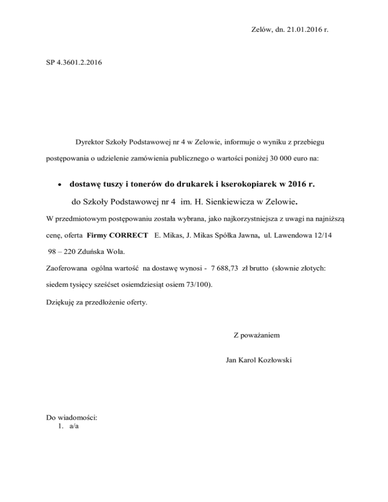 Zelów, dn. 21.01.2016 r. SP 4.3601.2.2016 Dyrektor Szkoły Podstawowej nr 4 w Zelowie, informuje o wyniku z przebiegu postępowania o udzielenie zamówienia publicznego o wartości poniżej 30 000 euro na: dostawę tuszy i tonerów do drukarek i kserokopiarek w 2016 r. do Szkoły Podstawowej nr 4 im. H. Sienkiewicza w Zelowie. W przedmiotowym postępowaniu została wybrana, jako najkorzystniejsza z uwagi na najniższą cenę, oferta Firmy CORRECT E. Mikas, J. Mikas Spółka Jawna, ul. Lawendowa 12/14 98 – 220 Zduńska Wola. Zaoferowana ogólna wartość na dostawę wynosi - 7 688,73 zł brutto (słownie złotych: siedem tysięcy sześćset osiemdziesiąt osiem 73/100). Dziękuję za przedłożenie oferty. Z poważaniem Jan Karol Kozłowski Do wiadomości: 1. a/a