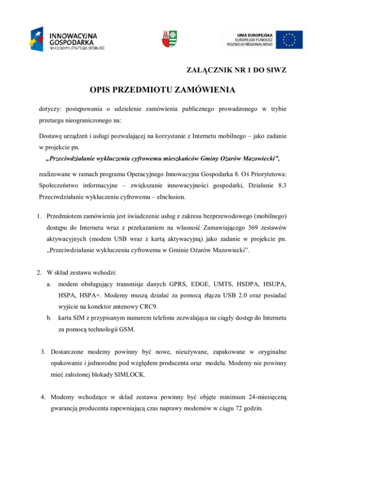ZAŁĄCZNIK NR 1 DO SIWZ OPIS PRZEDMIOTU ZAMÓWIENIA dotyczy: postępowania o udzielenie zamówienia publicznego prowadzonego w trybie przetargu nieograniczonego na: Dostawę urządzeń i usługi pozwalającej na korzystanie z Internetu mobilnego – jako zadanie w projekcie pn. „Przeciwdziałanie wykluczeniu cyfrowemu mieszkańców Gminy Ożarów Mazowiecki”, realizowane w ramach programu Operacyjnego Innowacyjna Gospodarka 8. Oś Priorytetowa: Społeczeństwo informacyjne – zwiększanie innowacyjności gospodarki, Działanie 8.3 Przeciwdziałanie wykluczeniu cyfrowemu – eInclusion. 1. Przedmiotem zamówienia jest świadczenie usług z zakresu bezprzewodowego (mobilnego) dostępu do Internetu wraz z przekazaniem na własność Zamawiającego 369 zestawów aktywacyjnych (modem USB wraz z kartą aktywacyjną) jako zadanie w projekcie pn. „Przeciwdziałanie wykluczeniu cyfrowemu w Gminie Ożarów Mazowiecki”. 2. W skład zestawu wchodzi: a. modem obsługujący transmisje danych GPRS, EDGE, UMTS, HSDPA, HSUPA, HSPA, HSPA+. Modemy muszą działać za pomocą złącza USB 2.0 oraz posiadać wyjście na konektor antenowy CRC9. b. karta SIM z przypisanym numerem telefonu zezwalająca na ciągły dostęp do Internetu za pomocą technologii GSM. 3. Dostarczone modemy powinny być nowe, nieużywane, zapakowane w oryginalne opakowanie i jednorodne pod względem producenta oraz modelu. Modemy nie powinny mieć założonej blokady SIMLOCK. 4. Modemy wchodzące w skład zestawu powinny być objęte minimum 24-miesięczną gwarancją producenta zapewniającą czas naprawy modemów w ciągu 72 godzin. 5. W razie niemożności spełnienia wymagań czasu naprawy przez Wykonawcę, Zamawiający dopuszcza możliwość dostarczenia przez Wykonawcę modemu zastępczego na czas naprawy przekraczający 72 godziny. 6. Dostarczona usługa powinna być świadczona nieprzerwanie, 24 godziny na dobę 7 dni w tygodniu, na terenie całej Gminy Ożarów Mazowiecki. 7. Wykonawca zapewni alarmowy kontakt z serwisem czynny 7 dni w tygodniu 24h na dobę. Komentarz [m1]: Mamy takie wymaganie w umowie. 8. Usługa musi być realizowana w technologii zapewniającej maksymalną, możliwą w danych warunkach, prędkość transferu danych, jednak nie mniejszą niż 2 Mbit/s. 9. Testy prędkości zaoferowanej usługi będą wykonywane za pomocą strony internetowej http://www.speedtest.pl/. Pomiary te będą traktowane jako wyznacznik spełniania przez Wykonawcę warunków określonych w punkcie 2.7 SIWZ. Usunięto: ¶ 10. W przypadku gdy dostarczony przez Wykonawcę zestaw nie będzie spełniał minimalnych wymagań transferu danych (test ze strony http://speedtest.pl wykaże poniżej 2Mbit/s) we wskazanej lokalizacji, Wykonawca zobowiązany jest bezpłatnie zapewnić wzmocnienie siły sygnału we wskazanej lokalizacji. Metodę wzmocnienia sygnału Wykonawca może wybrać samodzielnie. 11. Zamawiający dopuszcza ustalenie limitu danych pobierania z Internetu, jednak nie mniej niż na 10 GB miesięcznie. 12. Zamawiający wymaga, by po przekroczeniu limitu danych Internet działał nieprzerwanie, dopuszczając zmniejszenie jego prędkości poniżej wymaganej prędkości minimalnej. 13. Przekroczenie limitu danych nie będzie powodowało dla Zamawiającego dodatkowych kosztów. 14. Zamawiający wymaga, by umowa rozliczana była na podstawie miesięcznych cykli rozliczeniowych dla 369 aktywnych kart SIM zapewniających usługę mobilnego Internetu na terenie Gminy Ożarów Mazowiecki. 15. Zamawiający wymaga aby karty SIM udostępnione w ramach przedmiotowej umowy pozwalały wyłącznie na transmisję danych dla każdej z 369 kart SIM, które mają zapewniać dostęp do Internetu, z wykluczeniem innych usług, np. takich jak połączenia głosowe, wiadomości sms/mms, roaming międzynarodowy 16. Zamawiający nie wyraża zgody na zawarcie umów jednostkowych dla poszczególnych kart SIM. Umowa powinna zawierać wykaz wszystkich urządzeń i kart SIM przekazywanych Zamawiającemu. 17. Realizacja umowy obejmuje dostarczenie zgodnego z warunkami SIWZ, opakowanego w sposób trwały i zabezpieczony przed wpływem czynników atmosferycznych przedmiotu umowy do siedziby Zamawiającego, ul. Kolejowa 2 w Ożarowie Mazowieckim. Komentarz [m2]: Jest to konieczność aby BO nie spowodowali dodatkowych obciążeń na rachunku.
