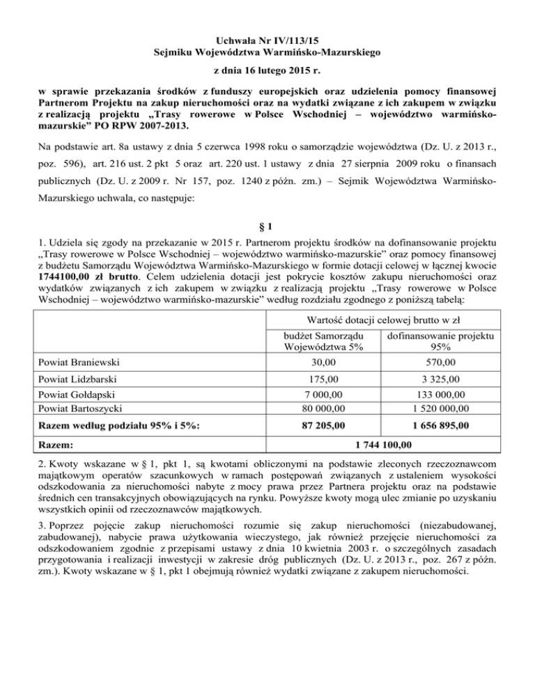 Uchwała Nr IV/113/15 Sejmiku Województwa Warmińsko-Mazurskiego z dnia 16 lutego 2015 r. w sprawie przekazania środków z funduszy europejskich oraz udzielenia pomocy finansowej Partnerom Projektu na zakup nieruchomości oraz na wydatki związane z ich zakupem w związku z realizacją projektu „Trasy rowerowe w Polsce Wschodniej – województwo warmińskomazurskie” PO RPW 2007-2013. Na podstawie art. 8a ustawy z dnia 5 czerwca 1998 roku o samorządzie województwa (Dz. U. z 2013 r., poz. 596), art. 216 ust. 2 pkt 5 oraz art. 220 ust. 1 ustawy z dnia 27 sierpnia 2009 roku o finansach publicznych (Dz. U. z 2009 r. Nr 157, poz. 1240 z późn. zm.) – Sejmik Województwa WarmińskoMazurskiego uchwala, co następuje: §1 1. Udziela się zgody na przekazanie w 2015 r. Partnerom projektu środków na dofinansowanie projektu „Trasy rowerowe w Polsce Wschodniej – województwo warmińsko-mazurskie” oraz pomocy finansowej z budżetu Samorządu Województwa Warmińsko-Mazurskiego w formie dotacji celowej w łącznej kwocie 1744100,00 zł brutto. Celem udzielenia dotacji jest pokrycie kosztów zakupu nieruchomości oraz wydatków związanych z ich zakupem w związku z realizacją projektu „Trasy rowerowe w Polsce Wschodniej – województwo warmińsko-mazurskie” według rozdziału zgodnego z poniższą tabelą: Wartość dotacji celowej brutto w zł budżet Samorządu Województwa 5% dofinansowanie projektu 95% Powiat Braniewski 30,00 570,00 Powiat Lidzbarski 175,00 3 325,00 Powiat Gołdapski Powiat Bartoszycki 7 000,00 80 000,00 133 000,00 1 520 000,00 Razem według podziału 95% i 5%: 87 205,00 1 656 895,00 Razem: 1 744 100,00 2. Kwoty wskazane w § 1, pkt 1, są kwotami obliczonymi na podstawie zleconych rzeczoznawcom majątkowym operatów szacunkowych w ramach postępowań związanych z ustaleniem wysokości odszkodowania za nieruchomości nabyte z mocy prawa przez Partnera projektu oraz na podstawie średnich cen transakcyjnych obowiązujących na rynku. Powyższe kwoty mogą ulec zmianie po uzyskaniu wszystkich opinii od rzeczoznawców majątkowych. 3. Poprzez pojęcie zakup nieruchomości rozumie się zakup nieruchomości (niezabudowanej, zabudowanej), nabycie prawa użytkowania wieczystego, jak również przejęcie nieruchomości za odszkodowaniem zgodnie z przepisami ustawy z dnia 10 kwietnia 2003 r. o szczególnych zasadach przygotowania i realizacji inwestycji w zakresie dróg publicznych (Dz. U. z 2013 r., poz. 267 z późn. zm.). Kwoty wskazane w § 1, pkt 1 obejmują również wydatki związane z zakupem nieruchomości. 4. W przypadku konieczności zwiększenia lub zmniejszenia wysokości przekazanych środków europejskich i pomocy finansowej, spowodowanej wyższymi lub niższymi kosztami zakupu nieruchomości oraz wydatkami związanymi z ich zakupem, odpowiednie środki zostaną przekazane Partnerom projektu z budżetu projektu „Trasy rowerowe w Polsce Wschodniej – województwo warmińsko-mazurskie” PO RPW 2007-2013, lub zwrócone przez Partnerów w przypadku niewykorzystania części przyznanej dotacji na rachunki bankowe Samorządu Województwa WarmińskoMazurskiego. W przypadku wystąpienia powyższej okoliczności, upoważnia się Zarząd Województwa Warmińsko-Mazurskiego do dokonywania zmian w wysokościach przyznanych dotacji celowych do wysokości kwoty łącznej wskazanej w § 1, pkt 1. 5. W przypadku wyczerpania się możliwości finansowania zakupu nieruchomości, w tym wydatków związanych z ich zakupem, z powodu wyczerpania się środków finansowych, upoważnia się Zarząd Województwa Warmińsko-Mazurskiego do wystąpienia do Instytucji Zarządzającej i Instytucji Pośredniczącej z wnioskiem o dodatkowe środki finansowe na dalszą realizację projektu, lub w przypadku odmówienia przyznania dodatkowych środków z funduszy UE lub Budżetu Państwa, do redukcji środków finansowych i pomocy finansowej przekazywanej dla poszczególnych Partnerów projektu, z możliwością odstąpienia od realizacji części inwestycji włącznie. §2 Przekazanie środków oraz pomoc finansowa, o której mowa w § 1, zostanie przeznaczona na zakup nieruchomości, w tym na wydatki związane z ich zakupem oraz na zabezpieczenie wkładu własnego JST, w postaci 5% wydatków kwalifikowalnych, w ramach realizacji Umowy nr POPW.05.02.00-28-001/1200 o dofinansowanie Projektu „Trasy rowerowe w Polsce Wschodniej – województwo warmińskomazurskie” Programu Operacyjnego Rozwój Polski Wschodniej 2007-2013, który finansowany jest w 85% z funduszy UE, 10 % ze środków Budżetu Państwa oraz 5% przez Samorząd Województwa Warmińsko-Mazurskiego. §3 Szczegółowe warunki udzielenia pomocy finansowej określone zostaną w umowach zawartych pomiędzy Województwem a poszczególnymi Partnerami Projektu wymienionymi w § 1. §4 Wykonanie uchwały powierza się Zarządowi Województwa Warmińsko-Mazurskiego. §5 Uchwała wchodzi w życie z dniem jej podjęcia. Przewodniczący Sejmiku Województwa Warmińsko-Mazurskiego Piotr Żuchowski
